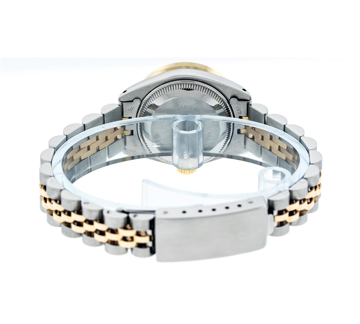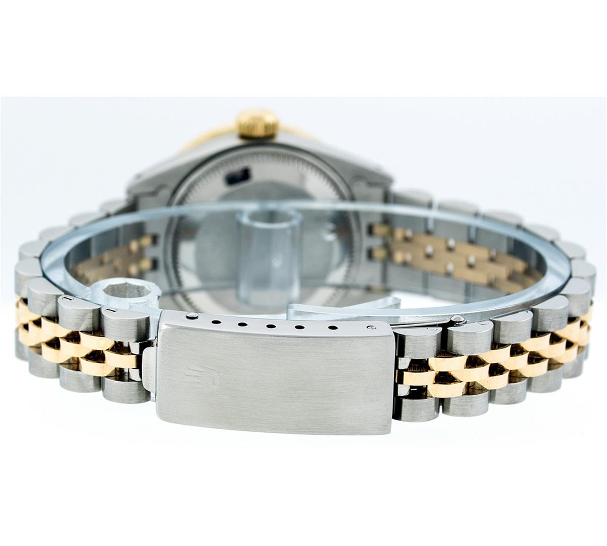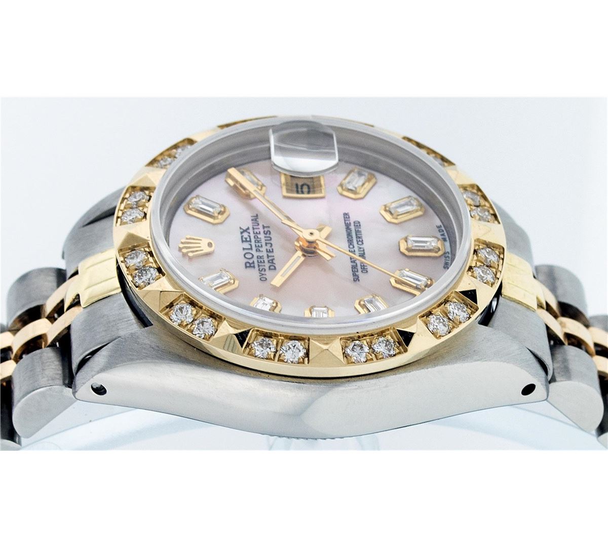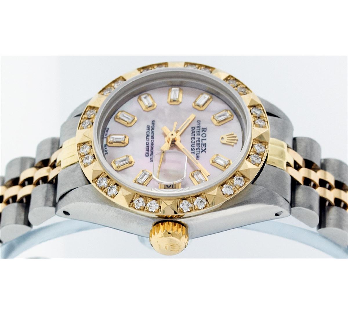 One Ladies Two Tone Rolex Datejust Polished, Serviced & Electronically Tested, 14K Yellow Gold & Stainless Steel Case:26mm, 14K Yellow Gold Crown, Custom Bezel: 18K Yellow Gold Pyramid Diamond Bezel, Diamond Count: 24 Diamonds Total Weight .70 Carat, Clarity: Si-VS, Color: G to H. Custom Crystal: Synthetic Sapphire Cyclops Lens. Movement: Automatic Winding Movement Caliber 2030. Custom Dial: Pink Mother Of Pearl Baguette Diamond Hour Markers. 10 Baguette Diamonds In Dial, Clarity: Si-VS, Color: G to H. Date Window: 3 O'Clock Position Date Display, Model: Datejust. Condition: G-6 Extra Fine. Bracelet: Two Tone 14K Yellow Gold & Stainless Steel Jubilee. Bright Polish. 6.0 Inch Length, Adjustable. Standard Clasp, With Rolex Logo.