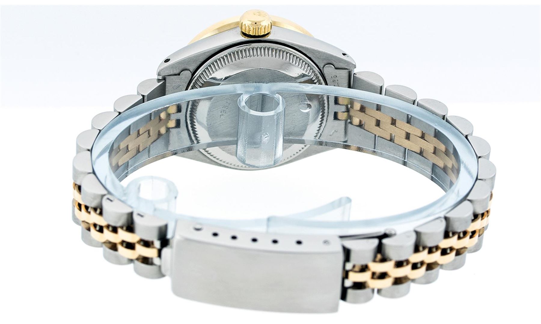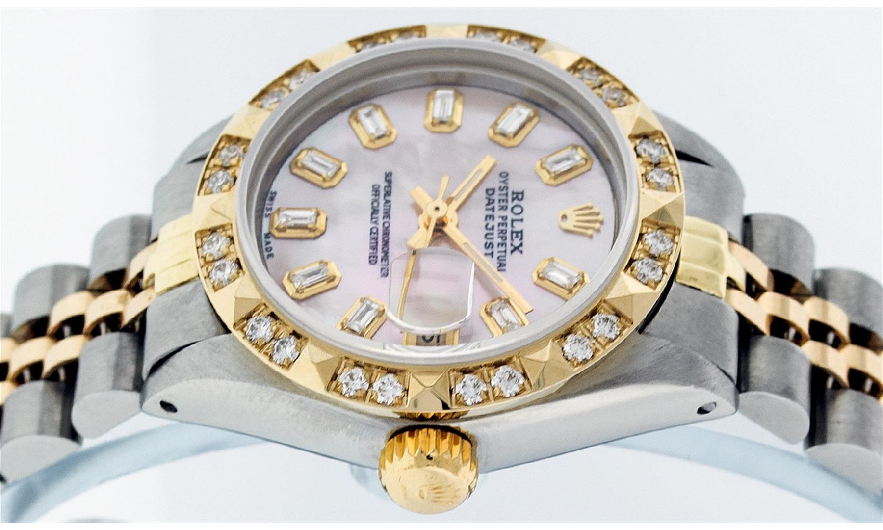 One Ladies Two Tone Rolex Datejust Polished, Serviced & Electronically Tested, 14K Yellow Gold & Stainless Steel Case:26mm, 14K Yellow Gold Crown, Custom Bezel: 18K Yellow Gold Pyramid Diamond Bezel, Diamond Count: 24 Diamonds Total Weight .70 Carat, Clarity: Si-VS, Color: G to H. Custom Crystal: Synthetic Sapphire Cyclops Lens. Movement: Automatic Winding Movement Caliber 2030. Custom Dial: Pink Mother Of Pearl Baguette Diamond Hour Markers. 10 Baguette Diamonds In Dial, Clarity: Si-VS, Color: G to H. Date Window: 3 O'Clock Position Date Display, Model: Datejust. Condition: G-6 Extra Fine. Bracelet: Two Tone 14K Yellow Gold & Stainless Steel Jubilee. Bright Polish. 6.0 Inch Length, Adjustable. Standard Clasp, With Rolex Logo.