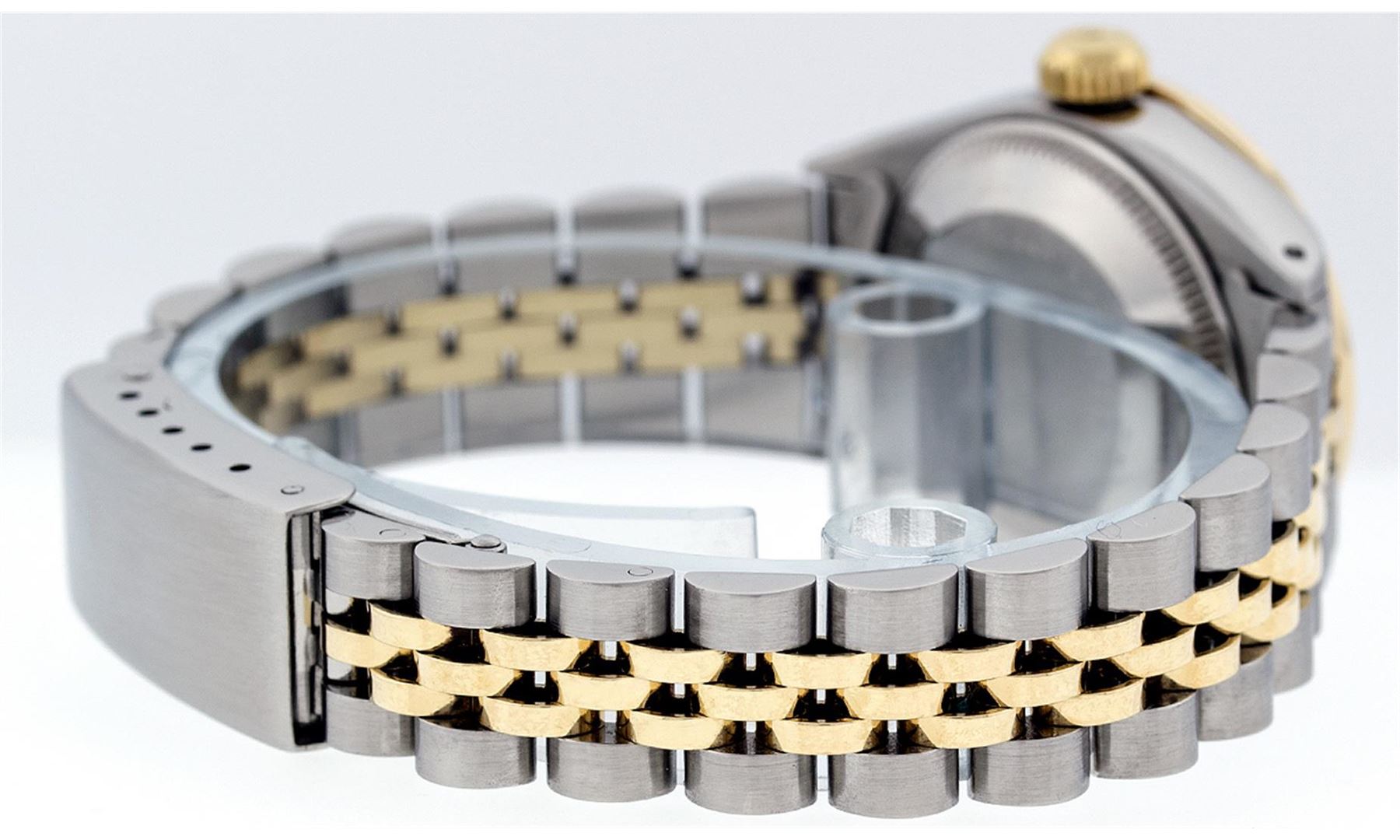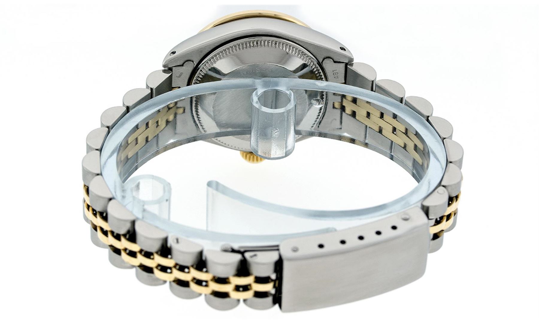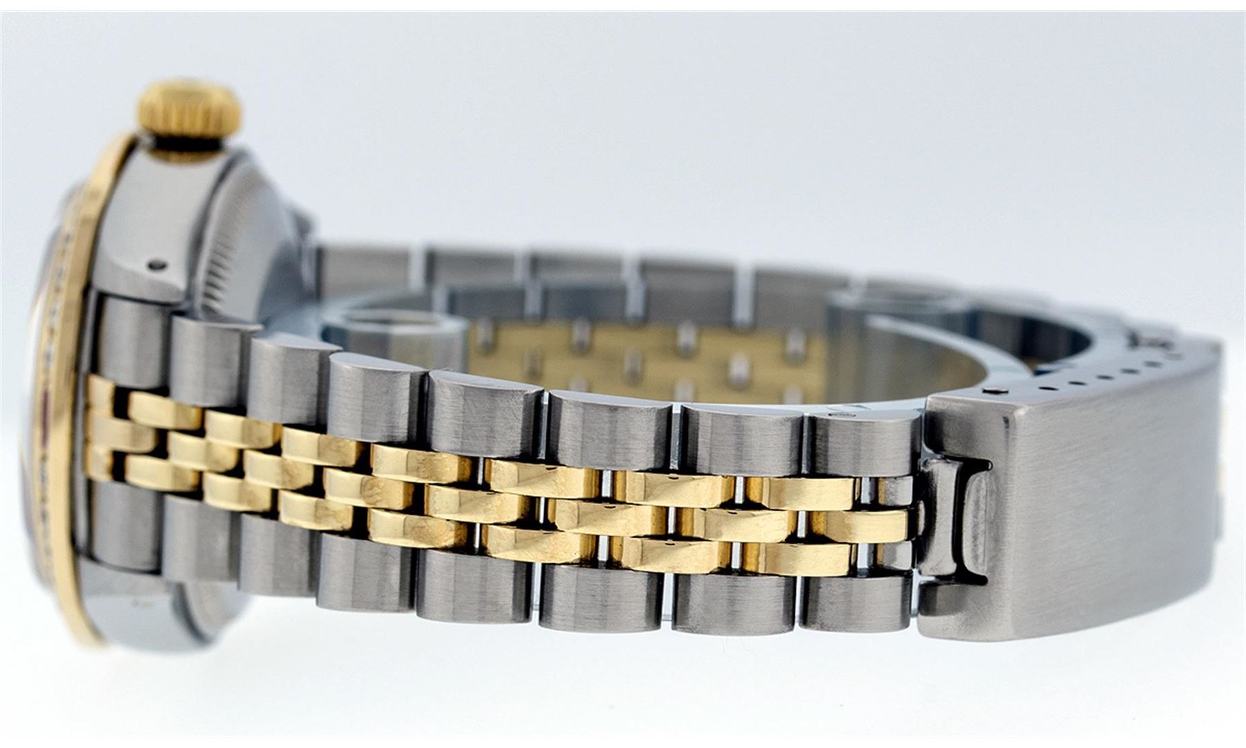 One Ladies Two Tone Rolex Datejust Polished, Serviced & Electronically Tested, 14K Yellow Gold & Stainless Steel Case:26mm, 14K Yellow Gold Crown, Custom Bezel: 18K Yellow Gold Ruby Beadset Diamond Bezel, Diamond Count: 28 Diamonds + 4 Rubies Total Weight .70 Carat, Clarity: Si-VS, Color: G to H. Custom Crystal: Synthetic Sapphire Cyclops Lens. Movement: Automatic Winding Movement Caliber 2030. Custom Dial: Dark Red Vignette With Diamond Hour Markers. Diamond Count: 10 Diamonds In Dial, Clarity:Si-VS, Color: G to H. Date Window: 3 O'Clock Position Date Display, Non Quickset, Model: Datejust. Condition: G-6 Extra Fine. Bracelet: Two Tone 14K Yellow Gold & Stainless Steel Jubilee. Bright Polish. 6.0 Inch Length, Adjustable. Standard Clasp, With Rolex Logo.