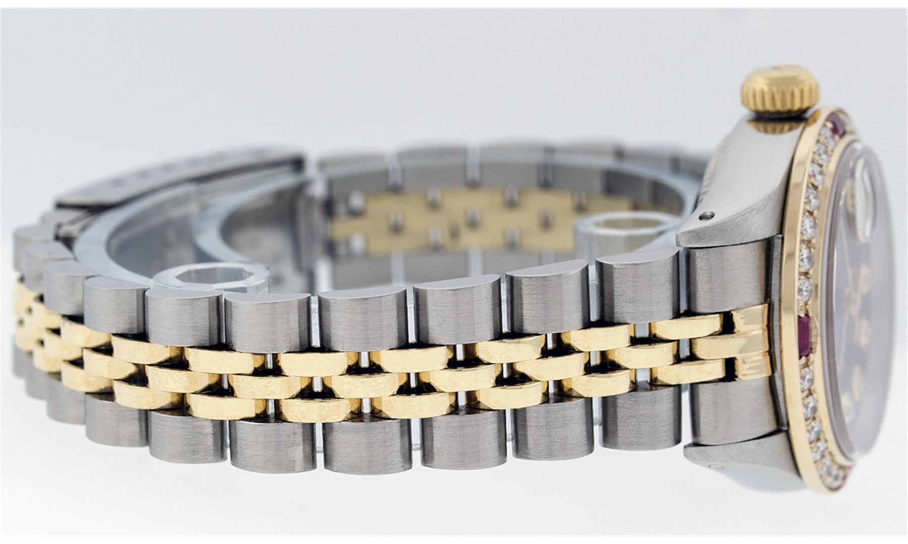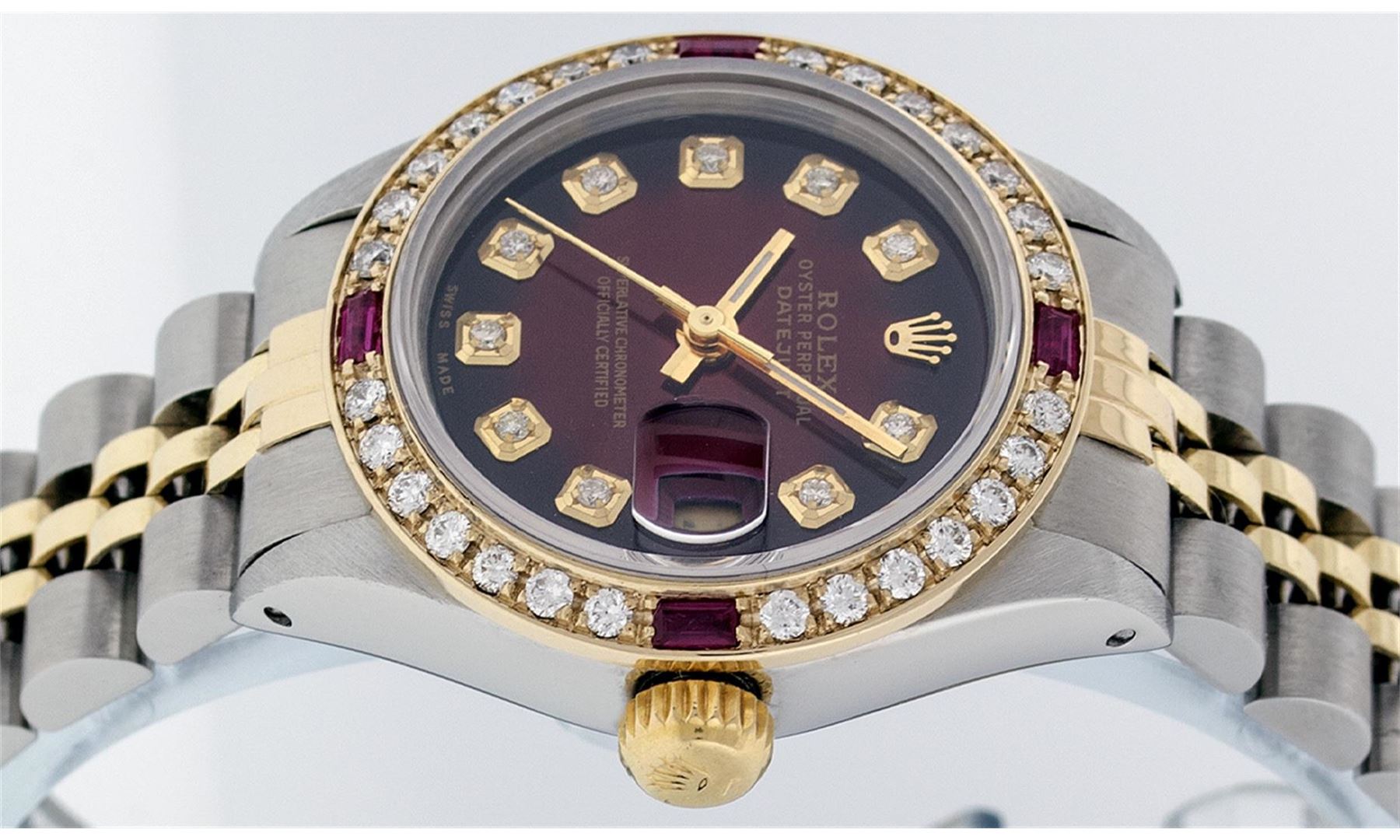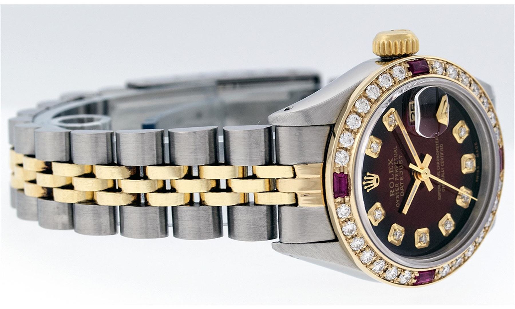 One Ladies Two Tone Rolex Datejust Polished, Serviced & Electronically Tested, 14K Yellow Gold & Stainless Steel Case:26mm, 14K Yellow Gold Crown, Custom Bezel: 18K Yellow Gold Ruby Beadset Diamond Bezel, Diamond Count: 28 Diamonds + 4 Rubies Total Weight .70 Carat, Clarity: Si-VS, Color: G to H. Custom Crystal: Synthetic Sapphire Cyclops Lens. Movement: Automatic Winding Movement Caliber 2030. Custom Dial: Dark Red Vignette With Diamond Hour Markers. Diamond Count: 10 Diamonds In Dial, Clarity:Si-VS, Color: G to H. Date Window: 3 O'Clock Position Date Display, Non Quickset, Model: Datejust. Condition: G-6 Extra Fine. Bracelet: Two Tone 14K Yellow Gold & Stainless Steel Jubilee. Bright Polish. 6.0 Inch Length, Adjustable. Standard Clasp, With Rolex Logo.