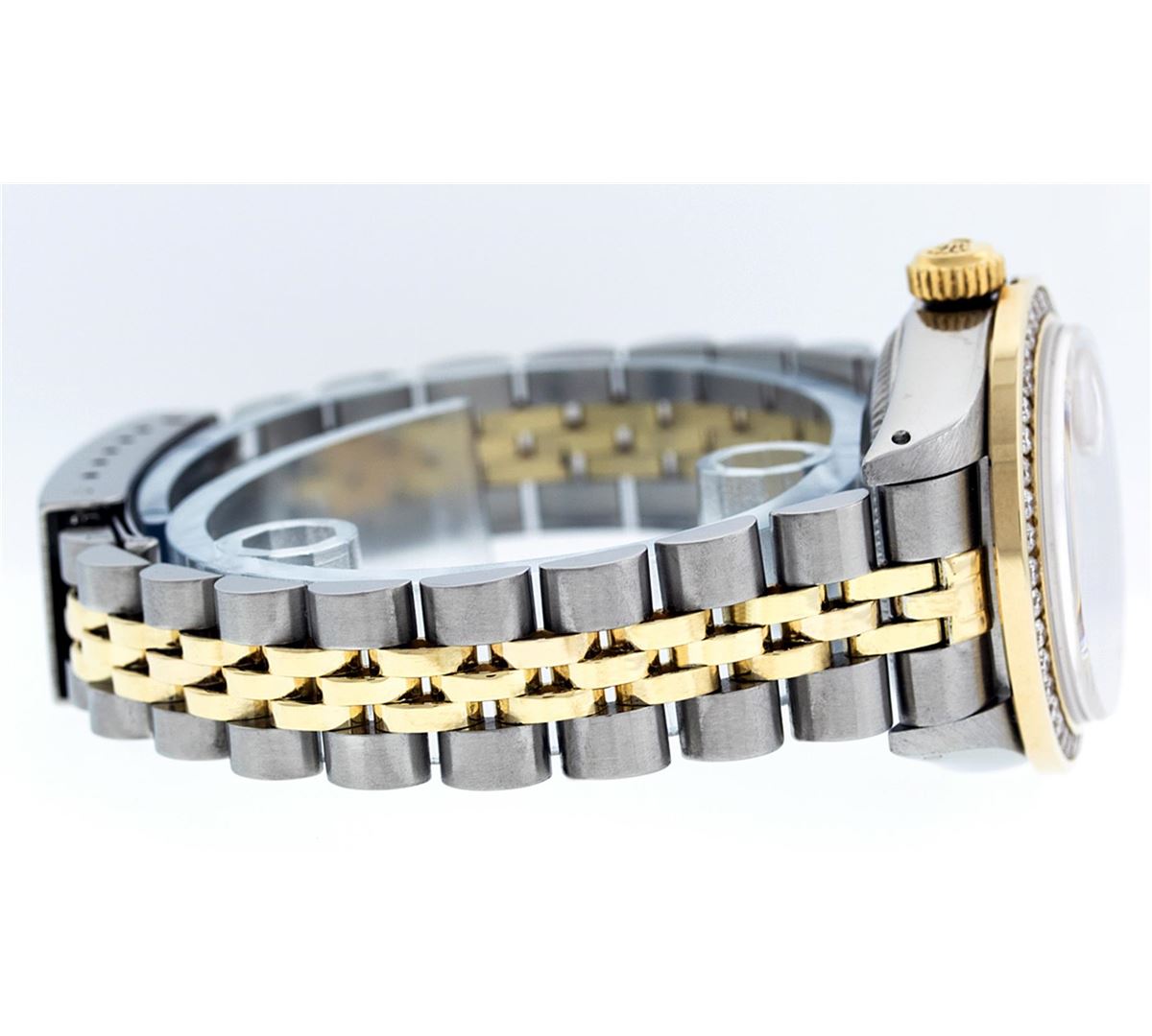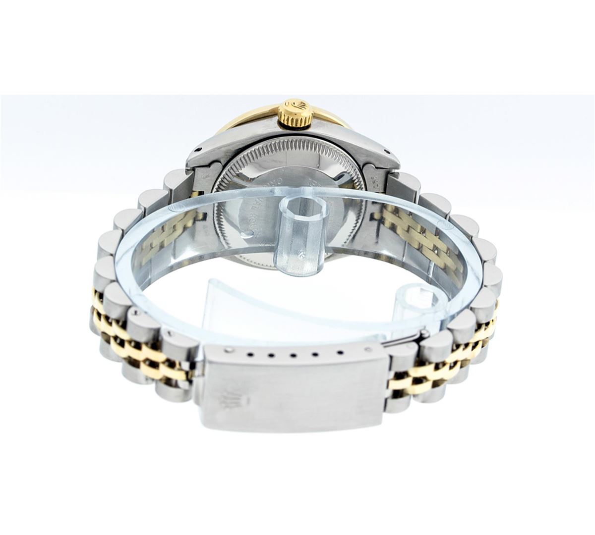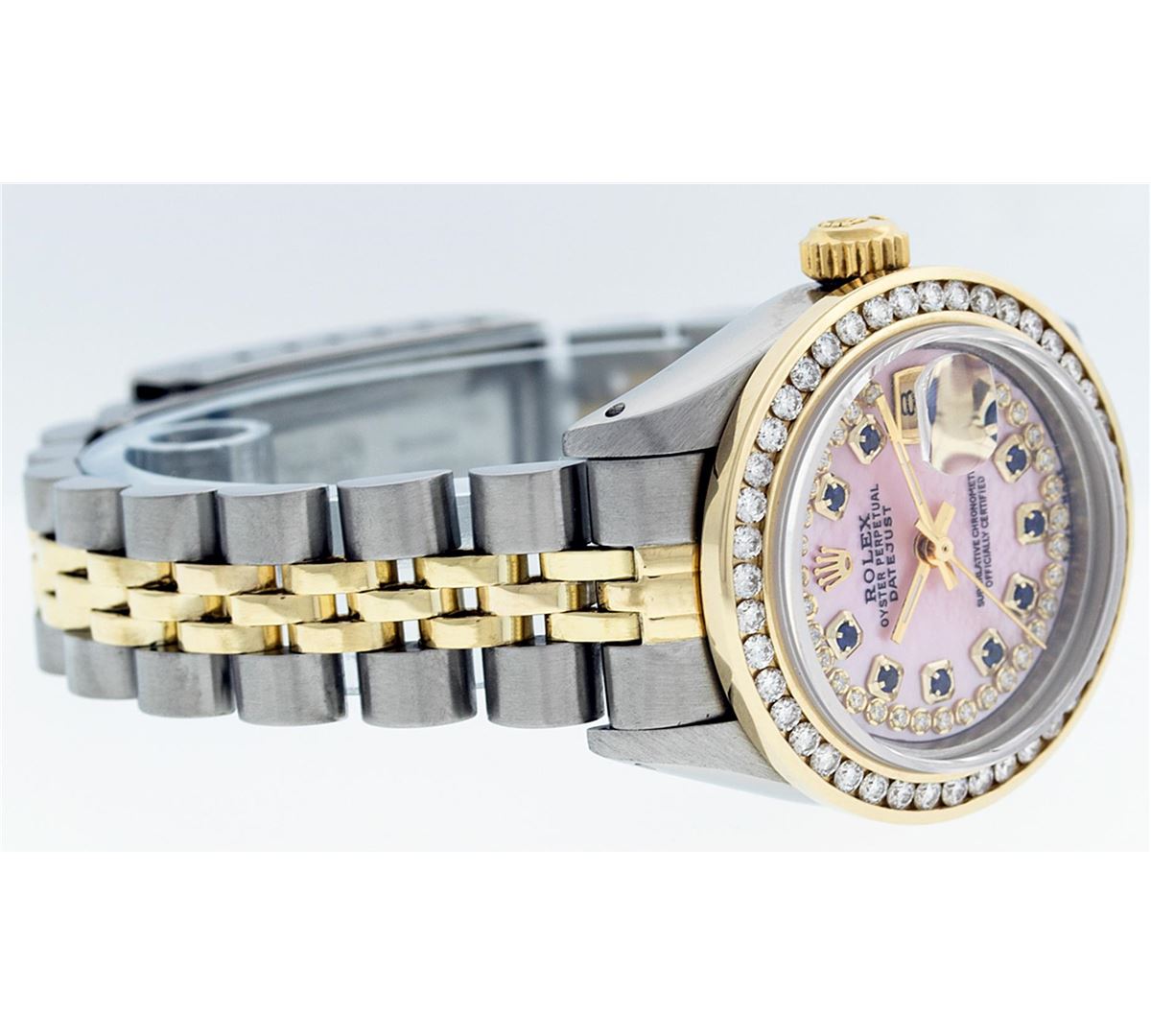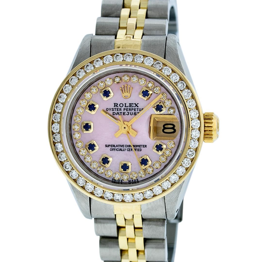 One Ladies Two Tone Rolex Datejust Polished, Serviced & Electronically Tested, 14K Yellow Gold & Stainless Steel Case:26mm, 14K Yellow Gold Crown, Custom Bezel: 18K Yellow Gold Channel Set Diamond Bezel, Diamond Count: 44 Diamonds Total Weight 1.00 Carat, Clarity: Si-VS, Color: G to H. Custom Crystal: Synthetic Sapphire Cyclops Lens. Movement: Automatic Winding Movement Caliber 2030. Custom Dial: Pink Mother Of Pearl With Sapphire String Diamond Dial, Stone Count: 10 Sapphires + 33 Diamonds. Date Window: 3 O'Clock Position Date Display, Model: Datejust. Condition: G-6 Extra Fine. Bracelet: Two Tone 14K Yellow Gold & Stainless Steel Jubilee. Bright Polish. 6.0 Inch Length, Adjustable. Standard Clasp, With Rolex Logo.
