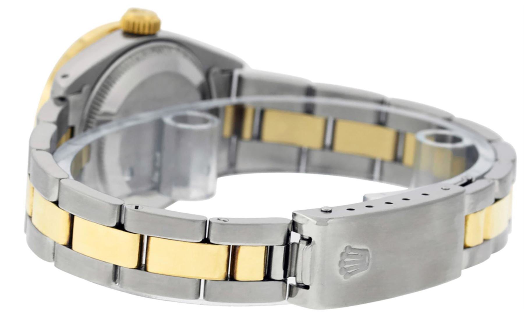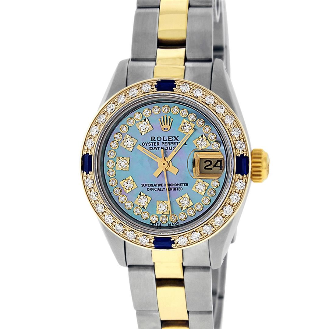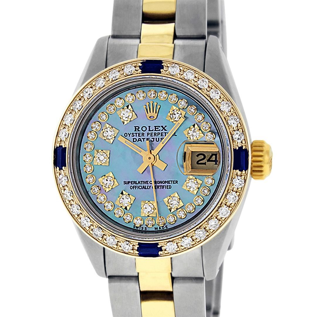 One Ladies Two Tone Rolex Datejust Polished, Serviced & Electronically Tested, Yellow Gold & Stainless Steel Case: 26mm, Yellow Gold Crown, Custom Bezel: New 18K New Yellow Gold Beadset + Sapphire Diamond Bezel, Stone Count: 28 Diamonds + 4 Sapphires In Bezel, Total Weight .70 Carat, Clarity: SI-VS, Color: G to H. Custom Crystal: New Scratch Resistant Synthetic Sapphire Cyclops Lens. Custom Hands: New Luminescent Hands. Movement: Automatic Winding Movement.. Custom Dial: Blue MOP String With Diamond Hour Markers, Diamond Count: 43 Diamonds On Dial, Clarity: SI-VS, Color: VS2. Date Window: 3 O'clock Position Date Display, Model: Datejust. Condition: G-6 Extra Fine. Bracelet: Two Tone Yellow Gold & Stainless Steel Oyster Band. Bright Polish. 6.0 Inch Length, Adjustable. Standard Clasp, With Rolex Logo. This Watch Has Been Serviced Time Tested And Is In Excellent Condition It Is Free Of All Scratches And Dents.