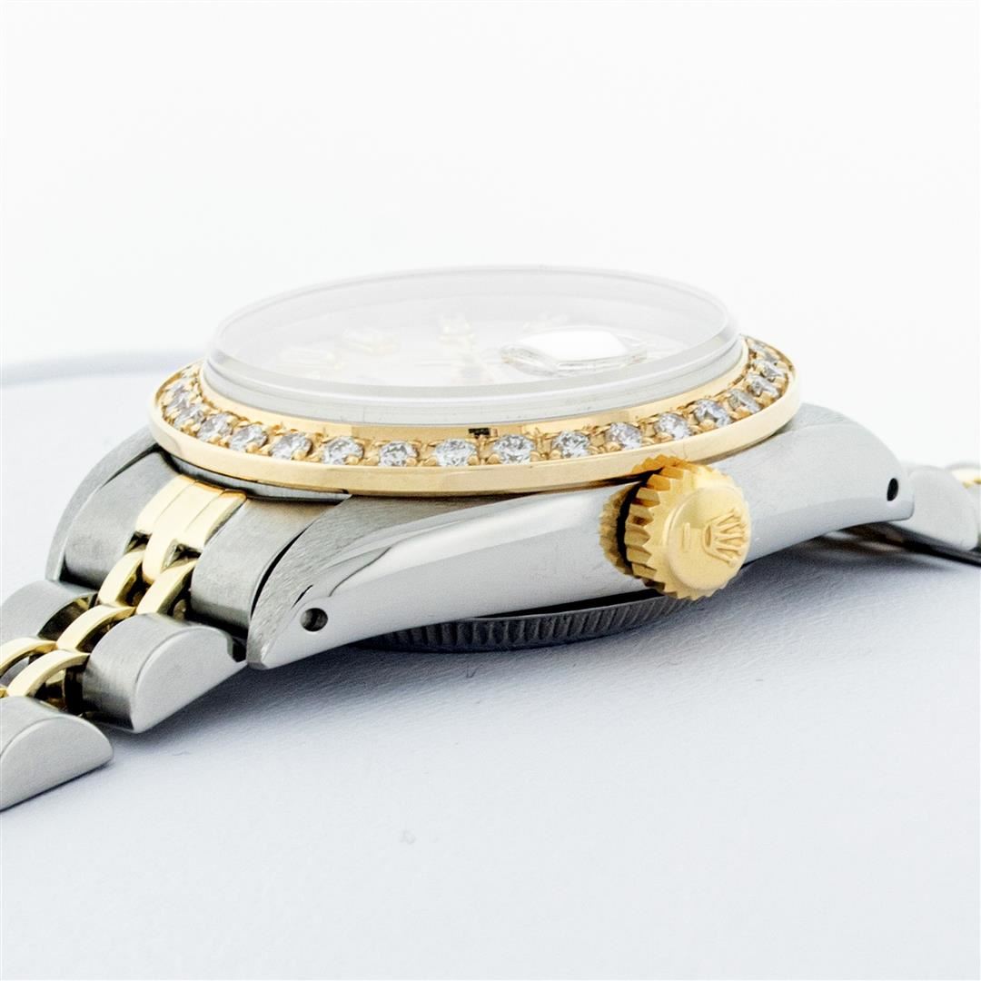 One Ladies Two Tone Rolex Datejust Polished, Serviced & Electronically Tested, Yellow Gold & Stainless Steel Case: 26mm, Yellow Gold Crown, Custom Bezel: New 18K Yellow Gold Beadset Diamond Bezel, Diamond Count: 32 Diamonds On Bezel, Total Weight .70 Carat, Clarity: SI-VS, Color: G to H. Custom Crystal: New Scratch Resistant Synthetic Sapphire Cyclops Lens. Custom Hands: New Luminescent Hands. Movement: Automatic Winding Movement.. Custom Dial: Pink MOP Baguette Diamond Dial, Diamond Count: 10 Baguette Diamonds On Dial, G To H In Color, SI-VS Clarity. Date Window: 3 O'clock Position Date Display, Model: Datejust, Condition: G-6 Extra Fine. Bracelet: Two Tone Yellow Gold & Stainless Steel Jubilee Band. Bright Polish. 6.0 Inch Length, Adjustable. Standard Clasp, With Rolex Logo. This Watch Has Been Serviced Time Tested And Is In Excellent Condition It Is Free Of All Scratches And Dents.