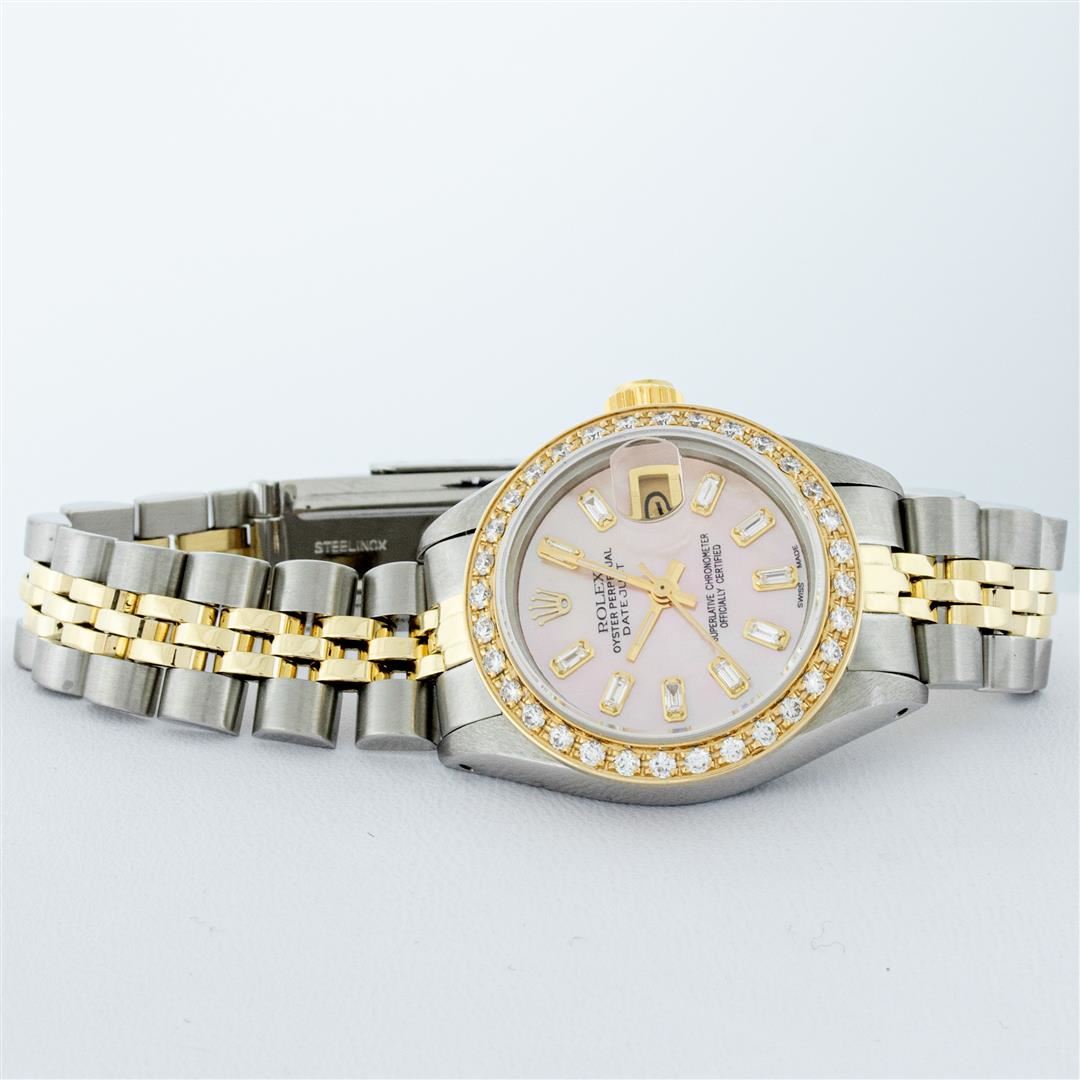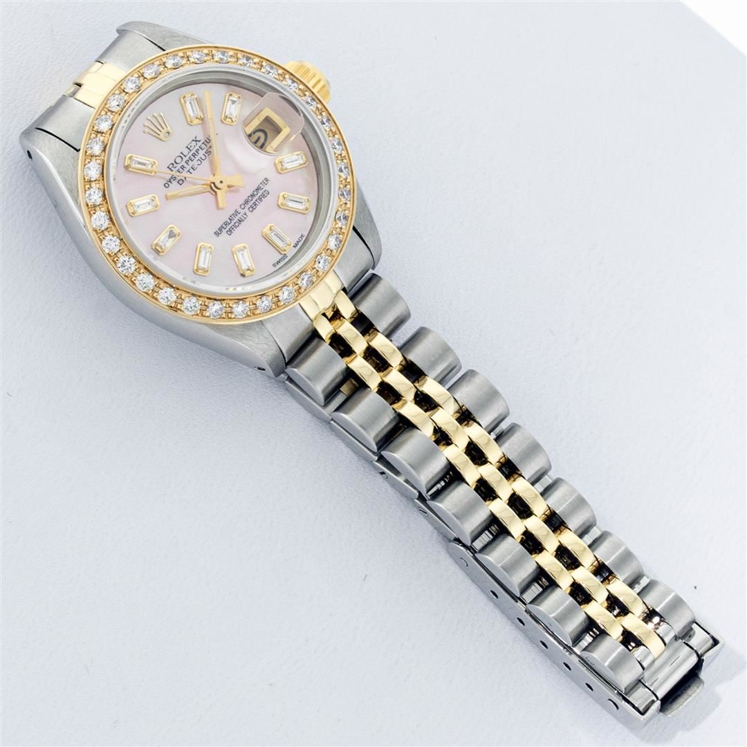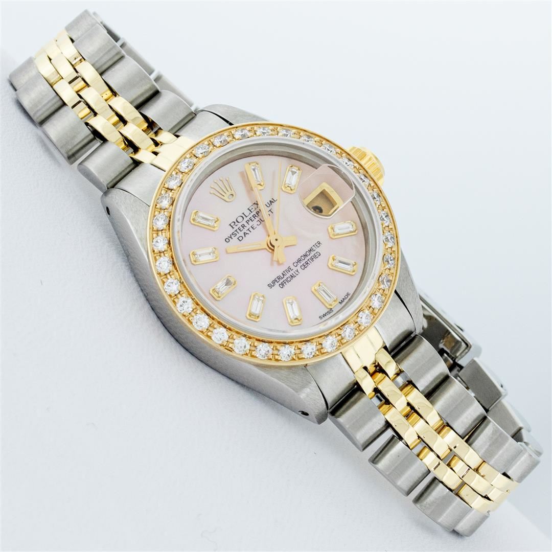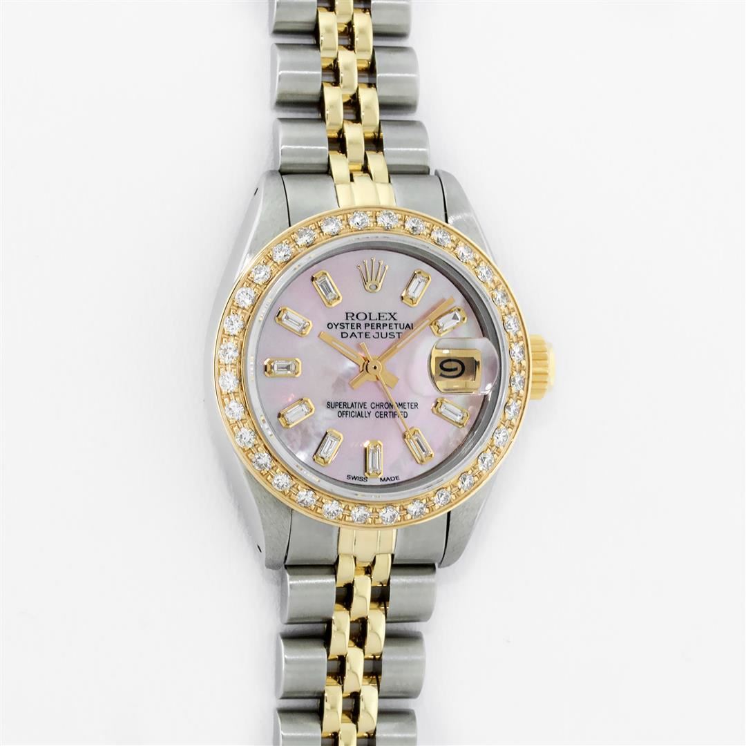 One Ladies Two Tone Rolex Datejust Polished, Serviced & Electronically Tested, Yellow Gold & Stainless Steel Case: 26mm, Yellow Gold Crown, Custom Bezel: New 18K Yellow Gold Beadset Diamond Bezel, Diamond Count: 32 Diamonds On Bezel, Total Weight .70 Carat, Clarity: SI-VS, Color: G to H. Custom Crystal: New Scratch Resistant Synthetic Sapphire Cyclops Lens. Custom Hands: New Luminescent Hands. Movement: Automatic Winding Movement.. Custom Dial: Pink MOP Baguette Diamond Dial, Diamond Count: 10 Baguette Diamonds On Dial, G To H In Color, SI-VS Clarity. Date Window: 3 O'clock Position Date Display, Model: Datejust, Condition: G-6 Extra Fine. Bracelet: Two Tone Yellow Gold & Stainless Steel Jubilee Band. Bright Polish. 6.0 Inch Length, Adjustable. Standard Clasp, With Rolex Logo. This Watch Has Been Serviced Time Tested And Is In Excellent Condition It Is Free Of All Scratches And Dents.