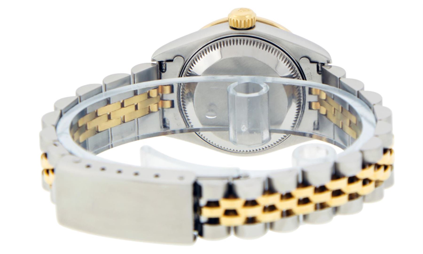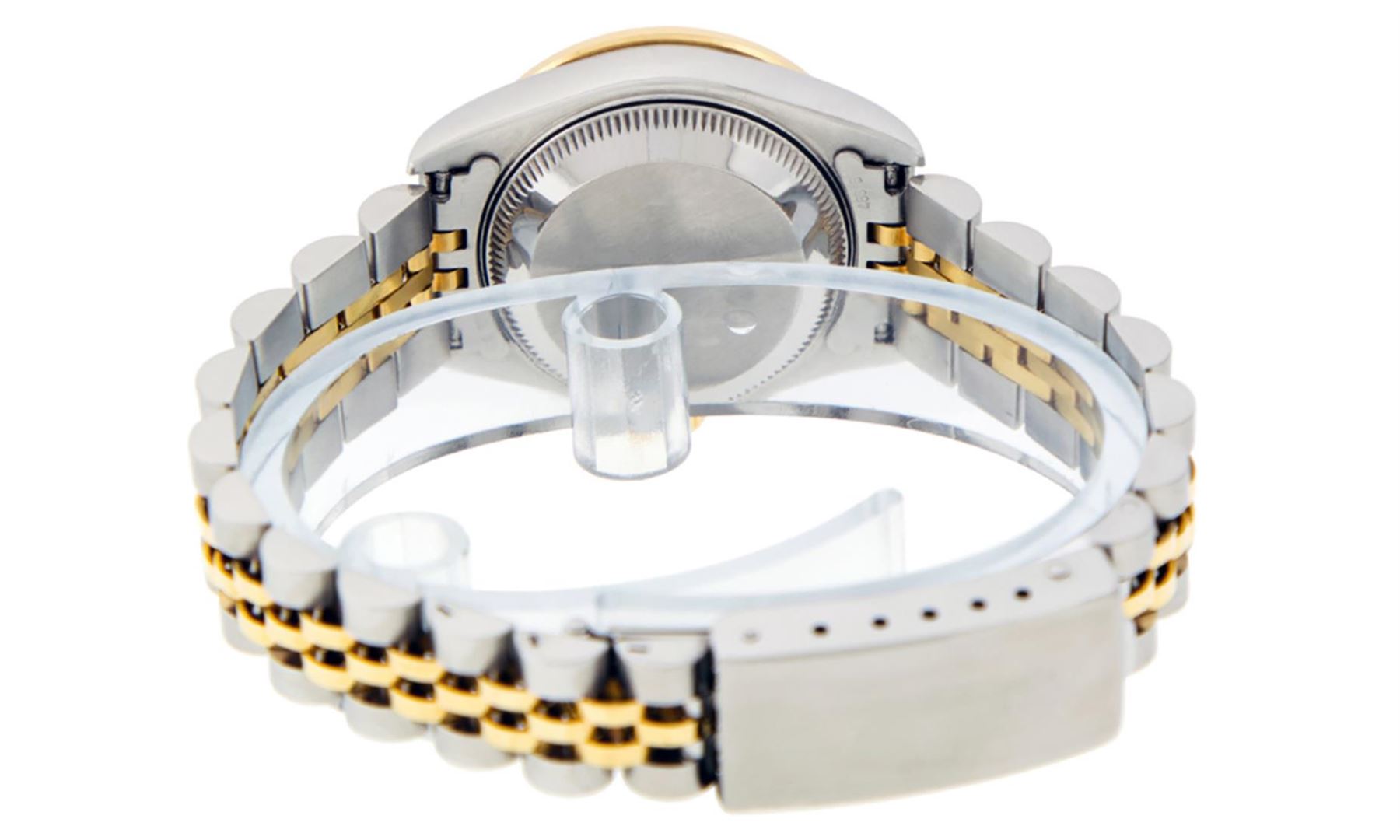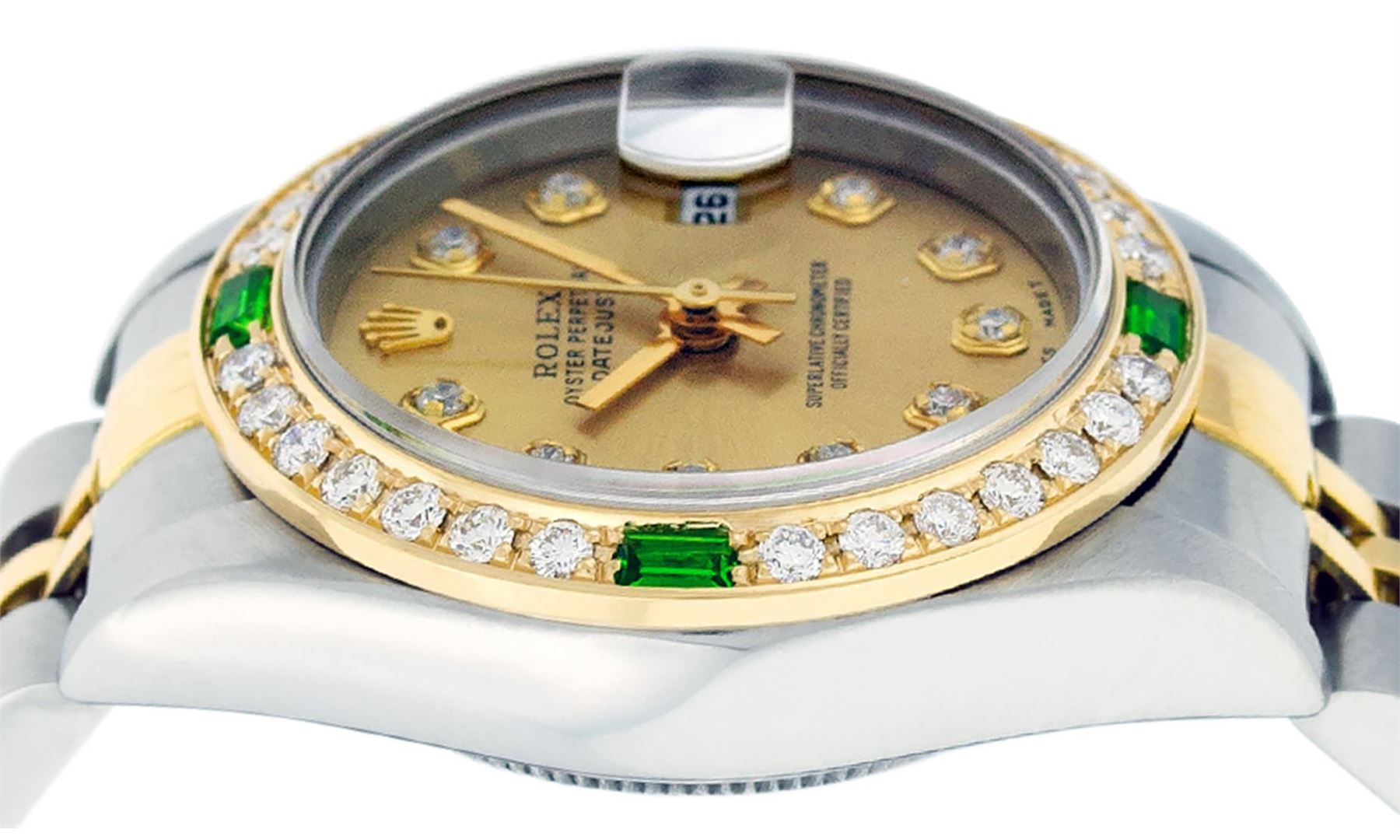One Ladies Pre Owned 18K Two Tone Yellow Gold And Stainless Steel Rolex Datejust Polished, Serviced And Electronically Tested, 18K Yellow Gold And Stainless Steel Case: 26mm, 18K Yellow Gold Crown, Custom Bezel: New 18K Yellow Gold Emerald Beadset Diamond Bezel, Diamond + Gem Count: 28 Diamonds + 4 Emeralds. Custom Crystal: New Sapphire With Date Window. Custom Hands: New Luminescent Hands. Rolex Movement: Quickset Automatic Winding Movement 2235. Custom Dial: Custom Champagne Dial With Added Diamonds, Diamond Count: 10 On Dial. Date Window: 3 O'Clock Position Date Display, Model: Datejust, Condition: G-6 Extra Fine. Rolex Bracelet: Two Tone 18K Yellow Gold And Stainless Steel Jubilee Band. Bright Polish. 6.0 Inch Length, Adjustable. Standard Clasp, With Rolex Logo. This Watch Has Been Serviced Time Tested And Is In Excellent Condition It Is Free Of All Scratches And Dents.