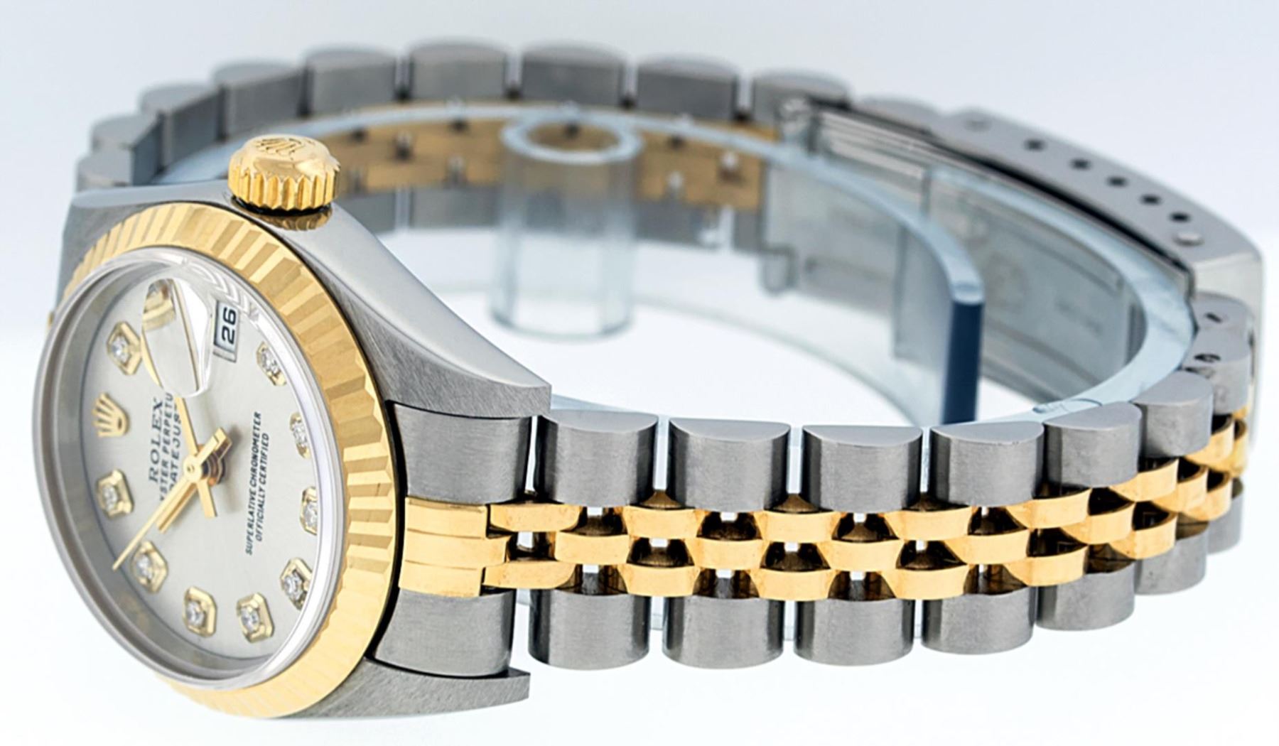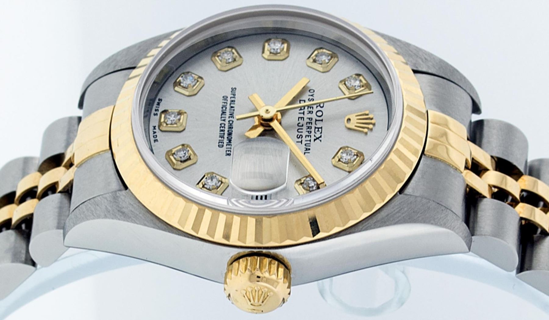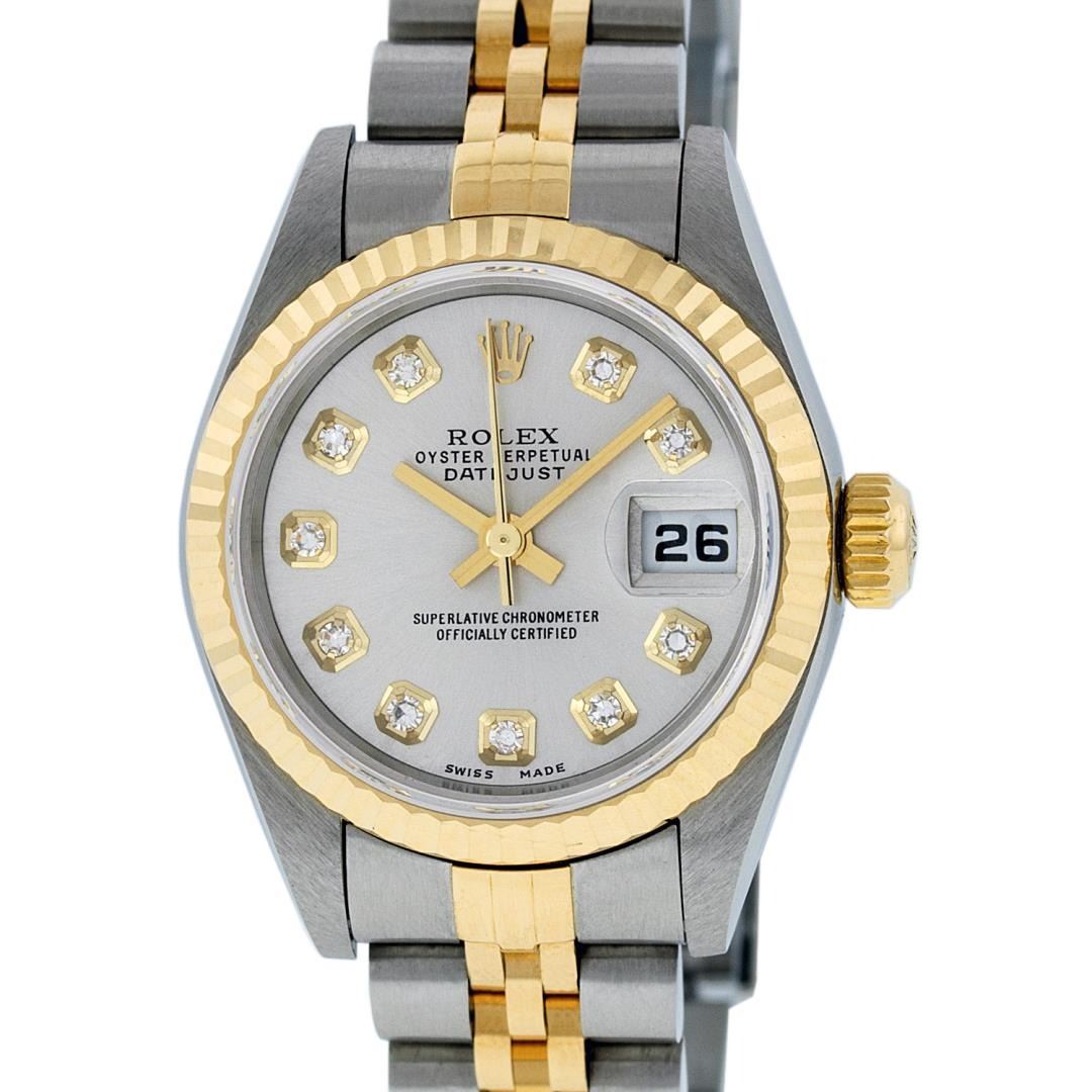 One Ladies Pre Owned 18K Yellow Gold And Stainless Steel Rolex Datejust Polished, Serviced And Electronically Tested, 18K Yellow Gold And Stainless Steel, Case Size: 26mm, 18K Yellow Gold Crown, Rolex Bezel: 18K Yellow Gold Fluted Bezel. Custom Crystal: New Sapphire With Magnified Date Window. Custom Hands: New Luminescent Hands. Rolex Movement: Quickset Automatic Winding Movement 2235. Custom Dial: Custom Silver Dial With Added Diamonds, Diamond Count: 10 Diamonds On Dial. Date Window: 3 O'Clock Position Date Display, Model: Datejust. Condition: G-6 Extra Fine. Rolex Bracelet: Two Tone 18K Yellow Gold And Stainless Steel Jubilee Band. Bright Polish. 6.0 Inch Length, Adjustable. Standard Clasp, With Rolex Logo. This Watch Has Been Serviced Time Tested And Is In Excellent Condition It Is Free Of All Scratches And Dents.