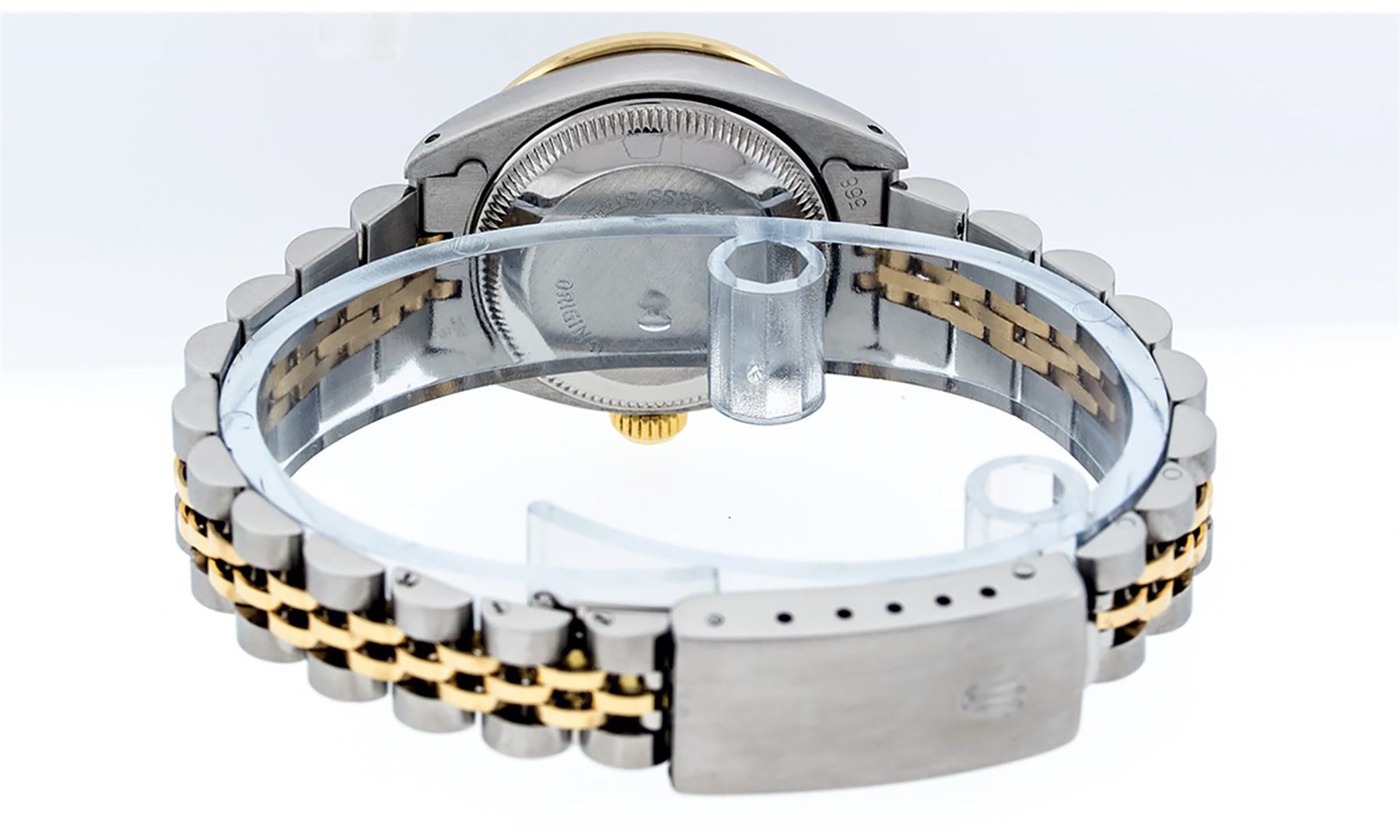 One Ladies Pre Owned Rolex Quickset Two Tone 18K Yellow Gold And Stainless Steel Datejust Polished, Serviced & Electronically Tested, Rolex Yellow Gold & Stainless Steel Case: 26mm, Rolex Yellow Gold Crown, Custom Bezel: New 18K Yellow Gold Sapphire Beadset Diamond Bezel, Diamond + Gem Count: 28 Diamonds + 4 Sapphires. Custom Crystal: New Sapphire With Magnified Date. Custom Hands: New Luminescent Hands. Rolex Movement: Automatic Winding Movement 2135. Custom Dial: Custom Blue Vignette Dial Set With Added Diamond Hour Markers, Diamond Count: 10 Diamond in Dial. Date Window: 3 O'Clock Position Date Display, Model: Quickset Datejust, Condition: G-6 Extra Fine. Rolex Bracelet: Two Tone Yellow Gold & Stainless Steel Jubilee Band. Bright Polish. 6.0 Inch Length, Adjustable. Standard Clasp, With Rolex Logo. This Watch Has Been Serviced Time Tested And Is In Excellent Condition It Is Free Of All Scratches And Dents.