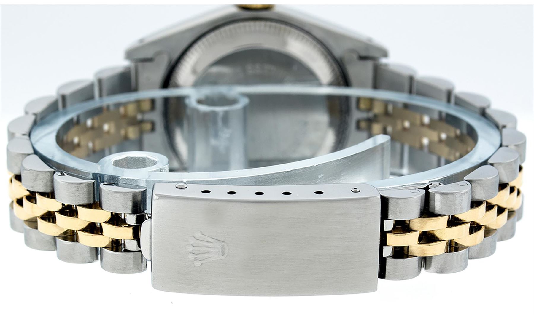 One Ladies Pre Owned Rolex Quickset Two Tone 18K Yellow Gold And Stainless Steel Datejust Polished, Serviced & Electronically Tested, Rolex Yellow Gold And Stainless Steel Case: 26mm, Rolex Yellow Gold Crown, Rolex Bezel: Rolex 18K Yellow Gold Fluted Bezel. Custom Crystal: New Sapphire With Magnified Date Window. Custom Hands: New Luminescent Hands. Rolex Movement: Automatic Winding Movement 2135. Custom Dial: Custom Champagne Dial With Added Diamond Hour Markers, Diamond Count: 10 Diamonds In Dial. Date Window: 3 O'Clock Position Date Display, Model: Quickset Datejust. Condition: G-6 Extra Fine. Rolex Bracelet: Two Tone 18K Yellow Gold And Stainless Steel Jubilee Band. Bright Polish. 6.0 Inch Length, Adjustable. Standard Clasp, With Rolex Logo. This Watch Has Been Serviced Time Tested And Is In Excellent Condition It Is Free Of All Scratches And Dents.