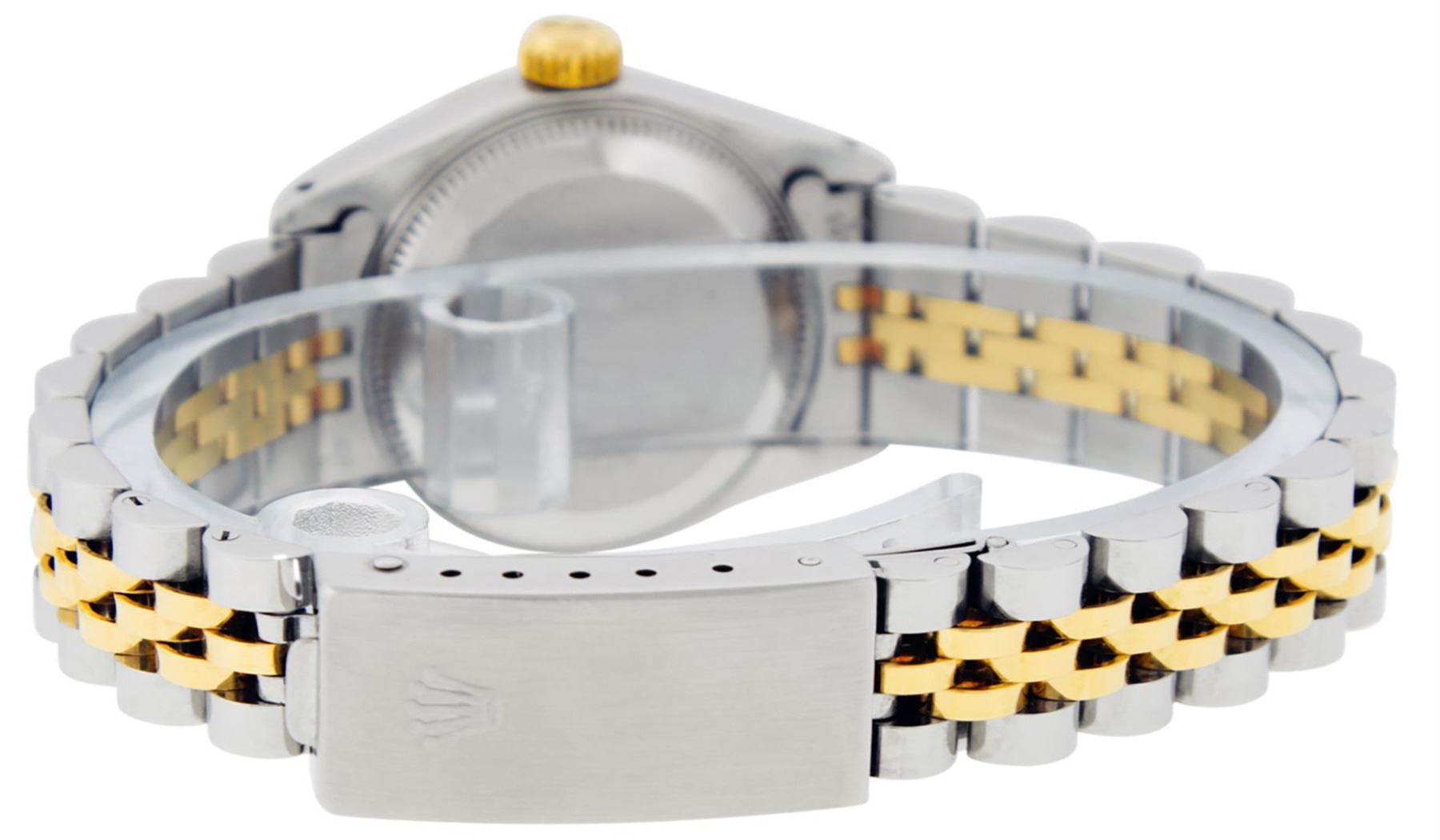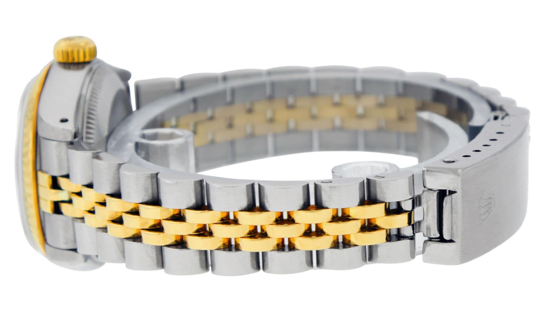 One Ladies Pre Owned Quickset Rolex Two Tone 18K Yellow Gold And Stainless Steel Datejust Polished, Serviced & Electronically Tested, Yellow Gold And Stainless Steel Case: 26mm, Yellow Gold Crown, Rolex Bezel: 18K Yellow Gold Fluted Bezel. Custom Crystal: New Acrylic Cyclops Lens. Custom Hands: New Luminescent Hands. Rolex Movement: Automatic Winding Movement 2135. Custom Dial: Custom Silver Dial With Custom Added Diamond Hour Markers, Diamond Count: 10 Diamonds, Color: G to H, Clarity: VS2-SI1. Date Window: 3 O'Clock Position Date Display, Model: Quickset Datejust. Condition: G-6 Extra Fine. Rolex Bracelet: Two Tone 18K Yellow Gold And Stainless Steel Jubilee Band. Bright Polish. 6.0 Inch Length, Adjustable. Standard Clasp, With Rolex Logo. This Watch Has Been Serviced Time Tested And Is In Excellent Condition It Is Free Of All Scratches And Dents.