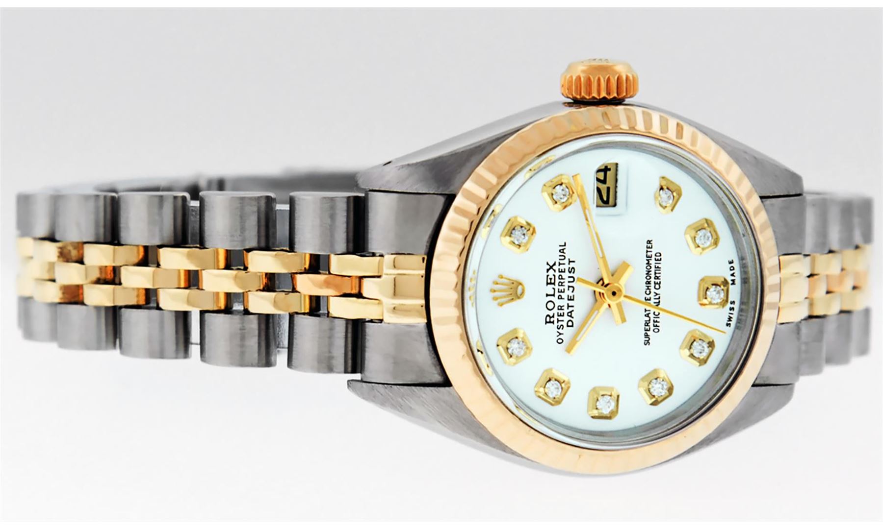 One Ladies Pre Owned Rolex Two Tone 18K Yellow Gold And Stainless Steel Quickset Datejust Polished, Serviced & Electronically Tested, Rolex Yellow Gold And Stainless Steel Case: 26mm, Rolex Yellow Gold Crown, Rolex Bezel: 18K Yellow Gold Fluted Bezel. Custom Crystal: New Sapphire With Magnified Date. Custom Hands: New Luminescent Hands. Rolex Movement: Automatic Winding Movement 2135. Custom Dial: Custom White Dial With Added Diamond Hour Markers, Diamond Count: 10 Diamonds. Date Window: 3 O'Clock Position Date Display, Model: Quickset Datejust. Condition: G-6 Extra Fine. Rolex Bracelet: Two Tone 18K Yellow Gold And Stainless Steel Jubilee Band. Bright Polish. 6.0 Inch Length, Adjustable. Standard Clasp, With Rolex Logo. This Watch Has Been Serviced Time Tested And Is In Excellent Condition It Is Free Of All Scratches And Dents.