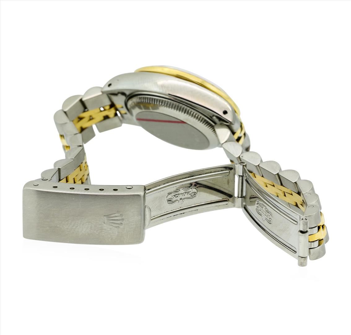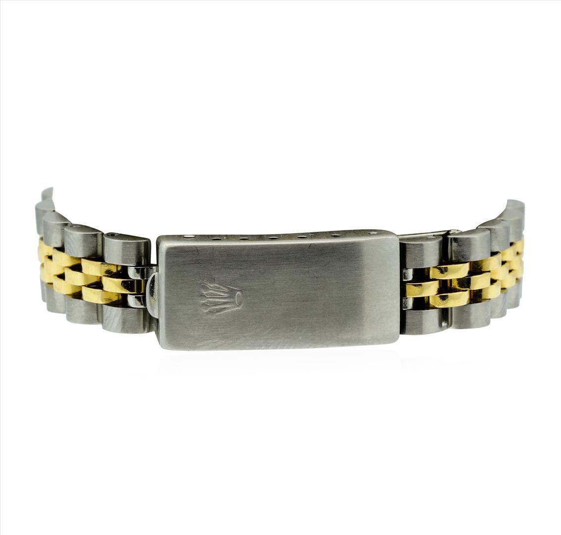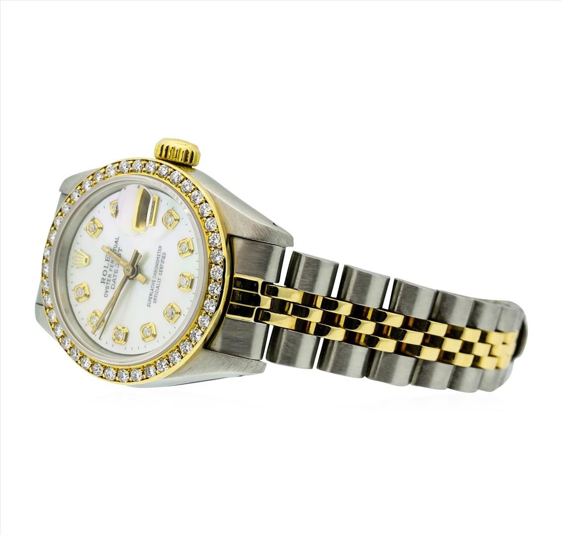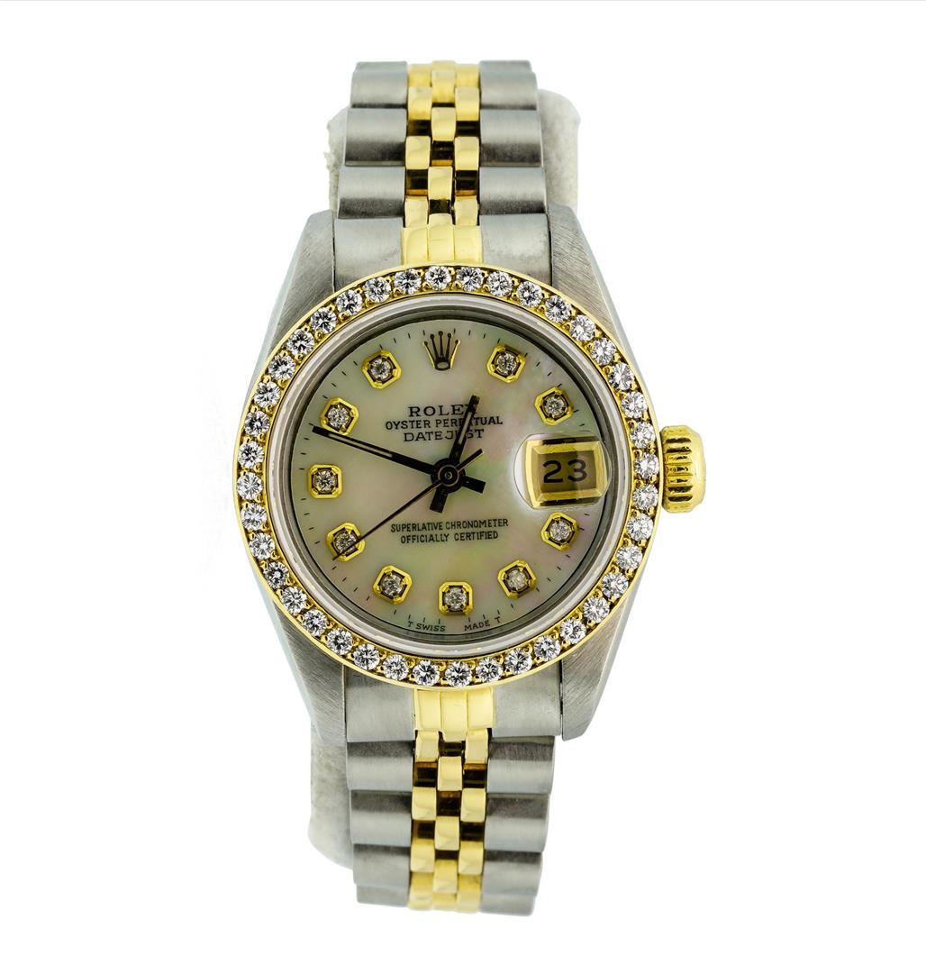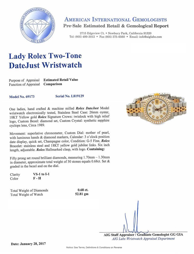 One ladies, hand crafted & machine milled Rolex DateJust Model wristwatch electronically tested, Stainless Steel Case: 26mm oyster, 18KT Yellow gold Rolex Signature Crown: twinlock with high relief logo, Custom Bezel: diamond set, Custom Crystal: synthetic sapphire cyclops lens, Circa 1989. Movement: superlative chronometer, Custom Dial: mother of pearl, with luminous hands & diamond markers, Calendar: 3 o'clock position date display, quick set, Champagne color, Condition: G-5 Fine, Rolex Bracelet: stainless steel and 18KT yellow gold jubilee links. Six inch length, adjustable. Rolex Hallmarked clasp, with logo. Containing: Fifty prong set round brilliant diamonds, measuring 1.70mm - 1.30mm in diameter, approximate total weight of 50 stones equals 0.68ct. Set & graded in the bezel and on the dial. Clarity: VS-1 to I-1. Color: F - H. Total Weight of Diamonds 0.68ct. Total Weight of Watch 52.81gm. AIG Appraised.