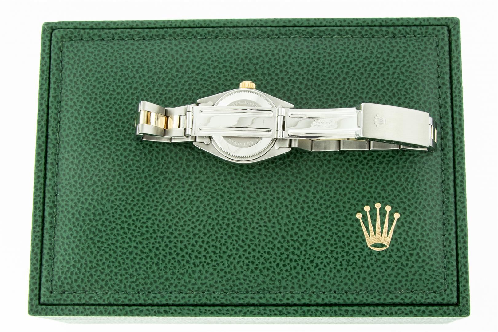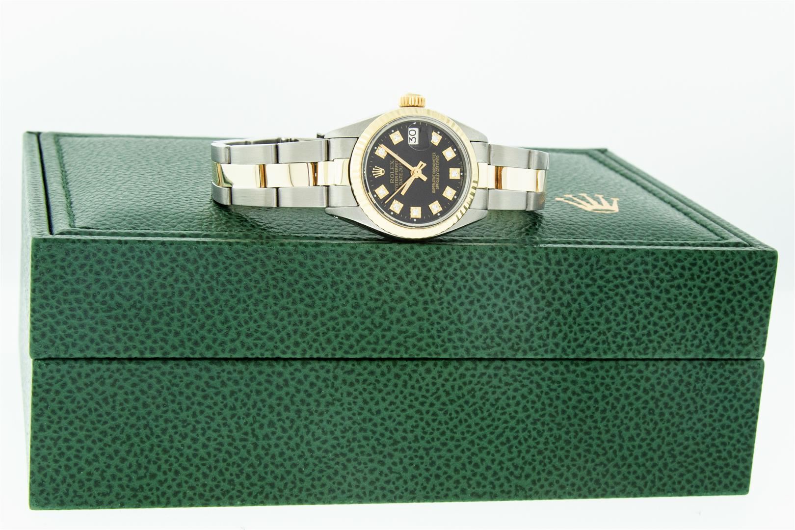 One Ladies Two Tone Rolex Datejust Polished, Serviced & Electronically Tested, Yellow Gold & Stainless Steel Case: 26mm, Yellow Gold Crown, Bezel: Yellow Gold Fluted Bezel. Custom Crystal: New Acrylic Cyclops Lens. Custom Hands: New Luminescent Hands. Movement: Automatic Winding Movement.. Custom Dial: Black With Diamond Hour Markers, Diamond Count: 10 Single Cut Diamonds, Color: G to H, Clarity: VS. Date Window: 3 O'clock Position Date Display, Model: Datejust. Condition: G-6 Extra Fine. Bracelet: Two Tone Yellow Gold & Stainless Steel Oyster Band. Bright Polish. 6.0 Inch Length, Adjustable. Standard Clasp, With Rolex Logo. This Watch Has Been Serviced Time Tested And Is In Excellent Condition It Is Free Of All Scratches And Dents. This Watch Comes With A Rolex Box.