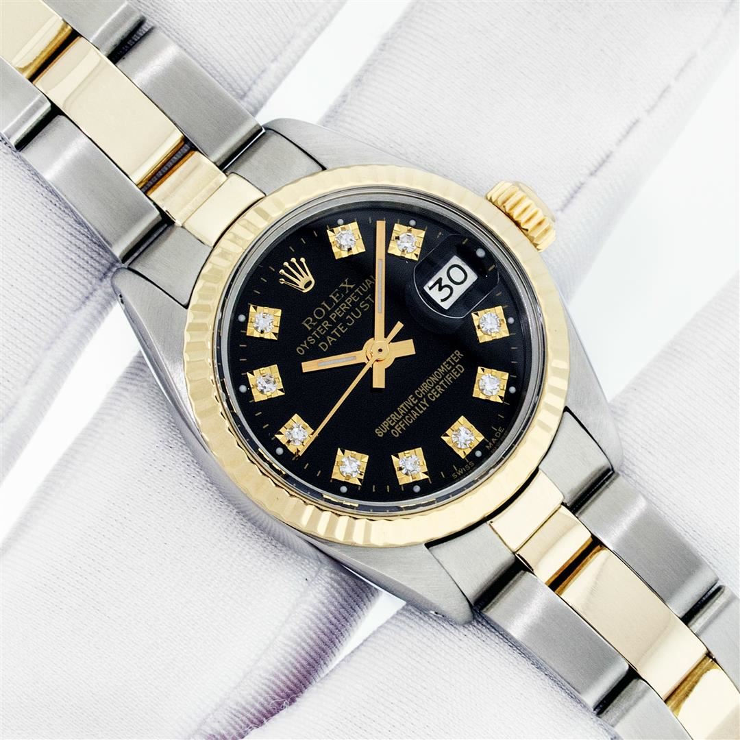 One Ladies Two Tone Rolex Datejust Polished, Serviced & Electronically Tested, Yellow Gold & Stainless Steel Case: 26mm, Yellow Gold Crown, Bezel: Yellow Gold Fluted Bezel. Custom Crystal: New Acrylic Cyclops Lens. Custom Hands: New Luminescent Hands. Movement: Automatic Winding Movement.. Custom Dial: Black With Diamond Hour Markers, Diamond Count: 10 Single Cut Diamonds, Color: G to H, Clarity: VS. Date Window: 3 O'clock Position Date Display, Model: Datejust. Condition: G-6 Extra Fine. Bracelet: Two Tone Yellow Gold & Stainless Steel Oyster Band. Bright Polish. 6.0 Inch Length, Adjustable. Standard Clasp, With Rolex Logo. This Watch Has Been Serviced Time Tested And Is In Excellent Condition It Is Free Of All Scratches And Dents. This Watch Comes With A Rolex Box.