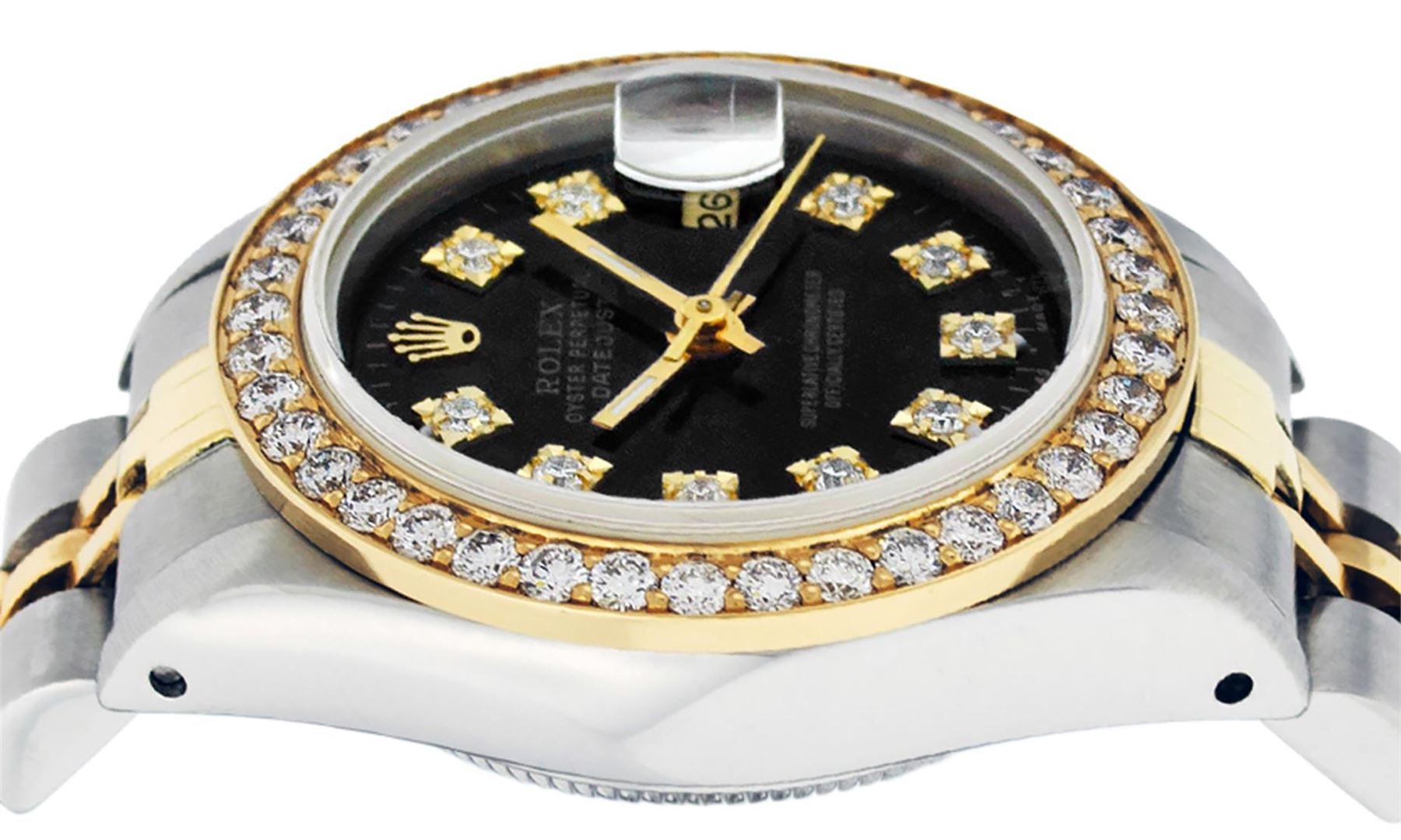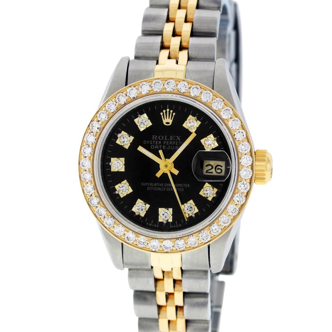 One Ladies Two Tone Rolex Datejust Polished, Serviced & Electronically Tested, Yellow Gold & Stainless Steel Case: 26mm, Yellow Gold Crown, Custom Bezel: New 18K 1ctw Yellow Gold Beadset Diamond Bezel, Diamond Count: 44 Diamonds, Total Weight 1.00 Carat, Clarity: Si-VS, Color: G to H. Custom Crystal: New Synthetic Sapphire Cyclops Lens. Custom Hands: New Luminescent Hands. Movement: Automatic Winding Movement. Custom Dial: Black Diamond Dial. Date Window: 3 O'Clock Position Date Display, Model: Datejust, Condition: G-6 Extra Fine. Bracelet: Two Tone Yellow Gold & Stainless Steel Jubilee. Bright Polish. 6.0 Inch Length, Adjustable. Standard Clasp, With Rolex Logo. This Watch Has Been Serviced Time Tested And Is In Excellent Condition It Is Free Of All Scratches And Dents.