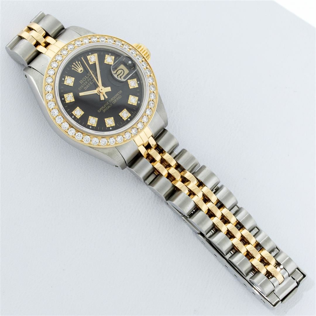 One Ladies Two Tone Rolex Datejust Polished, Serviced & Electronically Tested, Yellow Gold & Stainless Steel Case: 26mm, Yellow Gold Crown, Custom Bezel: New 18K 1ctw Yellow Gold Beadset Diamond Bezel, Diamond Count: 44 Diamonds, Total Weight 1.00 Carat, Clarity: Si-VS, Color: G to H. Custom Crystal: New Synthetic Sapphire Cyclops Lens. Custom Hands: New Luminescent Hands. Movement: Automatic Winding Movement. Custom Dial: Black, 10 Diamonds in Dial, G To H In Color, VS Clarity. Date Window: 3 O'Clock Position Date Display, Model: Datejust, Condition: G-6 Extra Fine. Bracelet: Two Tone Yellow Gold & Stainless Steel Jubilee. Bright Polish. 6.0 Inch Length, Adjustable. Standard Clasp, With Rolex Logo. This Watch Has Been Serviced Time Tested And Is In Excellent Condition It Is Free Of All Scratches And Dents.