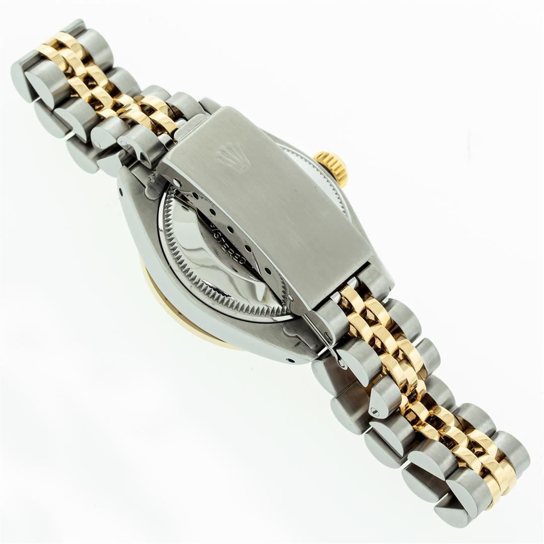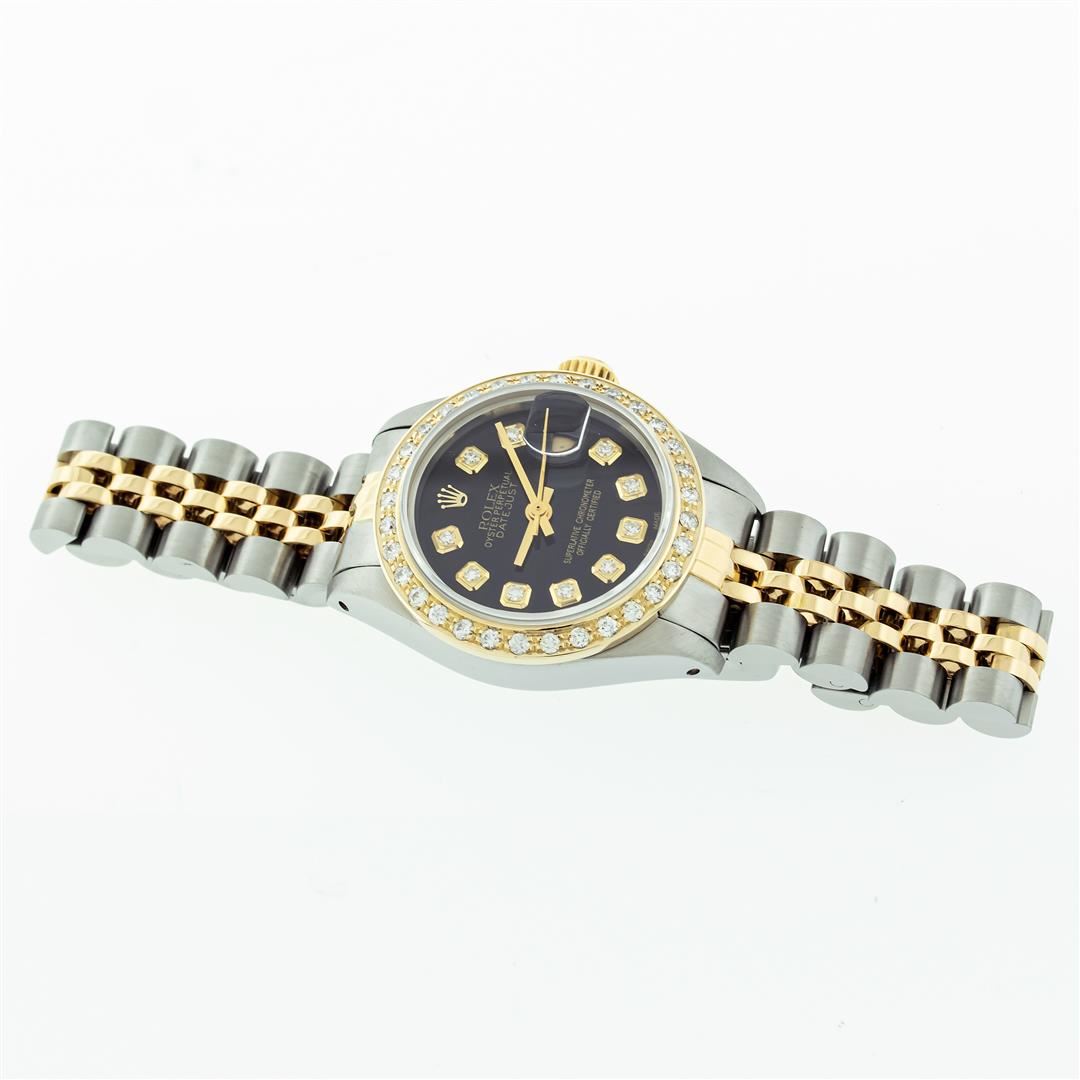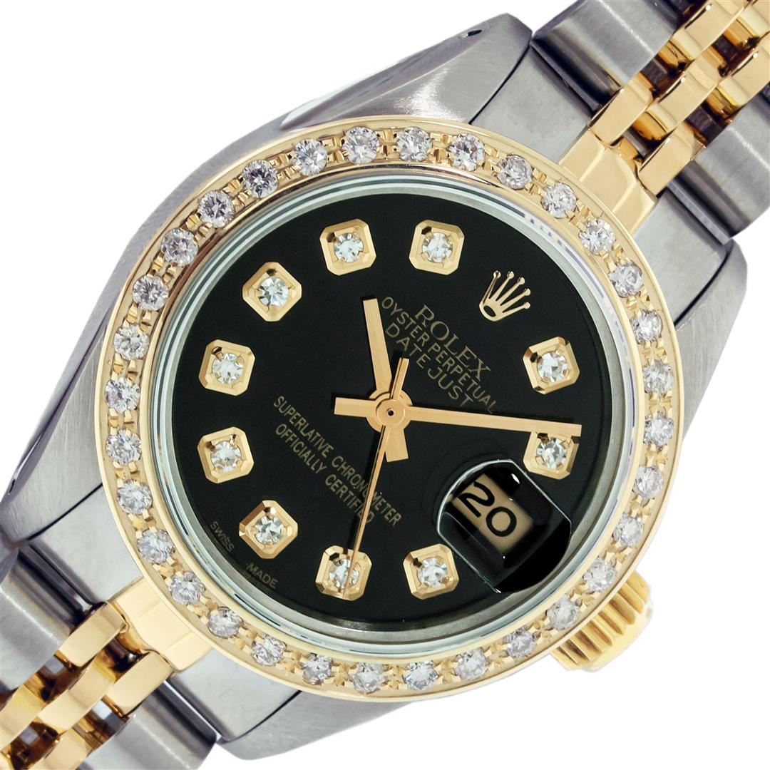 One Ladies Two Tone Rolex Datejust Polished, Serviced & Electronically Tested, Yellow Gold & Stainless Steel Case: 26mm, Yellow Gold Crown, Custom Bezel: New 18K .70ctw Yellow Gold Beadset Diamond Bezel, Diamond Count: 32 Diamonds, Total Weight .70 Carat, Clarity: Si-VS, Color: G to H. Custom Crystal: New Sapphire With Date Window. Custom Hands: New Hands. Rolex Movement: Automatic Winding Movement. Custom Dial: Refinished To Black With Added Diamond Hour Markers, Diamond Count: 10 Diamonds in Dial, G To H In Color, VS Clarity. Date Window: 3 O'Clock Position Date Display, Model: Datejust, Condition: G-6 Extra Fine. Rolex Bracelet: Two Tone Yellow Gold & Stainless Steel Jubilee Band. Bright Polish. 6.0 Inch Length, Adjustable. Standard Clasp, With Rolex Logo. This Pre Owned Watch Has Been Serviced Time Tested And Is In Excellent Condition It Is Free Of All Scratches And Dents.