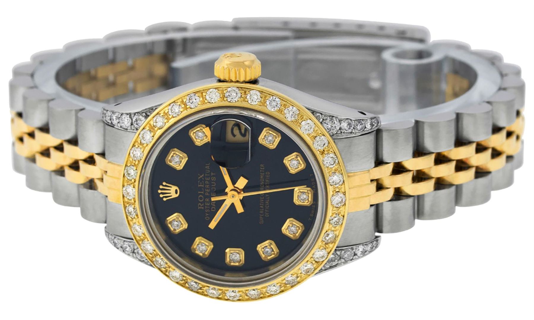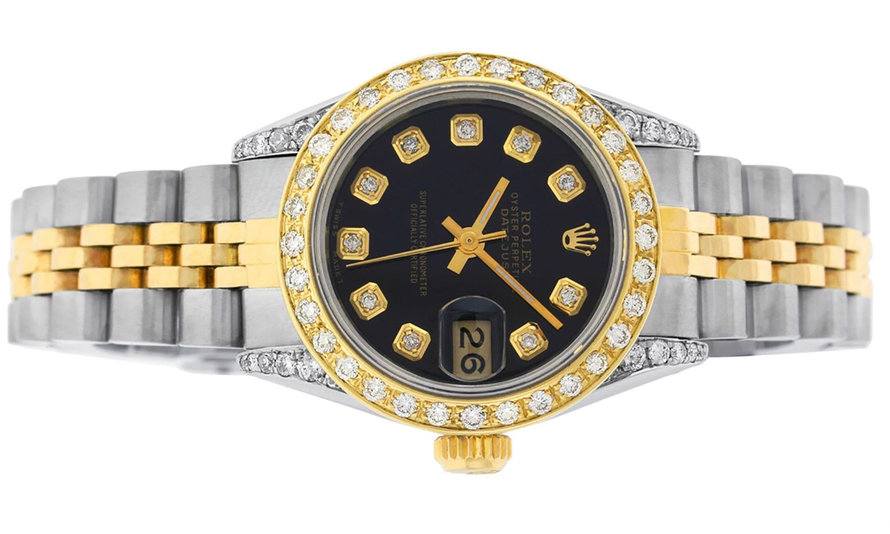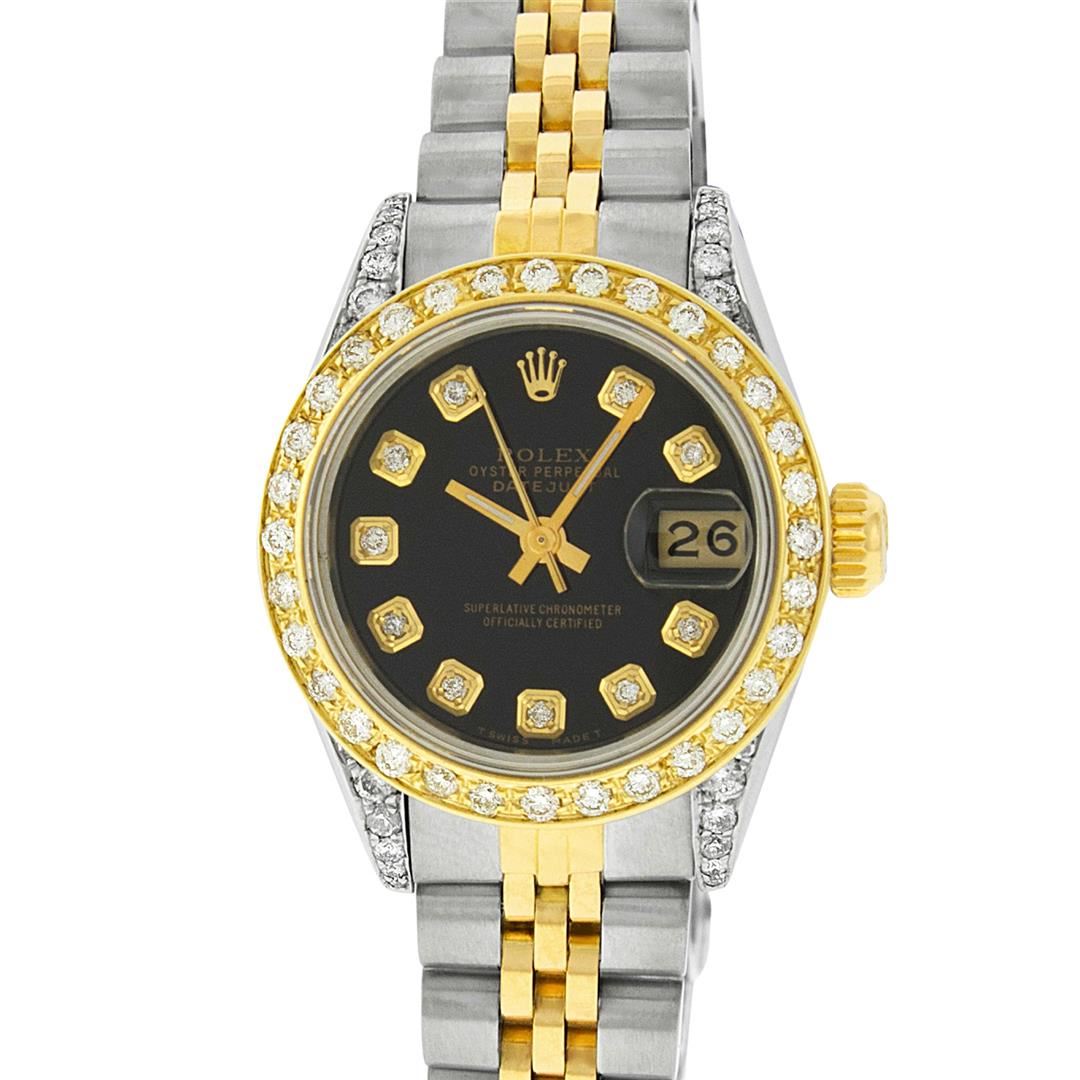 One Ladies Two Tone Rolex Oyster Perpetual Datejust Polished, Serviced & Electronically Tested, Yellow Gold & Stainless Steel Case: 26mm, Yellow Gold Crown, Diamond Lugs: 24 Diamonds On Lugs, Clarity: SI-VS, Color: G to H, Clarity SI-VS. Custom Bezel: New 18K Yellow Gold Beadset Diamond Bezel, Diamond Count: 32 Diamonds, Total Weight .70 Carat, Clarity: SI-VS, Color: G to H. Custom Crystal: New Scratch Resistant Synthetic Sapphire Cyclops Lens. Custom Hands: New Luminescent Hands. Movement: Automatic Winding Movement. Custom Dial: Black With Diamond Hour Markers, Diamond Count: 10 Diamonds, Clarity: SI-VS, Color: G to H. Date Window: 3 O'clock Position Date Display, Model: Datejust. Condition: G-6 Extra Fine. Bracelet: Two Tone Yellow Gold & Stainless Steel Jubilee. Bright Polish. 6.0 Inch Length, Adjustable. Standard Clasp, With Rolex Logo. This Watch Has Been Serviced Time Tested And Is In Excellent Condition It Is Free Of All Scratches And Dents.