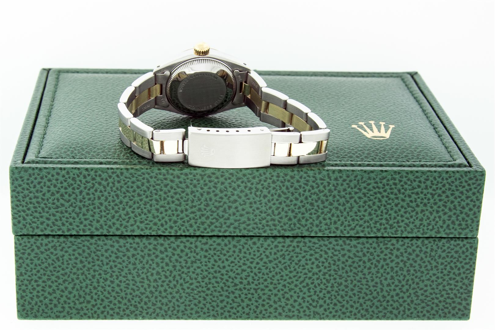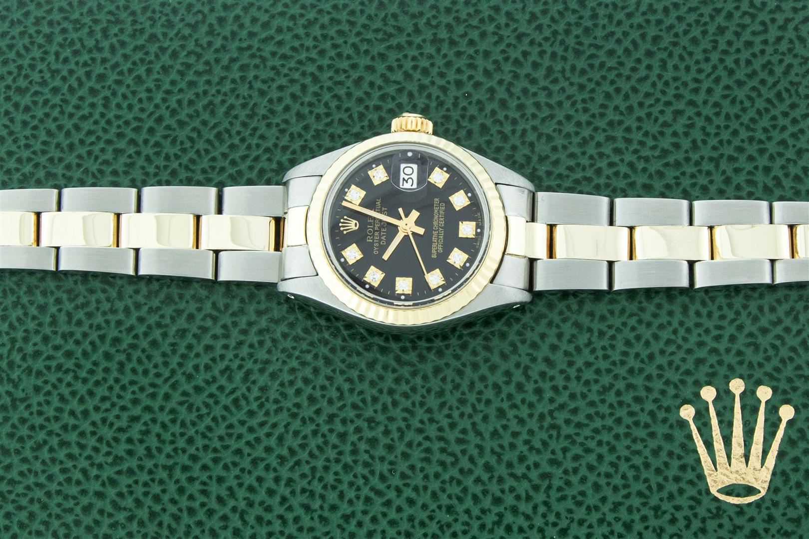 One Ladies Pre Owned Two Tone Yellow Gold And Stainless Steel Rolex Datejust Polished, Serviced & Electronically Tested, Rolex Yellow Gold & Stainless Steel Case: 26mm, Rolex Yellow Gold Crown, Rolex Bezel: Yellow Gold Fluted Bezel. Custom Crystal: New Acrylic With Magnified Date Window. Custom Hands: New Luminescent Hands. Rolex Movement: Automatic Winding Movement. Custom Dial: Refinished To Black With Added Diamonds, Diamond Count: 10 Single Cut Diamonds, Color: G to H, Clarity: VS. Date Window: 3 O'clock Position Date Display, Model: Datejust. Condition: G-6 Extra Fine. Rolex Bracelet: Two Tone Yellow Gold & Stainless Steel Oyster Band. Bright Polish. 6.0 Inch Length, Adjustable. Standard Clasp, With Rolex Logo. This Pre Owned Watch Has Been Serviced Time Tested And Is In Excellent Condition It Is Free Of All Scratches And Dents.