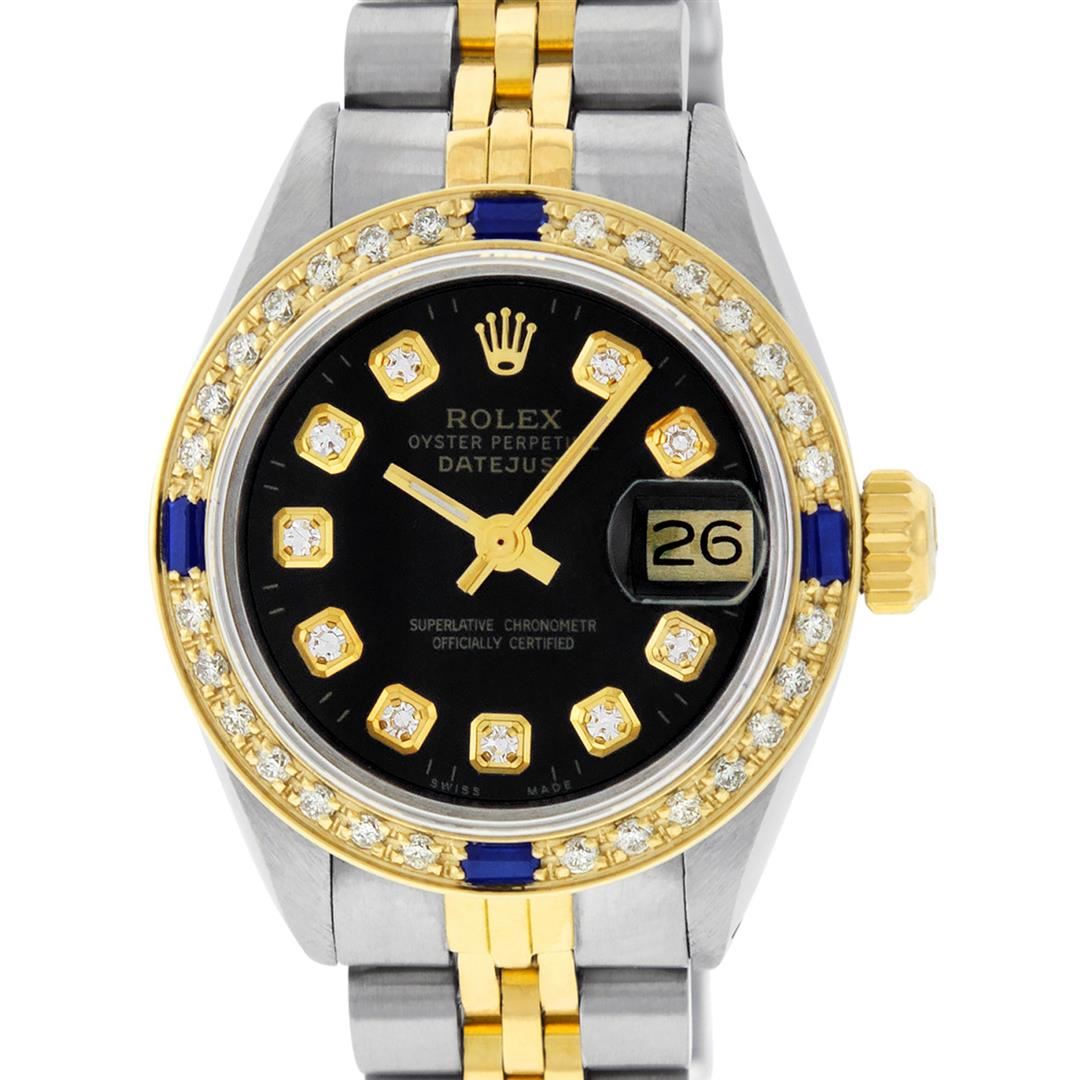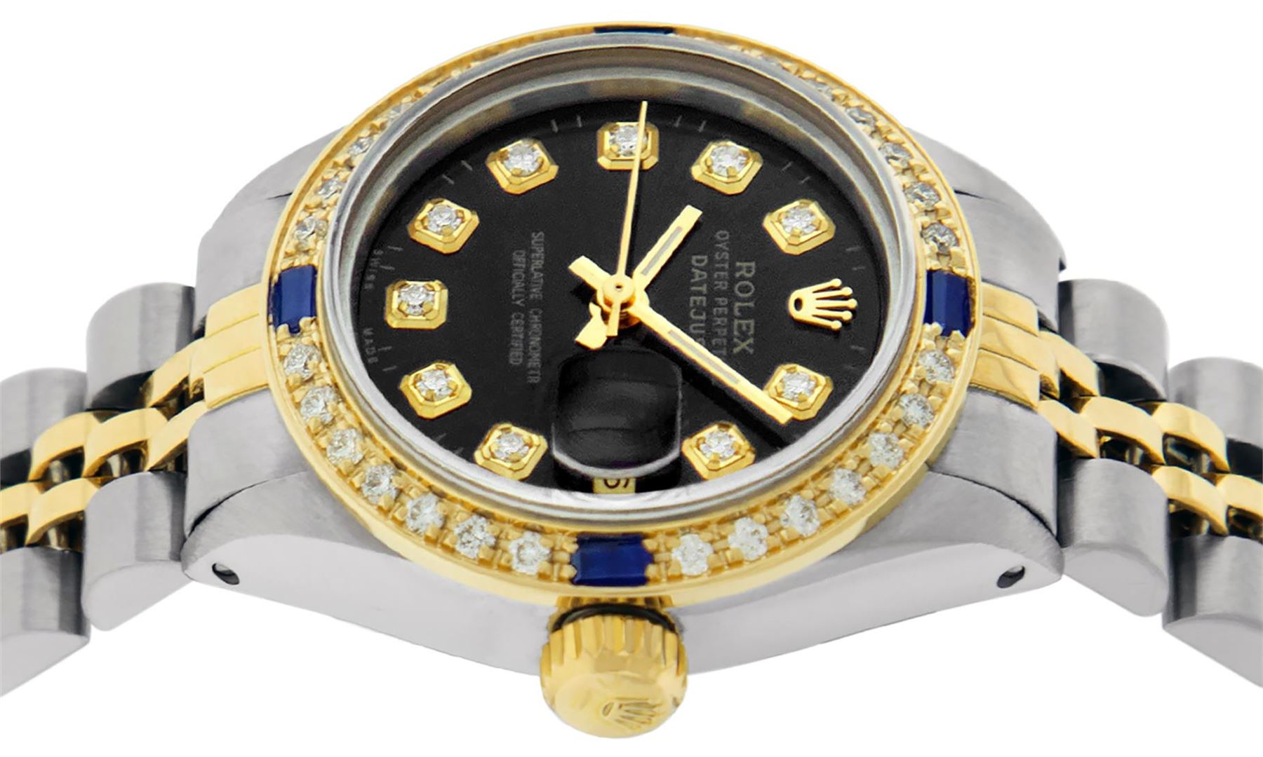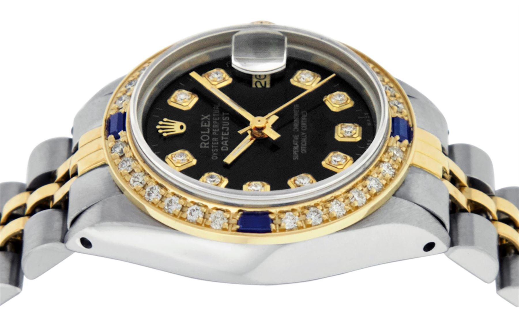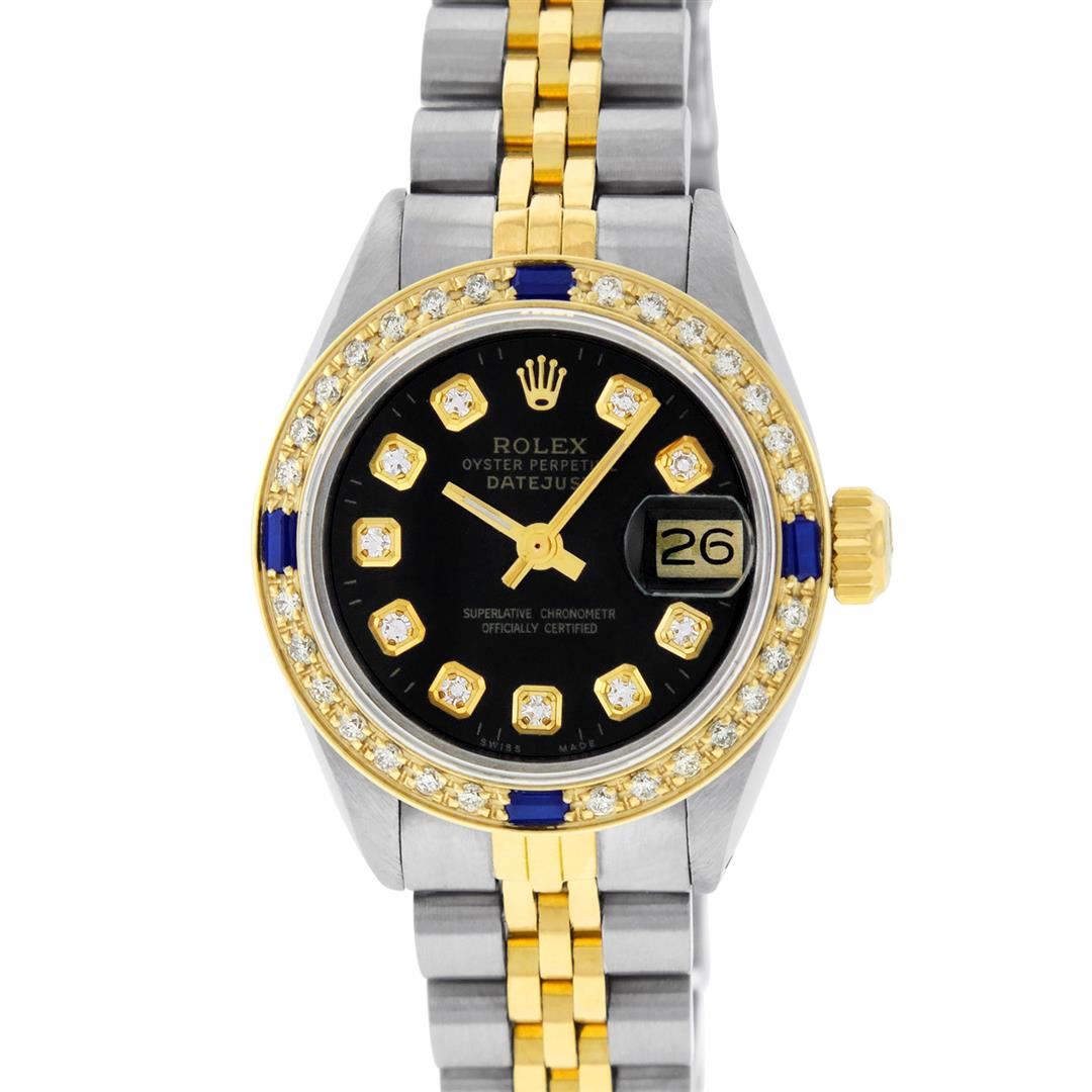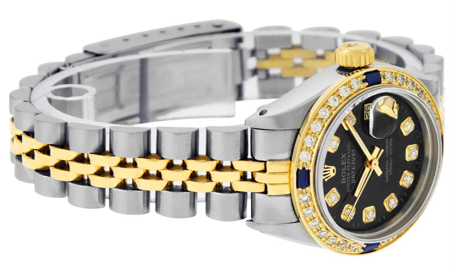 One Ladies 14K Two Tone Rolex Datejust Polished, Serviced & Electronically Tested, 14K Yellow Gold & Stainless Steel Case: 26mm, 14K Yellow Gold Crown, Custom Bezel: New 18K Yellow Gold Sapphire Beadset Diamond Bezel, Diamond + Gem Count: 28 Diamonds + 4 Sapphires Total Bezel Weight .70 Carat, Clarity: Si-VS, Color: G to H. Custom Crystal: New Scratch Resistant Synthetic Sapphire Cyclops Lens. Custom Hands: New Luminescent Hands. Movement: Automatic Winding Movement Caliber 2030. Custom Dial: Black Dial Set With Single Cut Diamond Hour Markers & Dash Track, Diamond Count: 10 Diamond in Dial, G To H In Color, SI-VS Clarity. Date Window: 3 O'Clock Position Date Display, Model: Datejust, Condition: G-6 Extra Fine. Bracelet: Two Tone 14K Yellow Gold & Stainless Steel Jubilee Band. Bright Polish. 6.0 Inch Length, Adjustable. Standard Clasp, With Rolex Logo. This Watch Has Been Serviced Time Tested And Is In Excellent Condition It Is Free Of All Scratches And Dents.