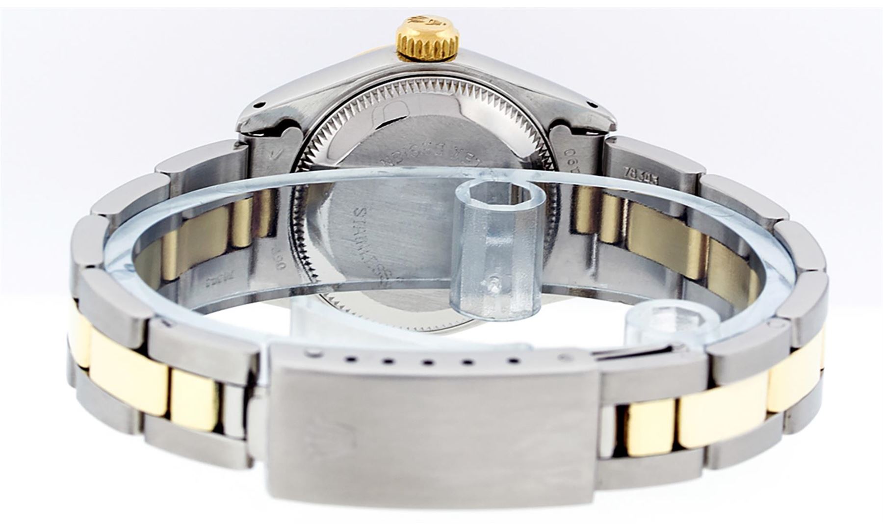 One Ladies Two Tone Rolex Datejust Polished, Serviced & Electronically Tested, Yellow Gold & Stainless Steel Case: 26mm, Yellow Gold Crown, Bezel: Yellow Gold Fluted Bezel. Custom Crystal: New Acrylic Cyclops Lens. Custom Hands: Custom Luminescent Hands.