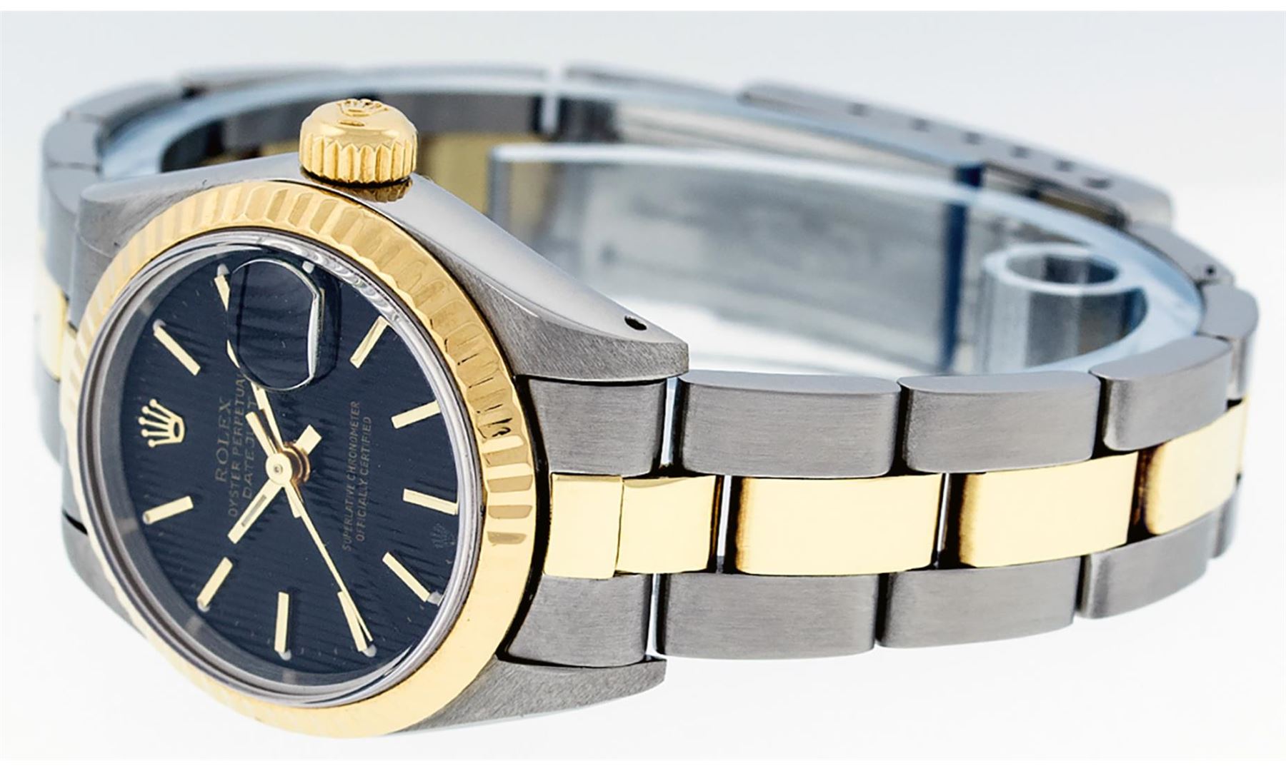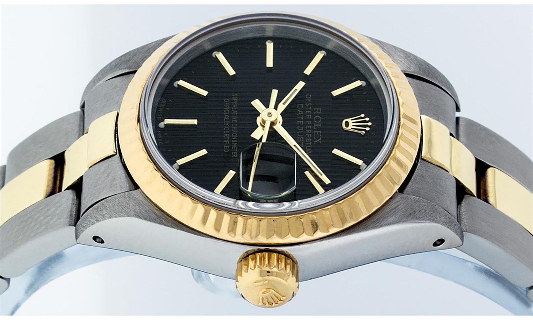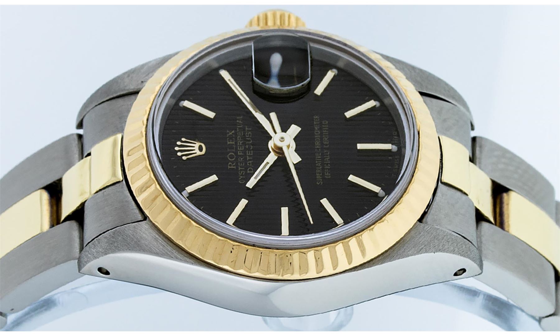 One Ladies Pre Owned Two Tone 14K Yellow Gold And Stainless Steel Rolex Polished, Serviced & Electronically Tested, Rolex Yellow Gold & Stainless Steel Case: 26mm, Yellow Gold Crown, Rolex Bezel: 14K Yellow Gold Fluted Bezel. Crystal: Plexiglass With Magnified Date Window. Hands: Luminescent Hands. Rolex Movement: Automatic Winding Movement 2030. Rolex Dial: Black Tapestry With Index Hour Markers. Date Window: 3 O'Clock Position Date Display, Model: Date. Condition: G-6 Extra Fine. Rolex Bracelet: Two Tone 14K Yellow Gold & Stainless Steel Oyster Band. Bright Polish. 6.0 Inch Length, Adjustable. Standard Clasp, With Rolex Logo. This Watch Has Been Serviced Time Tested And Is In Excellent Condition It Is Free Of All Scratches And Dents.