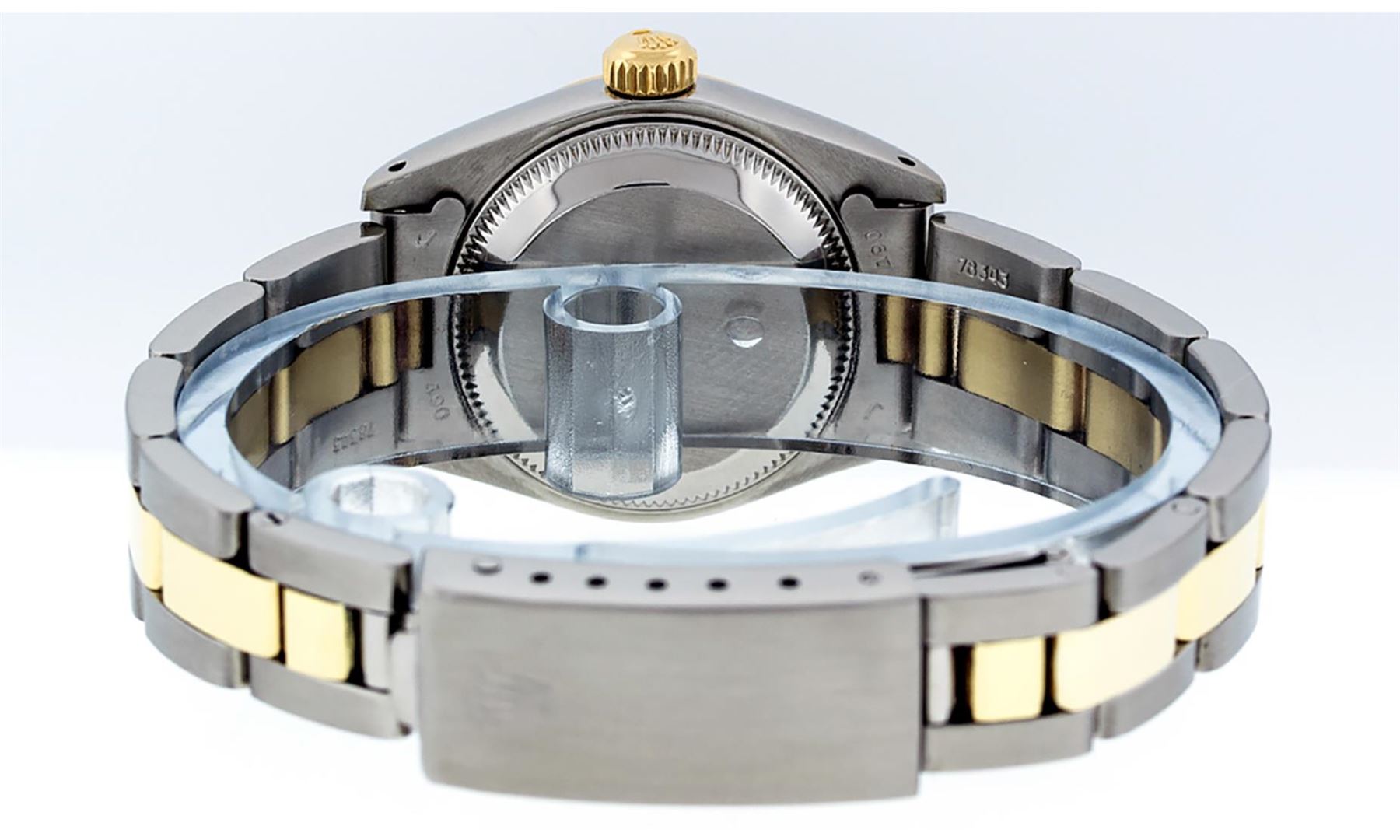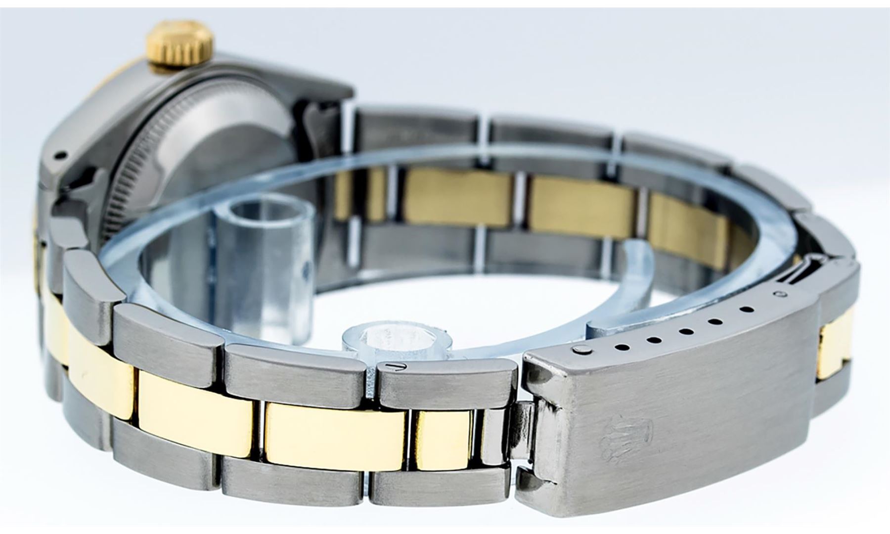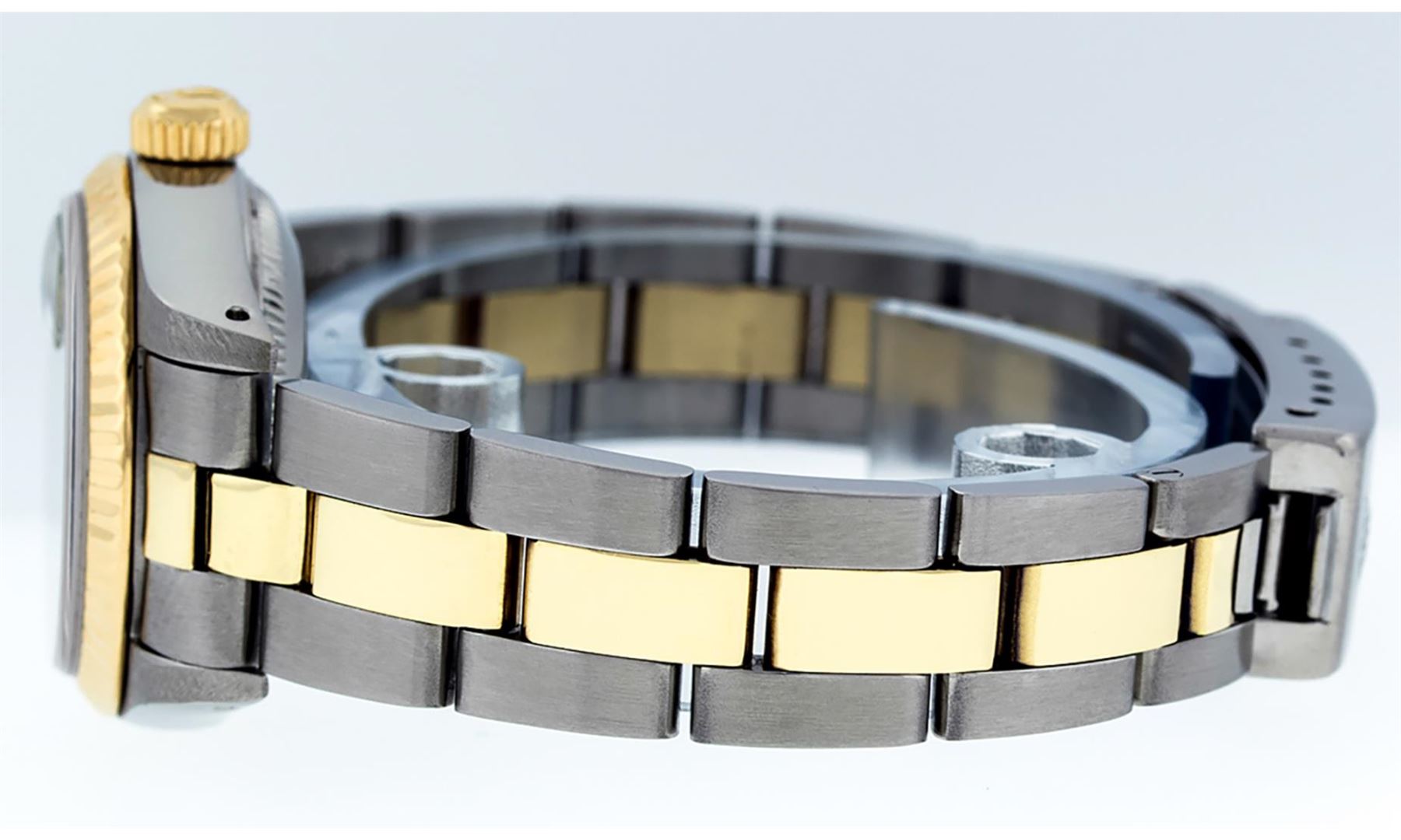 One Ladies Pre Owned Two Tone 14K Yellow Gold And Stainless Steel Rolex Polished, Serviced & Electronically Tested, Rolex Yellow Gold & Stainless Steel Case: 26mm, Yellow Gold Crown, Rolex Bezel: 14K Yellow Gold Fluted Bezel. Crystal: Plexiglass With Magnified Date Window. Hands: Luminescent Hands. Rolex Movement: Automatic Winding Movement 2030. Rolex Dial: Black Tapestry With Index Hour Markers. Date Window: 3 O'Clock Position Date Display, Model: Date. Condition: G-6 Extra Fine. Rolex Bracelet: Two Tone 14K Yellow Gold & Stainless Steel Oyster Band. Bright Polish. 6.0 Inch Length, Adjustable. Standard Clasp, With Rolex Logo. This Watch Has Been Serviced Time Tested And Is In Excellent Condition It Is Free Of All Scratches And Dents.