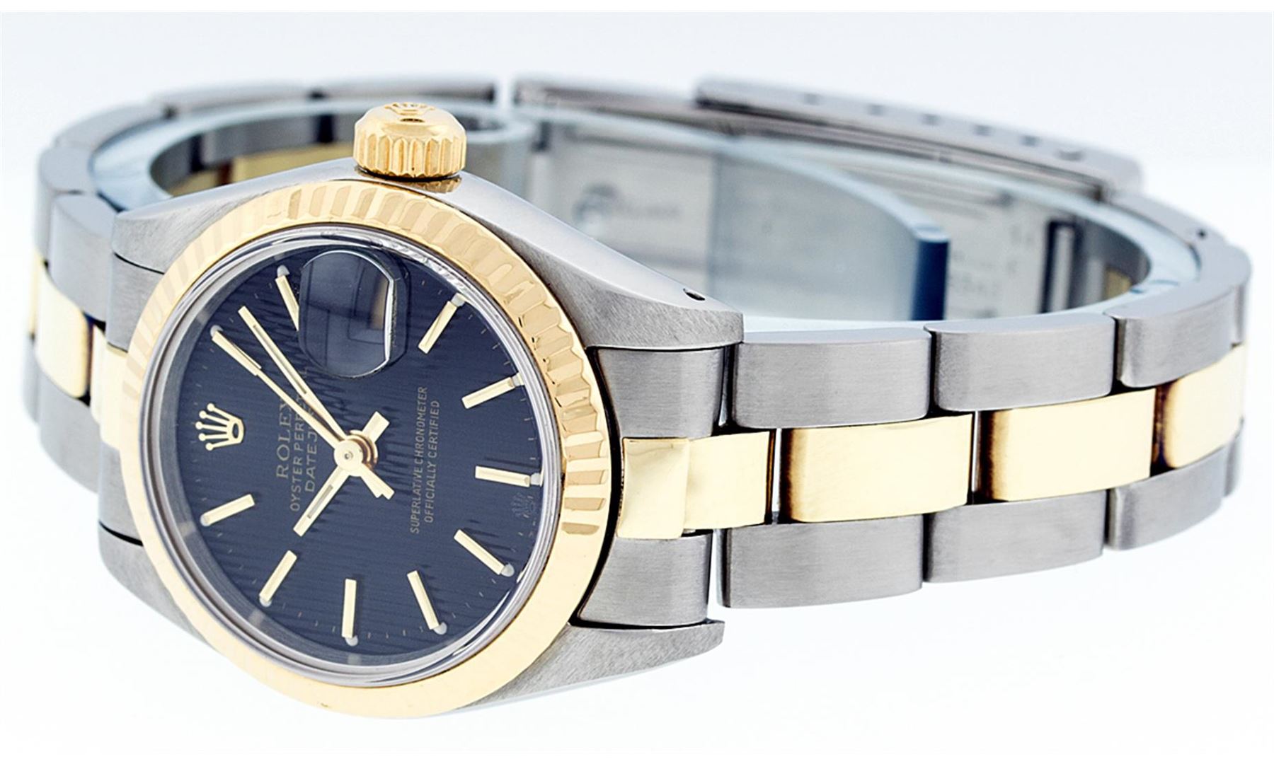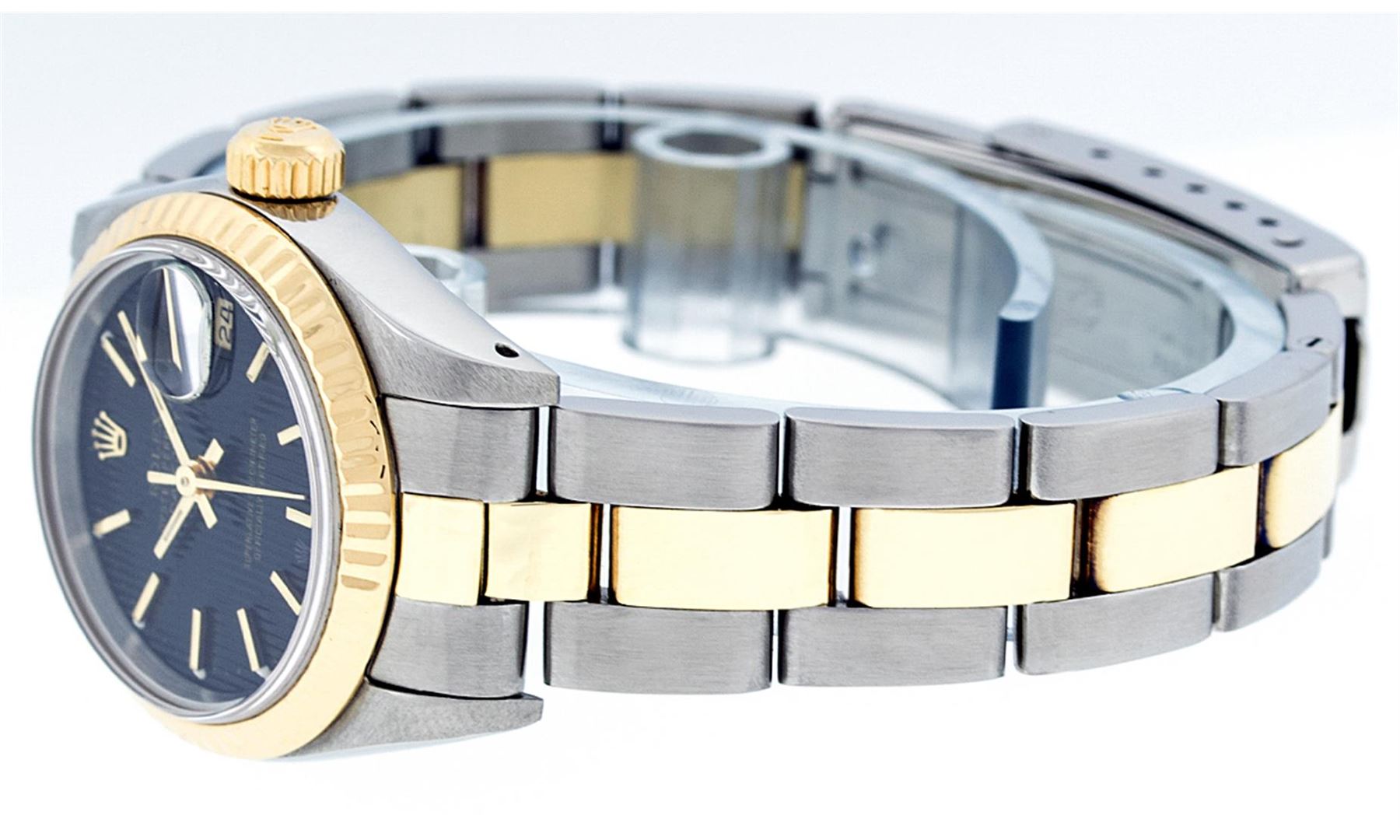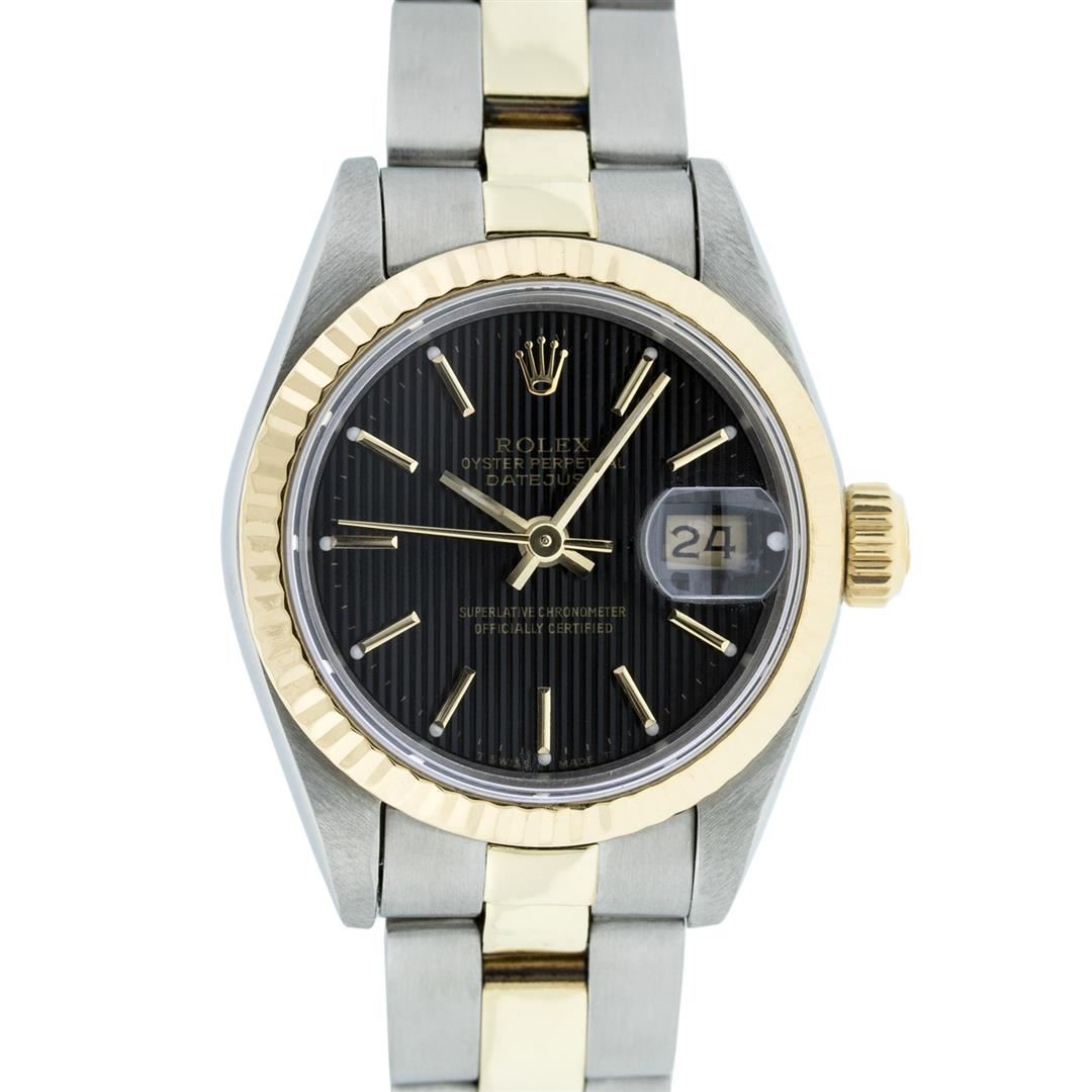 One Ladies Pre Owned Two Tone Yellow Gold And Stainless Steel Rolex Datejust Polished, Serviced & Electronically Tested, Rolex Yellow Gold & Stainless Steel Case: 26mm, Yellow Gold Crown, Rolex Bezel: Yellow Gold Fluted Bezel. Custom Crystal: New Acrylic Cyclops Lens. Hands: Luminescent Hands. Rolex Movement: Automatic Winding Movement. Dial: Black Tapestry With Index Hour Markers. Date Window: 3 O'Clock Position Date Display, Model: Datejust. Condition: G-6 Extra Fine. Rolex Bracelet: Two Tone Yellow Gold & Stainless Steel Oyster Band. Bright Polish. 6.0 Inch Length, Adjustable. Standard Clasp, With Rolex Logo. This Watch Has Been Serviced Time Tested And Is In Excellent Condition It Is Free Of All Scratches And Dents.