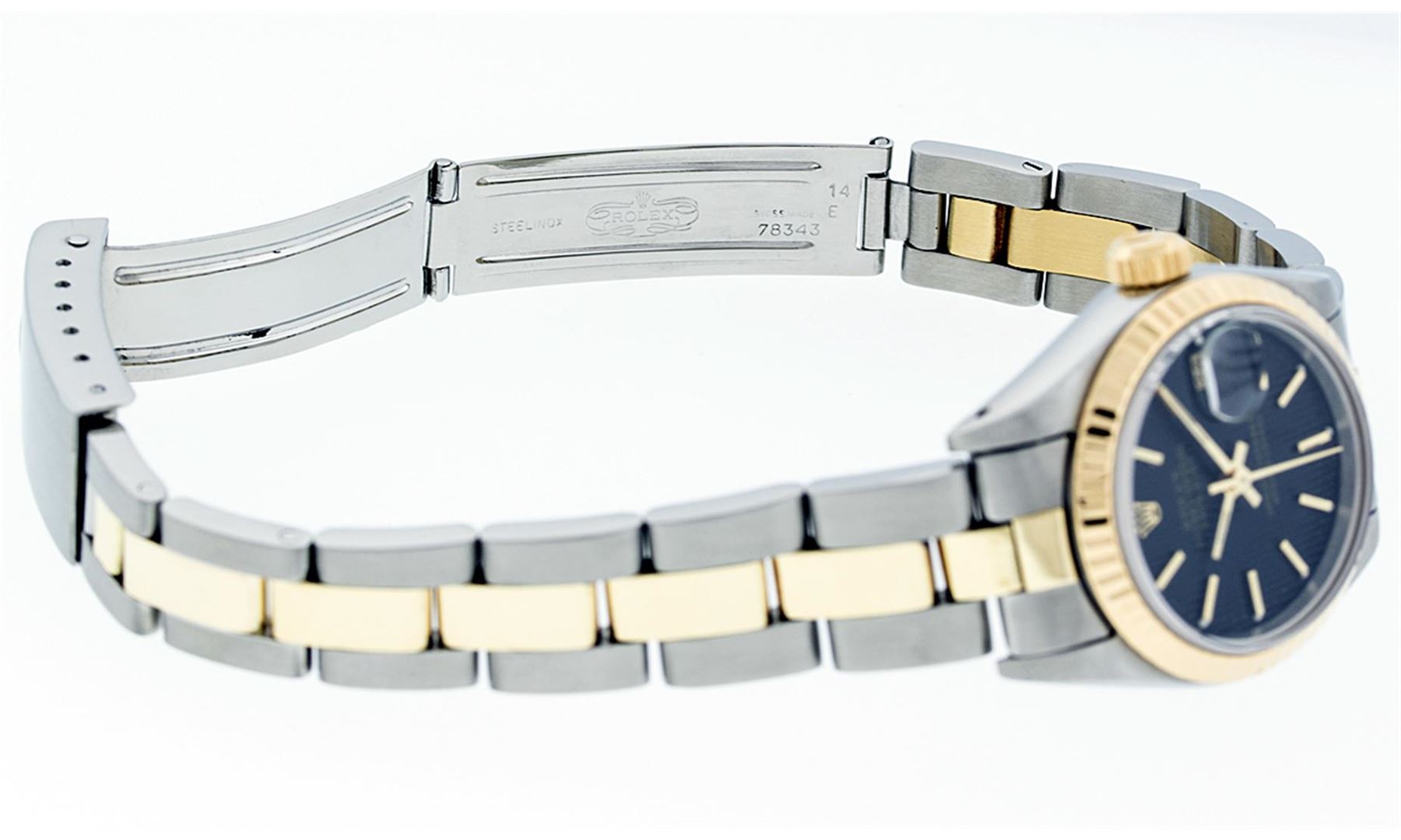One Ladies Pre Owned Two Tone Yellow Gold And Stainless Steel Rolex Datejust Polished, Serviced & Electronically Tested, Rolex Yellow Gold & Stainless Steel Case: 26mm, Yellow Gold Crown, Rolex Bezel: Yellow Gold Fluted Bezel. Custom Crystal: New Acrylic Cyclops Lens. Hands: Luminescent Hands. Rolex Movement: Automatic Winding Movement. Dial: Black Tapestry With Index Hour Markers. Date Window: 3 O'Clock Position Date Display, Model: Datejust. Condition: G-6 Extra Fine. Rolex Bracelet: Two Tone Yellow Gold & Stainless Steel Oyster Band. Bright Polish. 6.0 Inch Length, Adjustable. Standard Clasp, With Rolex Logo. This Watch Has Been Serviced Time Tested And Is In Excellent Condition It Is Free Of All Scratches And Dents.