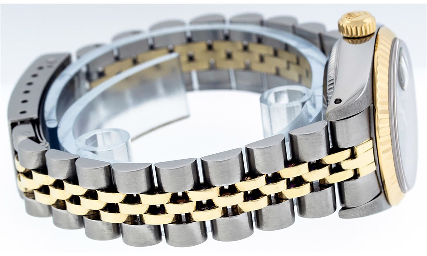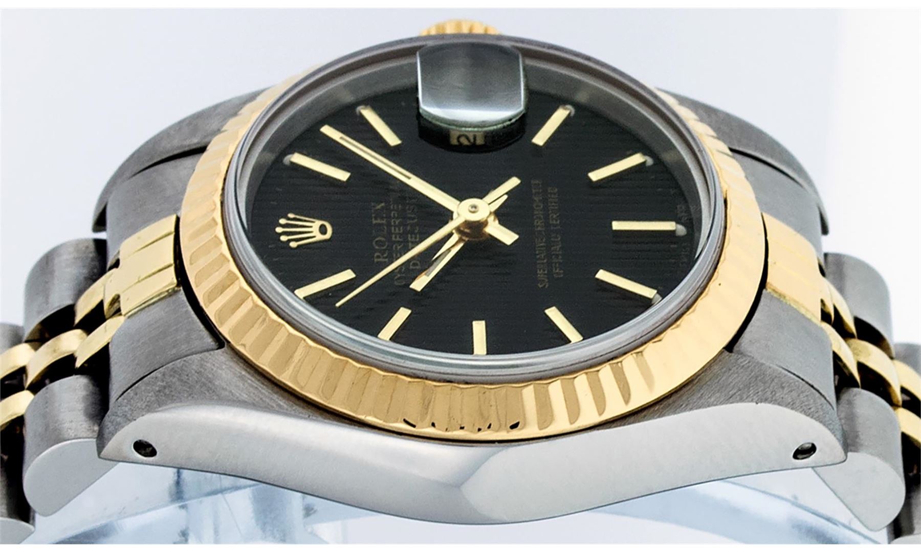 One Ladies Two Tone Rolex Datejust Polished, Serviced & Electronically Tested, Yellow Gold & Stainless Steel Case: 26mm, Yellow Gold Crown, Bezel: Yellow Gold Fluted Bezel. Custom Crystal: New Acrylic Cyclops Lens. Hands: Luminescent Hands. Movement: Auto