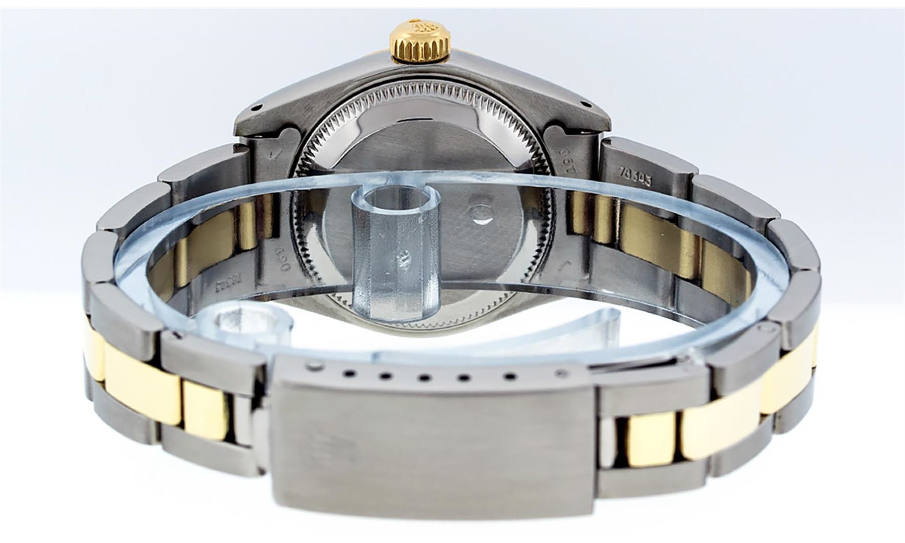 One Ladies Two Tone Yellow Gold And Stainless Steel Rolex Datejust Polished, Serviced & Electronically Tested, Yellow Gold & Stainless Steel Case: 26mm, Yellow Gold Crown, Bezel: Yellow Gold Fluted Bezel. Custom Crystal: New Acrylic Cyclops Lens. Hands: Luminescent Hands. Movement: Automatic Winding Movement. Dial: Black Tapestry With Index Hour Markers. Date Window: 3 O'Clock Position Date Display, Model: Datejust. Condition: G-6 Extra Fine. Bracelet: Two Tone Yellow Gold & Stainless Steel Oyster Band. Bright Polish. 6.0 Inch Length, Adjustable. Standard Clasp, With Rolex Logo. This Watch Has Been Serviced Time Tested And Is In Excellent Condition It Is Free Of All Scratches And Dents.