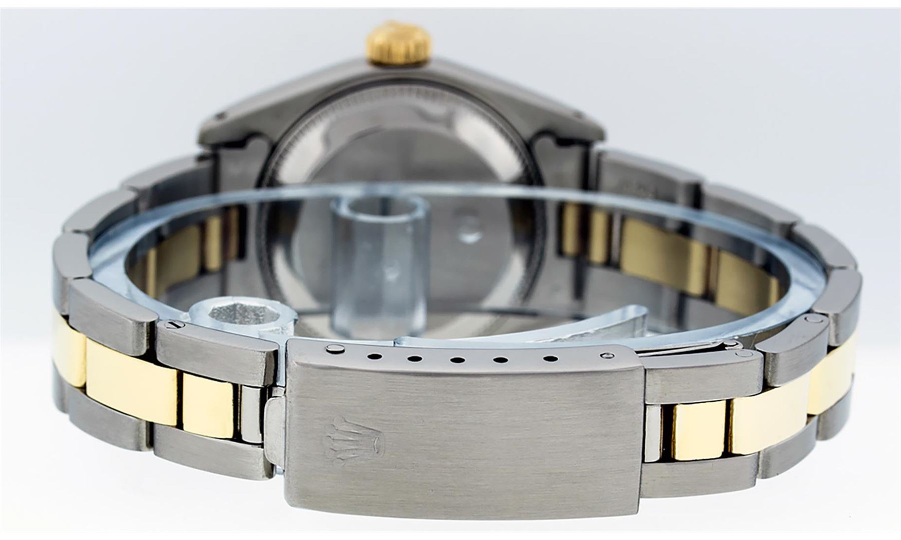 One Ladies Two Tone Yellow Gold And Stainless Steel Rolex Datejust Polished, Serviced & Electronically Tested, Yellow Gold & Stainless Steel Case: 26mm, Yellow Gold Crown, Bezel: Yellow Gold Fluted Bezel. Custom Crystal: New Acrylic Cyclops Lens. Hands: Luminescent Hands. Movement: Automatic Winding Movement. Dial: Black Tapestry With Index Hour Markers. Date Window: 3 O'Clock Position Date Display, Model: Datejust. Condition: G-6 Extra Fine. Bracelet: Two Tone Yellow Gold & Stainless Steel Oyster Band. Bright Polish. 6.0 Inch Length, Adjustable. Standard Clasp, With Rolex Logo. This Watch Has Been Serviced Time Tested And Is In Excellent Condition It Is Free Of All Scratches And Dents.