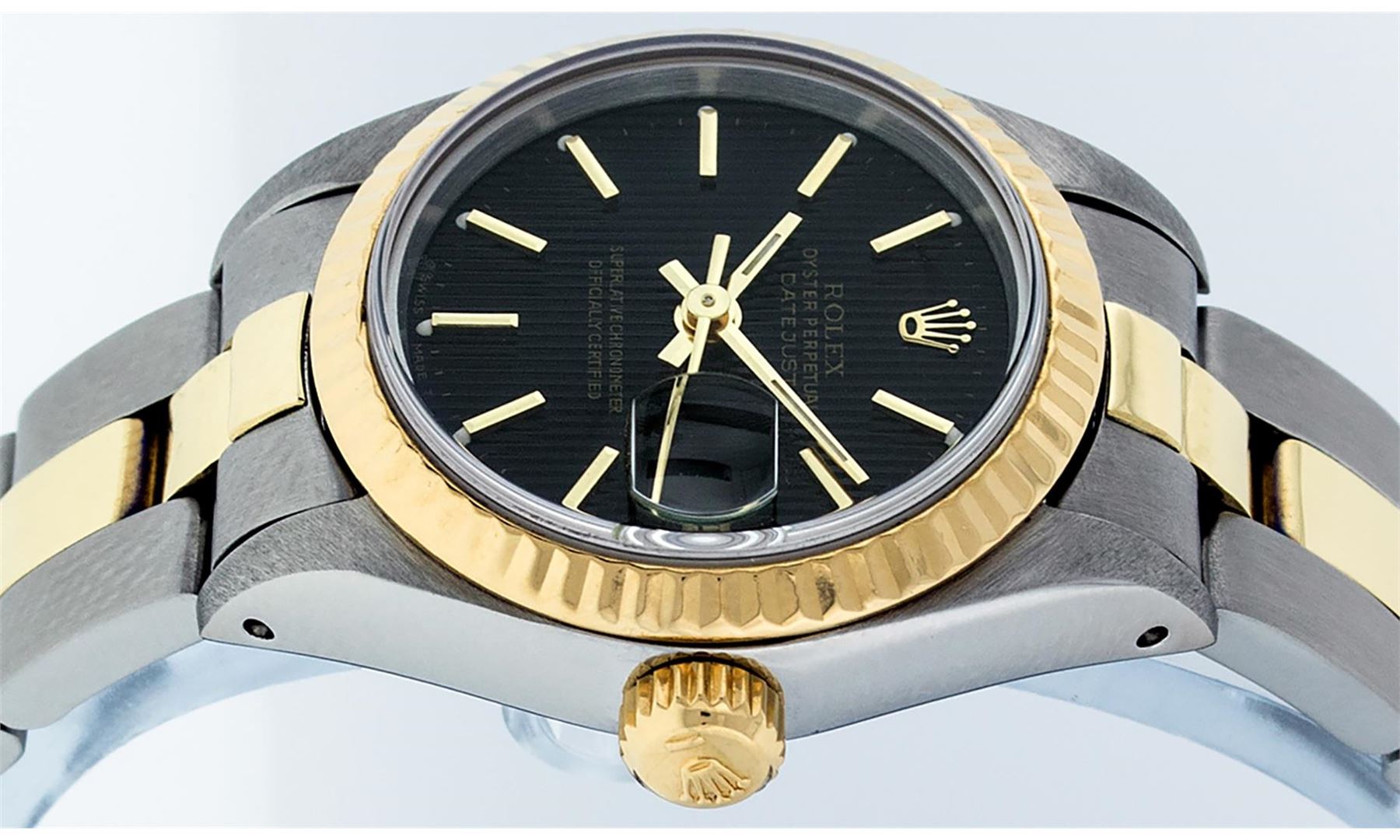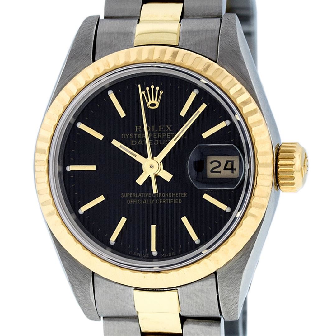 One Ladies Two Tone Yellow Gold And Stainless Steel Rolex Datejust Polished, Serviced & Electronically Tested, Yellow Gold & Stainless Steel Case: 26mm, Yellow Gold Crown, Bezel: Yellow Gold Fluted Bezel. Custom Crystal: New Acrylic Cyclops Lens. Hands: Luminescent Hands. Movement: Automatic Winding Movement. Dial: Black Tapestry With Index Hour Markers. Date Window: 3 O'Clock Position Date Display, Model: Datejust. Condition: G-6 Extra Fine. Bracelet: Two Tone Yellow Gold & Stainless Steel Oyster Band. Bright Polish. 6.0 Inch Length, Adjustable. Standard Clasp, With Rolex Logo. This Watch Has Been Serviced Time Tested And Is In Excellent Condition It Is Free Of All Scratches And Dents.