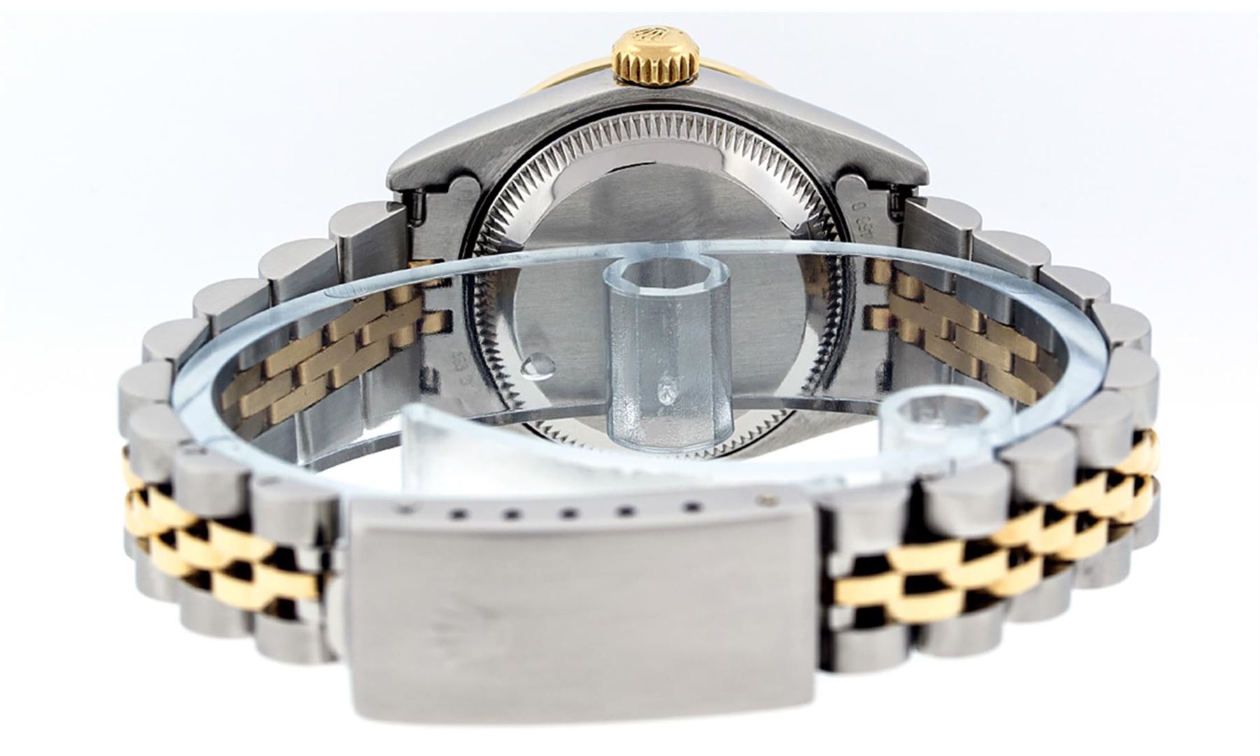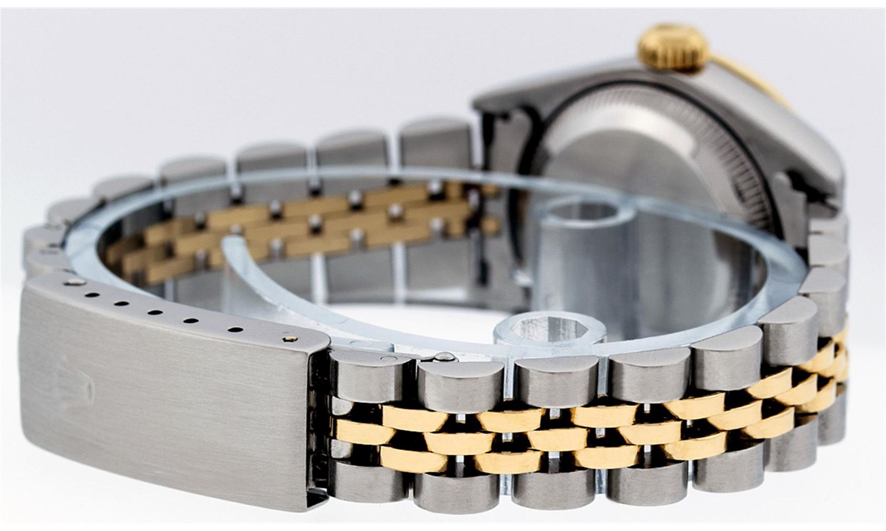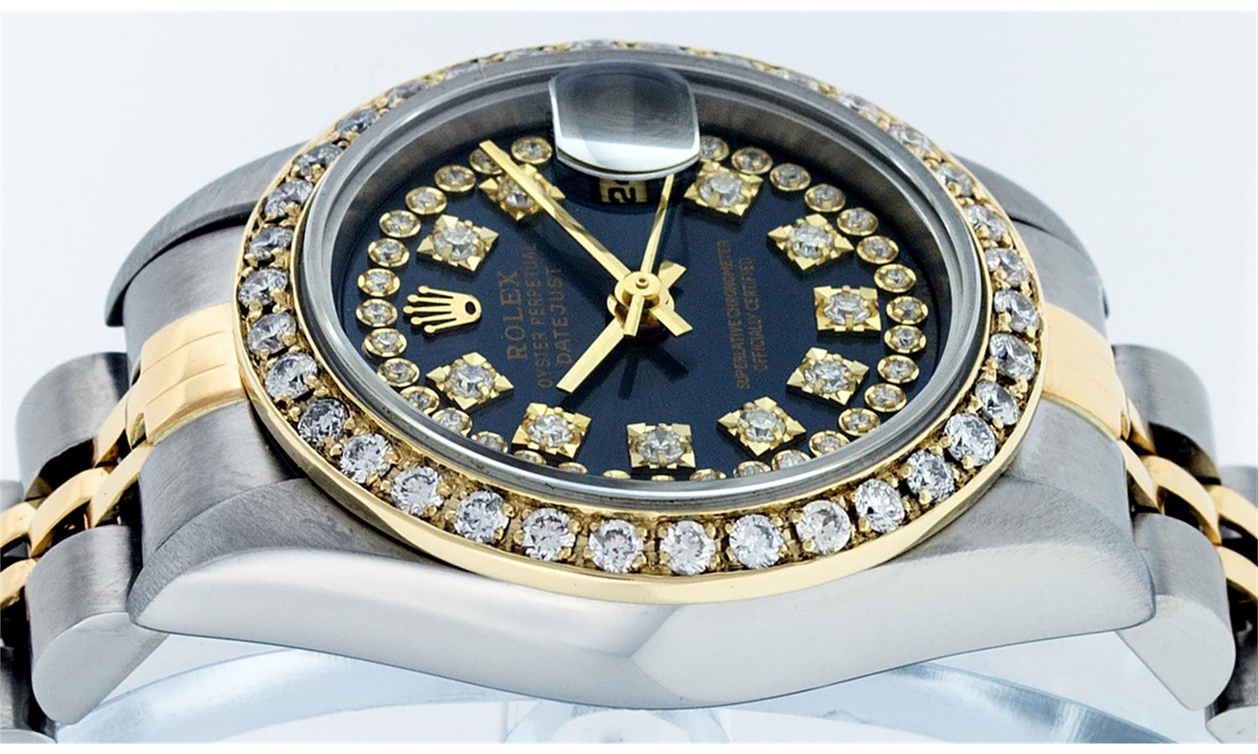 One Ladies 18K Two Tone Quickset Rolex Datejust Polished, Serviced & Electronically Tested, 18K Yellow Gold & Stainless Steel Case: 26mm, 18K Yellow Gold Crown, Custom Bezel: New 18K Yellow Gold Beadset Diamond Bezel, Diamond Count: 43 Diamonds in Dial, Total Weight .70 Carat, Clarity: SI-VS, Color: G to H. Custom Crystal: New Synthetic Sapphire Cyclops Lens. Custom Hands: New Luminescent Hands. Movement: Quickset Automatic Winding Movement . Custom Dial: Blue String VS Diamond Dial, Stone Count: 43 Diamonds, Clarity: VS, Color: G to H. Date Window: 3 O'Clock Position Date Display, Model: Datejust. Condition: G-6 Extra Fine. Bracelet: Two Tone 18K Yellow Gold & Stainless Steel Jubilee Band. Bright Polish. 6.0 Inch Length, Adjustable. Standard Clasp, With Rolex Logo. This Watch Has Been Serviced Time Tested And Is In Excellent Condition It Is Free Of All Scratches And Dents.
