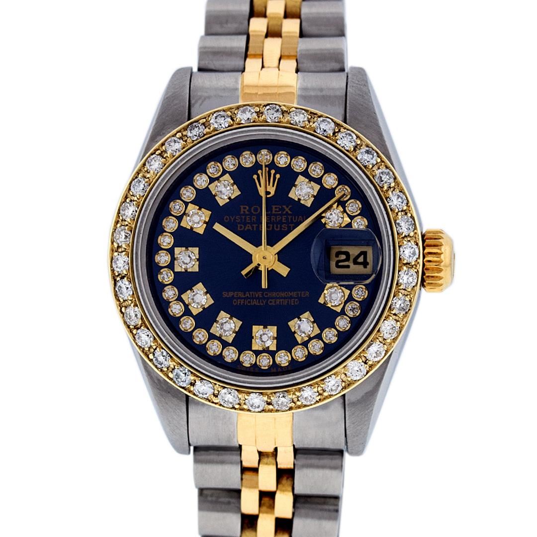 One Ladies 18K Two Tone Quickset Rolex Datejust Polished, Serviced & Electronically Tested, 18K Yellow Gold & Stainless Steel Case: 26mm, 18K Yellow Gold Crown, Custom Bezel: New 18K Yellow Gold Beadset Diamond Bezel, Diamond Count: 43 Diamonds in Dial, Total Weight .70 Carat, Clarity: SI-VS, Color: G to H. Custom Crystal: New Synthetic Sapphire Cyclops Lens. Custom Hands: New Luminescent Hands. Movement: Quickset Automatic Winding Movement . Custom Dial: Blue String VS Diamond Dial, Stone Count: 43 Diamonds, Clarity: VS, Color: G to H. Date Window: 3 O'Clock Position Date Display, Model: Datejust. Condition: G-6 Extra Fine. Bracelet: Two Tone 18K Yellow Gold & Stainless Steel Jubilee Band. Bright Polish. 6.0 Inch Length, Adjustable. Standard Clasp, With Rolex Logo. This Watch Has Been Serviced Time Tested And Is In Excellent Condition It Is Free Of All Scratches And Dents.