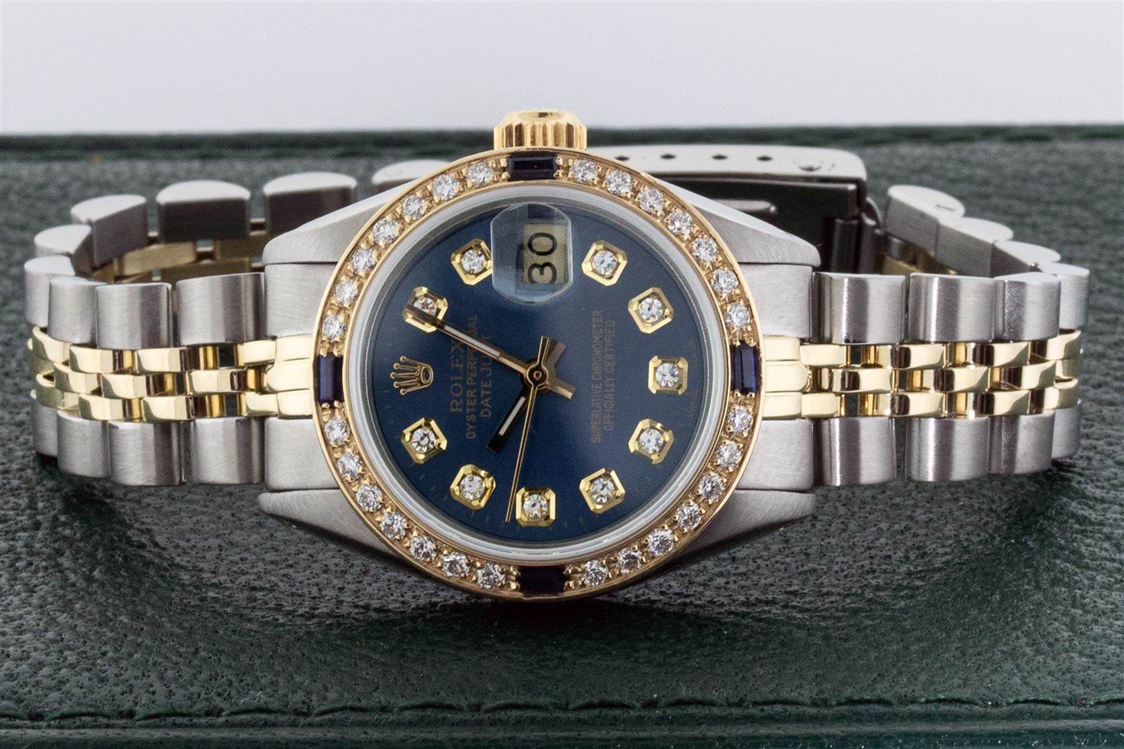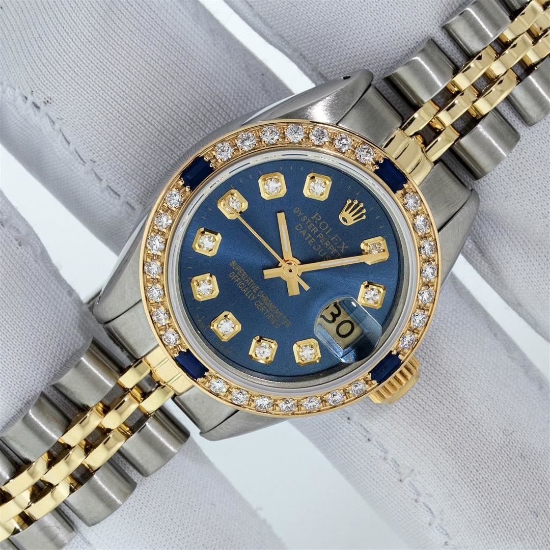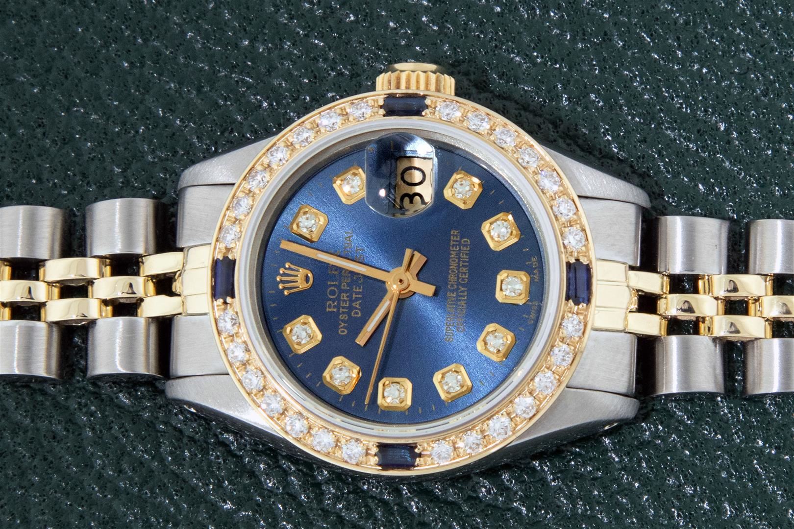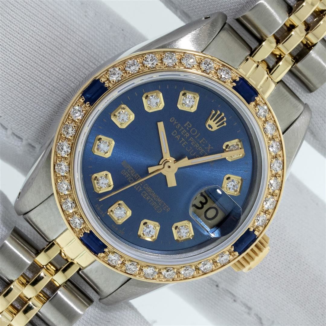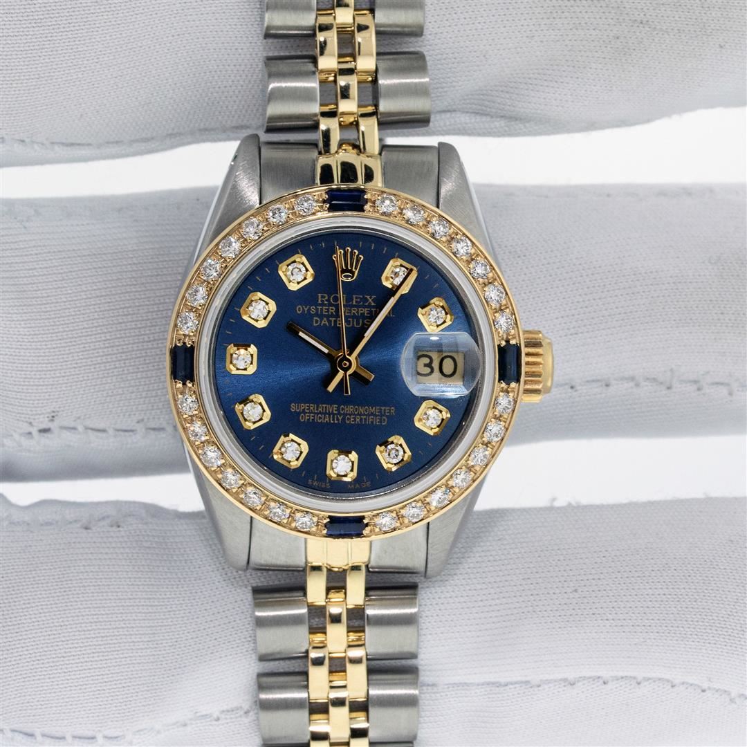 One Ladies Two Tone Rolex Oyster Perpetual Datejust Polished, Serviced & Electronically Tested, Rolex Yellow Gold & Stainless Steel Case: 26mm, Rolex Yellow Gold Crown, Custom Bezel: New 18K Yellow Gold Sapphire Beadset Diamond Bezel, Diamond + Gem Count: 28 Diamonds + 4 Sapphires Total Weight .70 Carat, Clarity: SI-VS, Color: G to H. Custom Crystal: Sapphire With Magnified Date Window. Custom Hands: New Luminescent Hands. Rolex Movement: Automatic Winding Movement. Custom Dial: Refinished To Blue With Added Diamond Hour Markers, Diamond Count: 10 Diamond in Dial, G To H In Color, SI-VS Clarity. Date Window: 3 O'clock Position Date Display, Model: Datejust, Condition: G-6 Extra Fine. Rolex Bracelet: Two Tone Yellow Gold & Stainless Steel Jubilee Band. Bright Polish. 6.0 Inch Length, Adjustable. Standard Clasp, With Rolex Logo. This Pre Owned Watch Has Been Serviced Time Tested And Is In Excellent Condition It Is Free Of All Scratches And Dents. This Watch Comes With A Rolex Box.