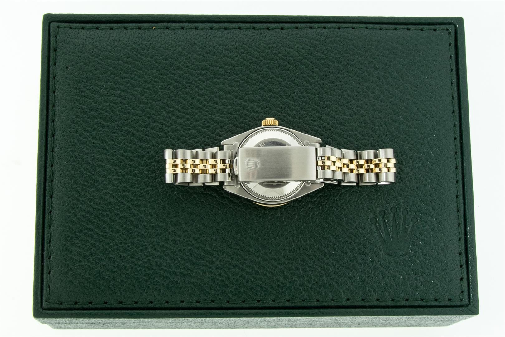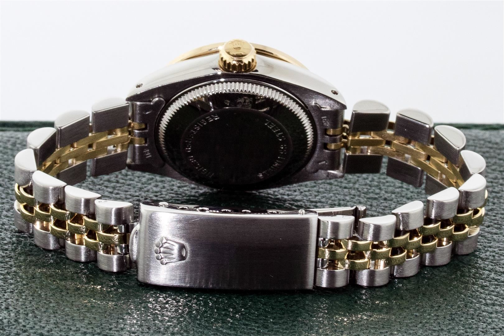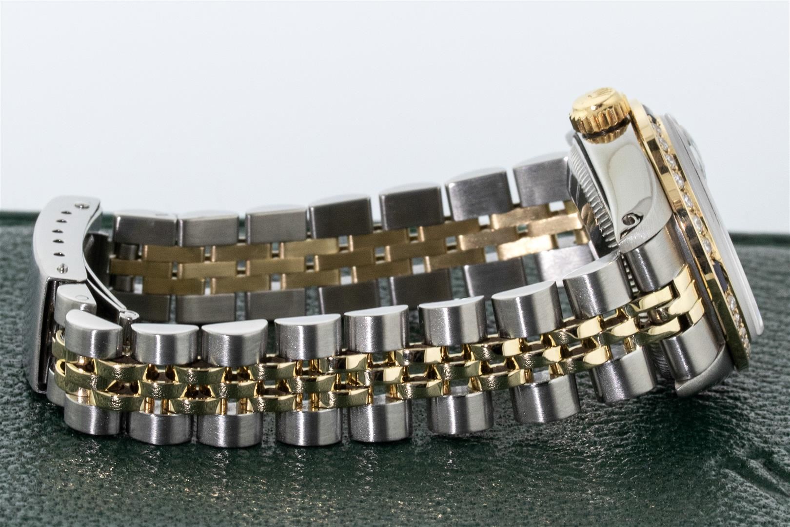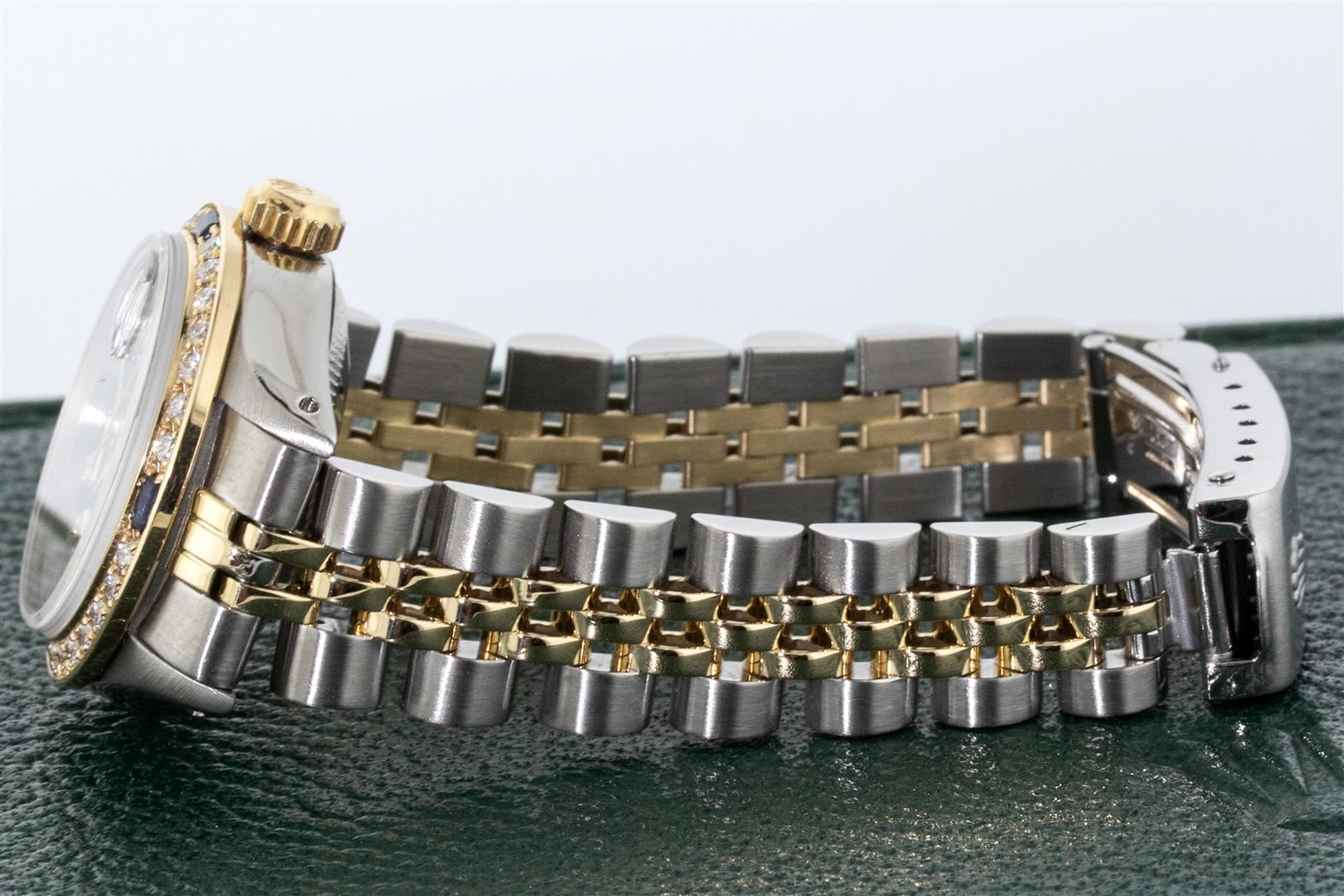 One Ladies Two Tone Rolex Oyster Perpetual Datejust Polished, Serviced & Electronically Tested, Rolex Yellow Gold & Stainless Steel Case: 26mm, Rolex Yellow Gold Crown, Custom Bezel: New 18K Yellow Gold Sapphire Beadset Diamond Bezel, Diamond + Gem Count: 28 Diamonds + 4 Sapphires Total Weight .70 Carat, Clarity: SI-VS, Color: G to H. Custom Crystal: Sapphire With Magnified Date Window. Custom Hands: New Luminescent Hands. Rolex Movement: Automatic Winding Movement. Custom Dial: Refinished To Blue With Added Diamond Hour Markers, Diamond Count: 10 Diamond in Dial, G To H In Color, SI-VS Clarity. Date Window: 3 O'clock Position Date Display, Model: Datejust, Condition: G-6 Extra Fine. Rolex Bracelet: Two Tone Yellow Gold & Stainless Steel Jubilee Band. Bright Polish. 6.0 Inch Length, Adjustable. Standard Clasp, With Rolex Logo. This Pre Owned Watch Has Been Serviced Time Tested And Is In Excellent Condition It Is Free Of All Scratches And Dents. This Watch Comes With A Rolex Box.