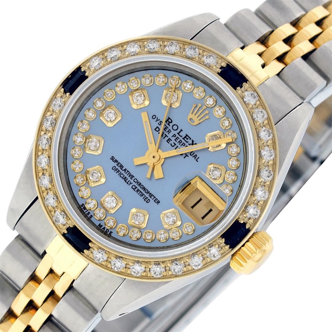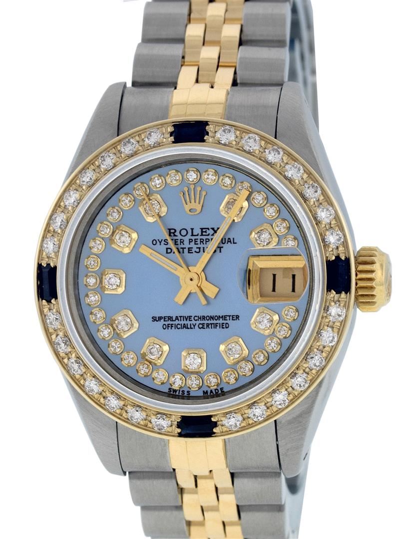 One Ladies Two Tone Rolex Datejust Polished, Serviced & Electronically Tested, Yellow Gold & Stainless Steel Case: 26mm, Yellow Gold Crown, Custom Bezel: 18K Yellow Gold Sapphire Beadset Diamond Bezel, Diamond Count: 28 Diamonds + 4 Sapphires. Total Weight .70 Carat, Clarity: Si-VS, Color: G to H. Custom Crystal: New Synthetic Sapphire Cyclops Lens. Custom Hands: New Luminescent Hands. Movement: Automatic Winding Movement. Custom Dial: Blue Mother Of Pearl With String Diamond Hour Markers. Diamond Count: 43 Diamonds In Dial, Clarity: SI-VS, Color: G to H. Date Window: 3 O'clock Position Date Display, Non Quickset, Model: Datejust. Condition: G-6 Extra Fine. Bracelet: Two Tone Yellow Gold & Stainless Steel Jubilee. Bright Polish. 6.0 Inch Length, Adjustable. Standard Clasp, With Rolex Logo.
