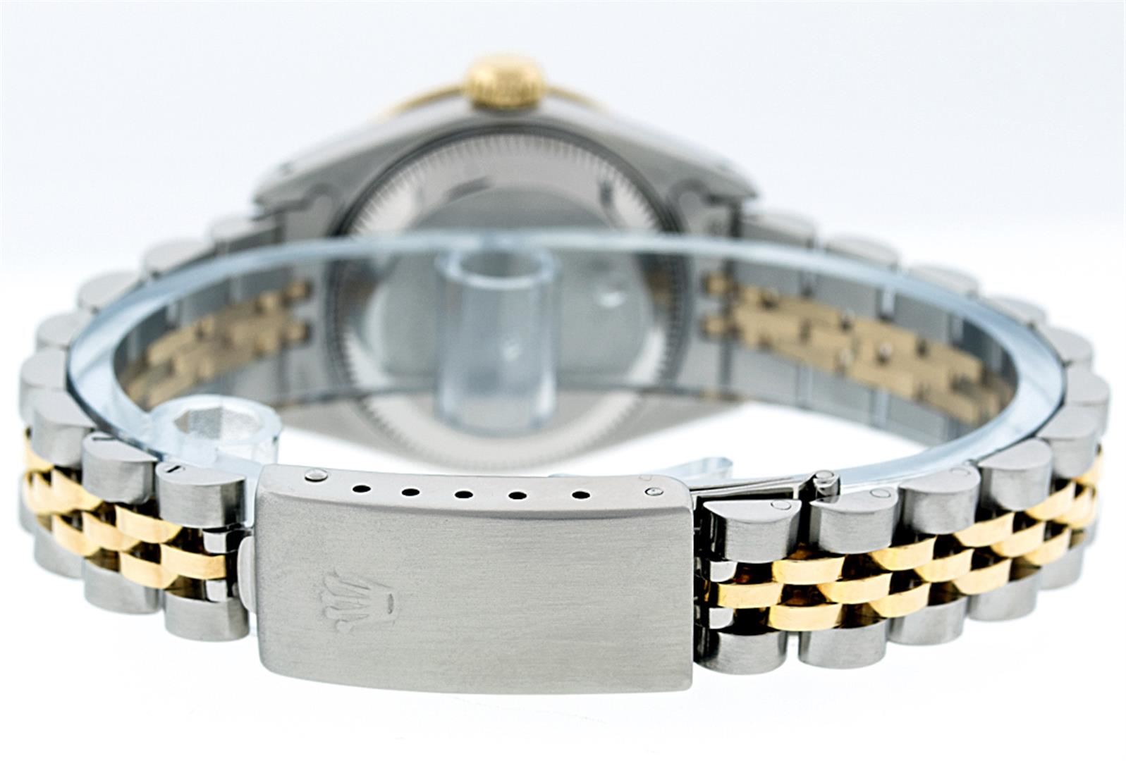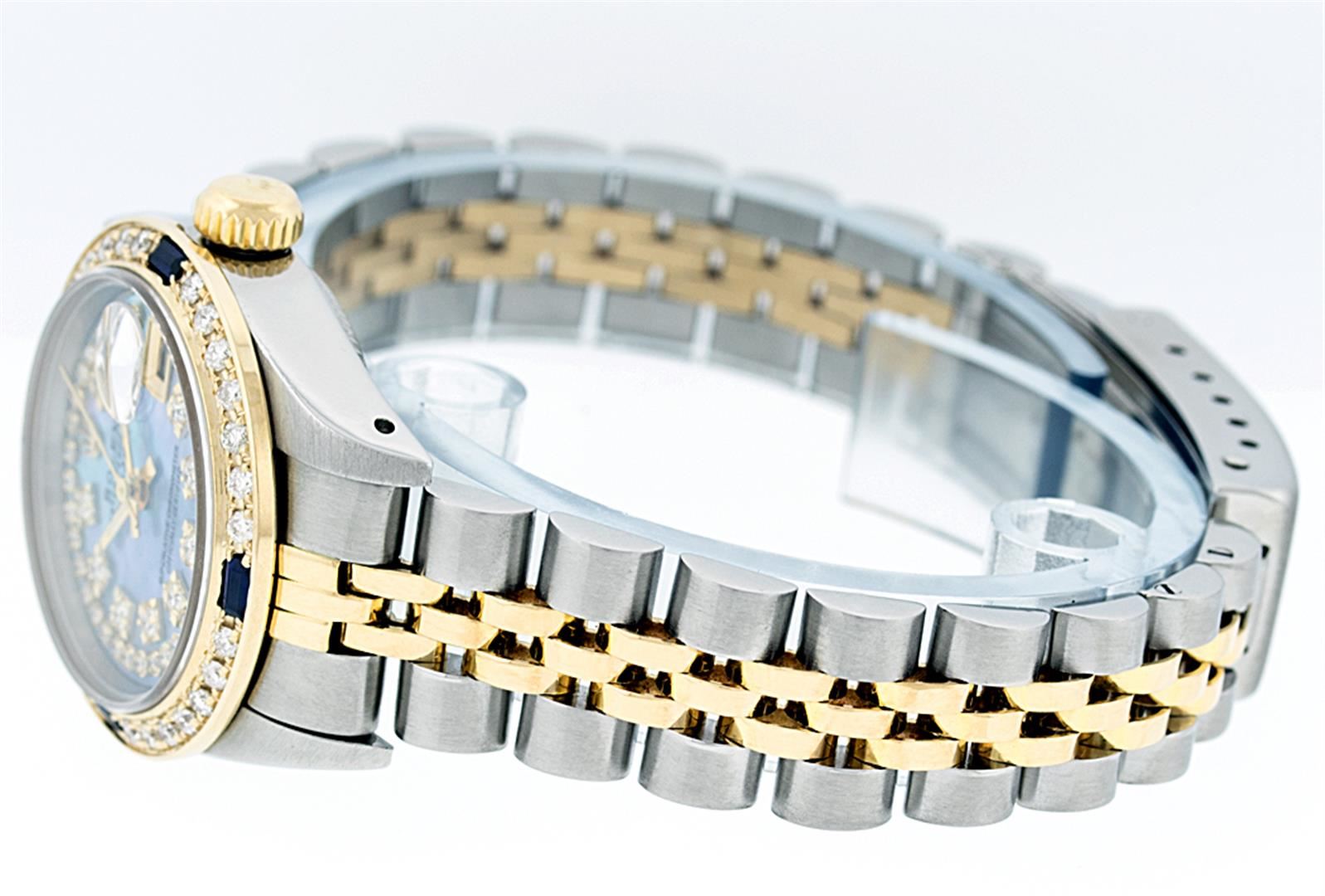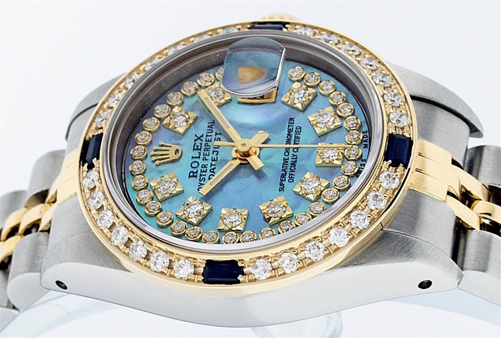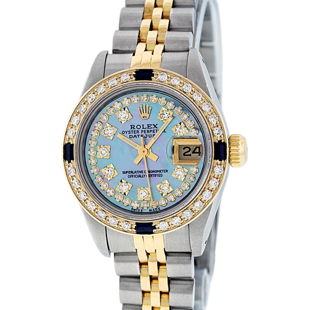 One Ladies Rolex Datejust Polished Bright with Satin Finish, Serviced & Electronically Tested, Stainless Steel Case:26mm, Yellow Gold Crown. Custom Bezel: 18K Yellow Gold Sapphire Beadset Bezel, Diamond Count: 28 Diamonds + 4 Sapphires, Total Weight 1.00 Carat, Clarity: SI-VS, Color: G to H. Custom Crystal: Synthetic Sapphire Cyclops Lens. Movement: Automatic Winding Movement Caliber 2135. Custom Dial: Refinished Blue MOP String Diamond Dial, Diamond Count: 43 Diamonds in Dial G To H In Color, Clarity: VS. Date Window: 3 O'Clock Position Date Display, Quickset, Model: Datejust Condition: G-6 Extra Fine. Bracelet: 18K Yellow Gold & Stainless Steel Jubilee. Bright Polish & Satin Finish. 6.0Inch Length, Adjustable. Standard Clasp, With Rolex Logo.