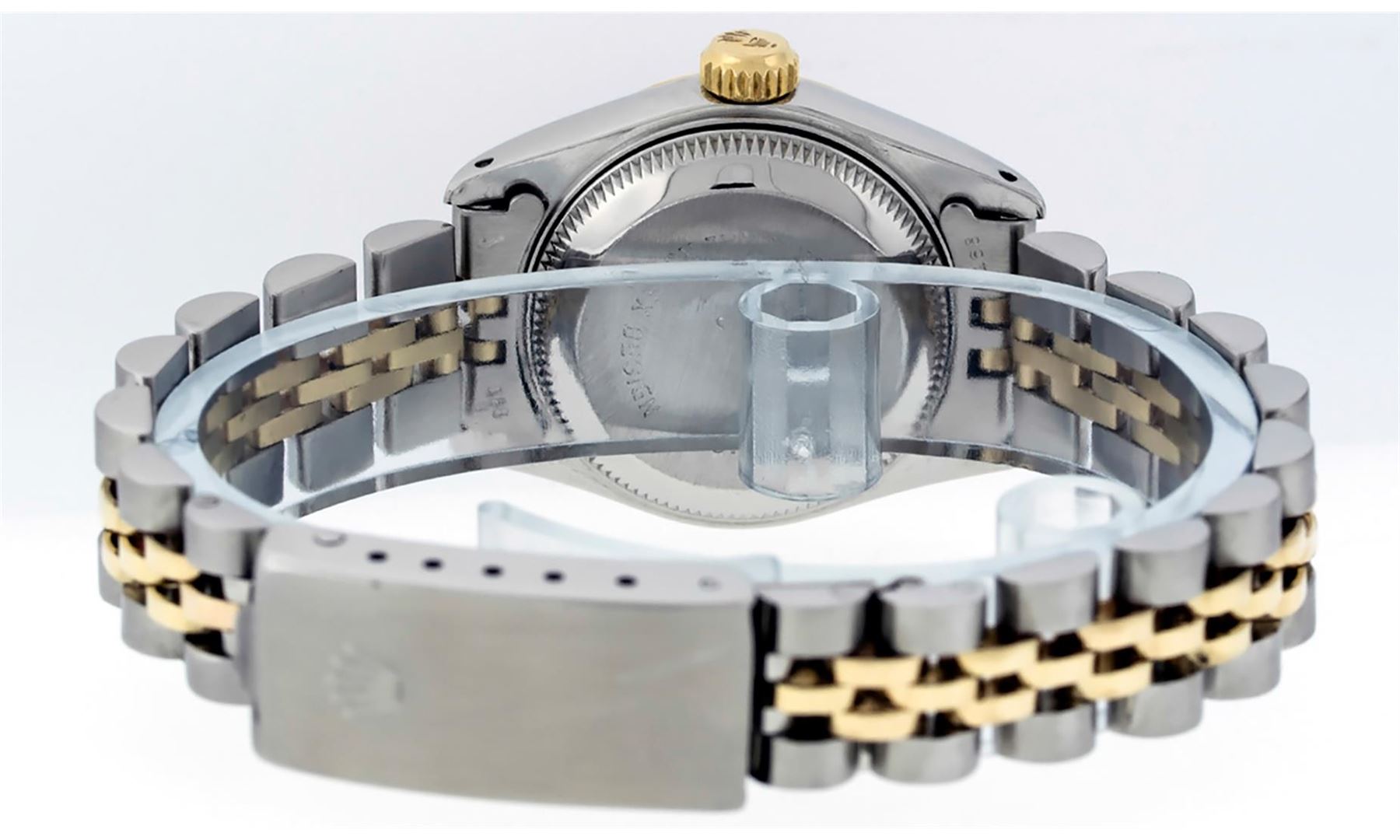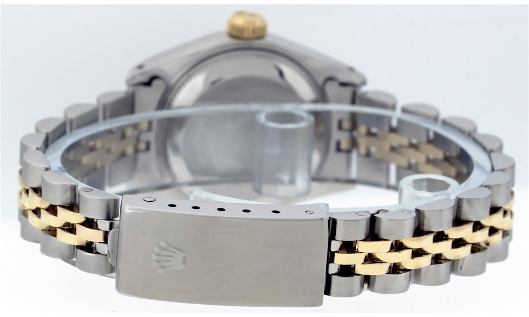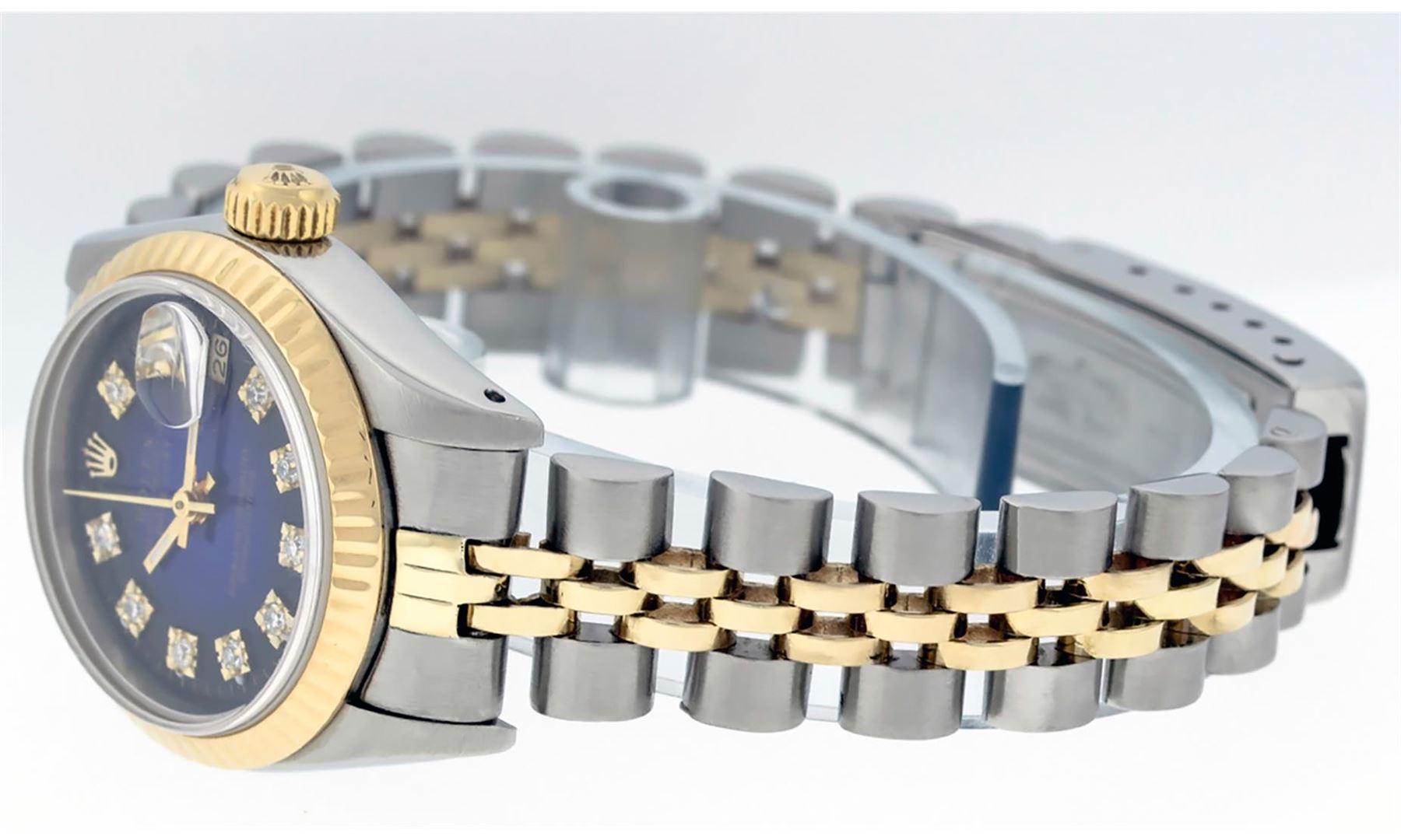 One Ladies Pre Owned Two Tone Rolex Datejust Polished, Serviced & Electronically Tested, Rolex Yellow Gold & Stainless Steel Case: 26mm, Rolex Yellow Gold Crown, Rolex Bezel: Yellow Gold Fluted Bezel. Custom Crystal: New Acrylic Cyclops Lens. Custom Hands: New Luminescent Hands. Rolex Movement: Automatic Winding Movement. Custom Dial: Refinished To Blue Vignette With Diamond Hour Markers And Dash Track, Diamond Count: 10 Diamonds, Color: G to H, Clarity: VS2-SI1. Date Window: 3 O'Clock Position Date Display, Model: Datejust. Condition: G-6 Extra Fine. Rolex Bracelet: Two Tone Yellow Gold & Stainless Steel Jubilee Band. Bright Polish. 6.0 Inch Length, Adjustable. Standard Clasp, With Rolex Logo. This Watch Has Been Serviced Time Tested And Is In Excellent Condition It Is Free Of All Scratches And Dents.