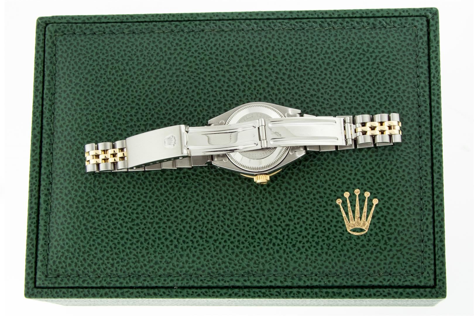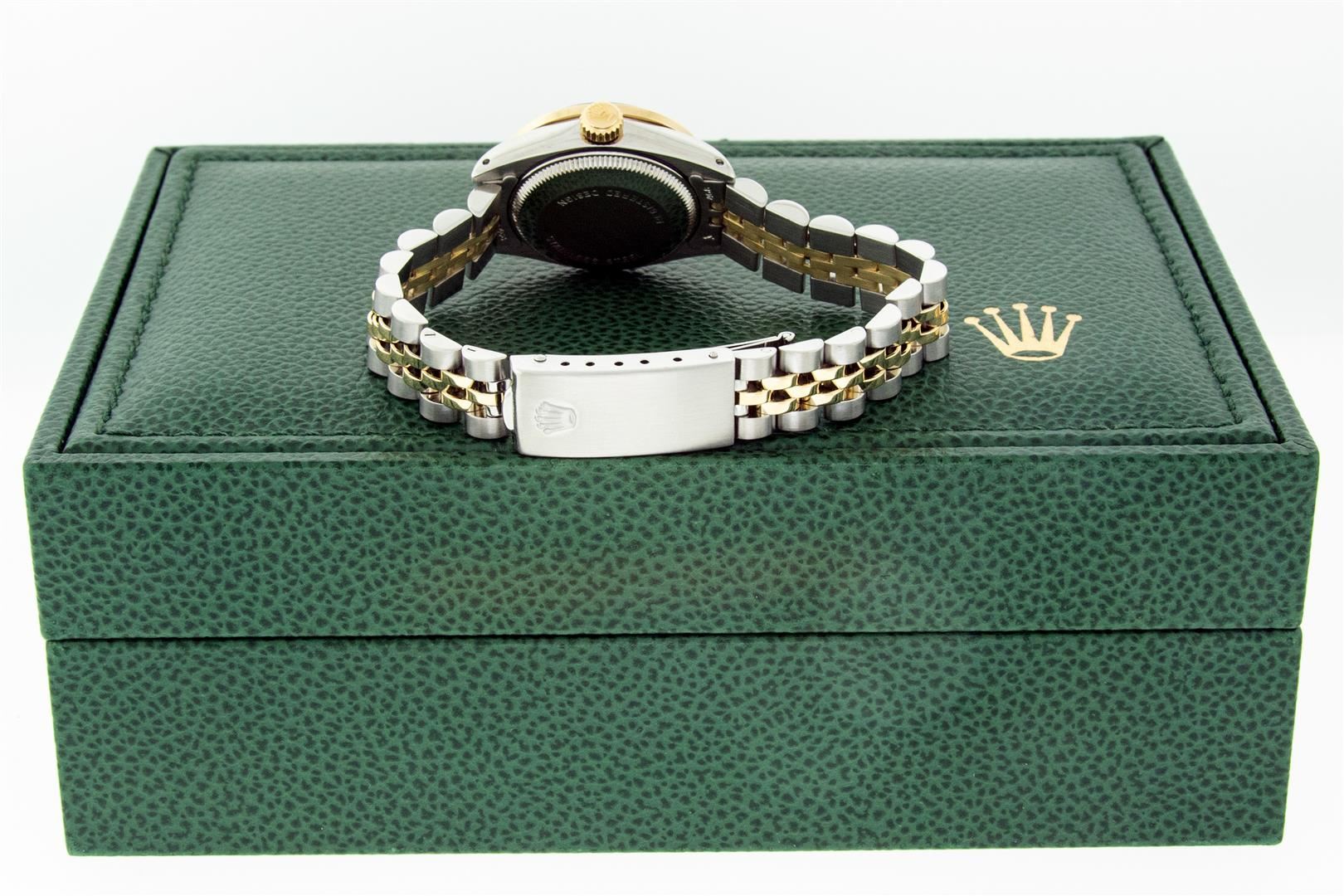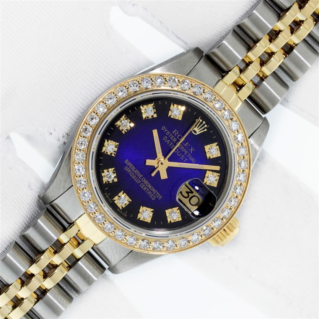 One Ladies Two Tone Rolex Datejust Polished, Serviced & Electronically Tested, Rolex Yellow Gold & Stainless Steel Case: 26mm, Rolex Yellow Gold Crown, Custom Bezel: New 18K 1ctw Yellow Gold Beadset Diamond Bezel, Diamond Count: 42 Diamonds, Total Weight 1.00 Carat, Clarity: SI-VS, Color: G to H. Custom Crystal: New Sapphire With Magnified Date Window. Custom Hands: New Luminescent Hands. Rolex Movement: Automatic Winding Movement. Custom Dial: Refinished To Blue Vignette With Added Diamond Hour Markers, Diamond Count: 10 Single Cut Diamonds in Dial, G To H In Color, VS Clarity. Date Window: 3 O'clock Position Date Display, Model: Datejust, Condition: G-6 Extra Fine. Rolex Bracelet: Two Tone Yellow Gold & Stainless Steel Jubilee Band. Bright Polish. 6.0 Inch Length, Adjustable. Standard Clasp, With Rolex Logo. This Pre Owned Watch Has Been Serviced Time Tested And Is In Excellent Condition It Is Free Of All Scratches And Dents. This Watch Comes With A Rolex Box.