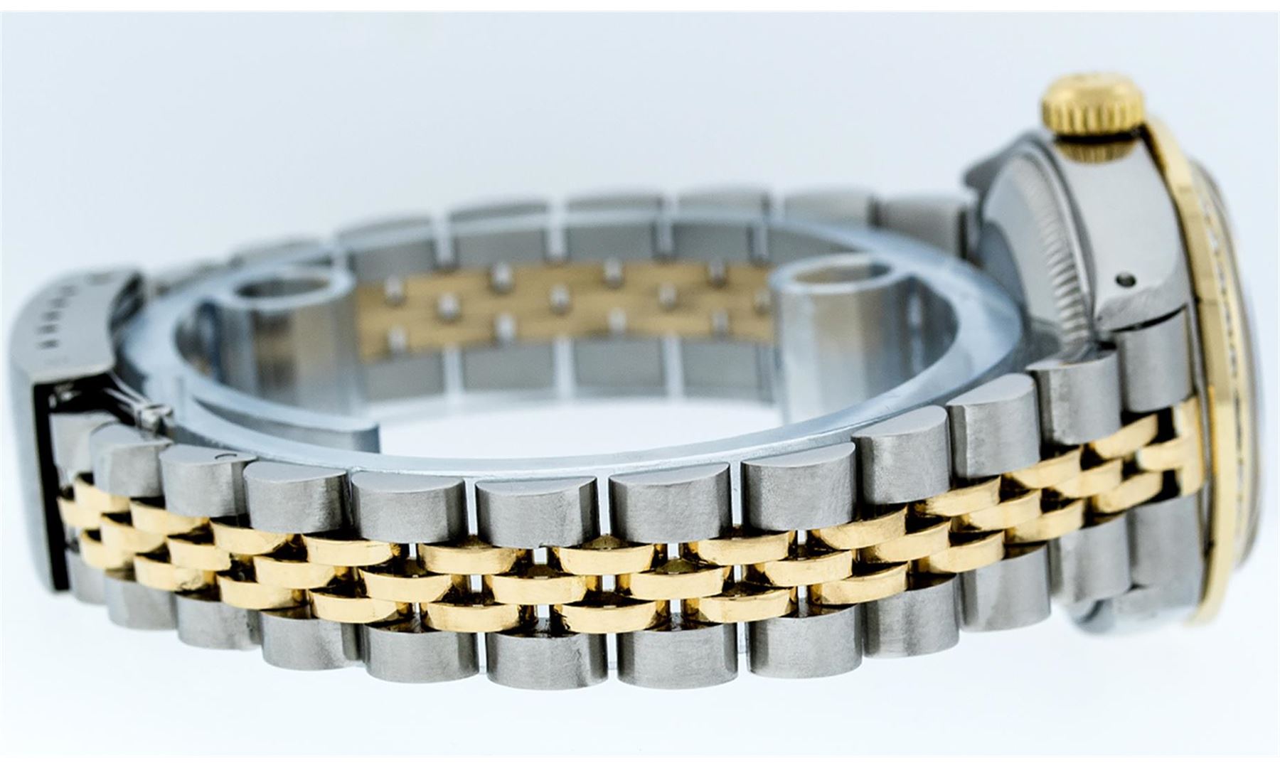 One Ladies 14K Two Tone Rolex Datejust Polished, Serviced & Electronically Tested, 14K Yellow Gold & Stainless Steel Case: 26mm, 14K Yellow Gold Crown, Custom Bezel: New 18K Yellow Gold Sapphire Beadset Diamond Bezel, Diamond + Gem Count: 28 Diamonds + 4 Sapphires Total Weight .70 Carat, Clarity: Si-VS, Color: G to H. Custom Crystal: New Synthetic Sapphire Cyclops Lens. Custom Hands: New Luminescent Hands. Movement: Automatic Winding Movement Caliber 2030. Custom Dial: Blue Vignette Dial Set With Diamond Hour Markers, Diamond Count: 10 Diamond in Dial, G To H In Color, SI-VS Clarity. Date Window: 3 O'Clock Position Date Display, Model: Datejust, Condition: G-6 Extra Fine. Bracelet: Two Tone 14K Yellow Gold & Stainless Steel Jubilee. Bright Polish. 6.0 Inch Length, Adjustable. Standard Clasp, With Rolex Logo. This Watch Has Been Serviced Time Tested And Is In Excellent Condition It Is Free Of All Scratches And Dents.