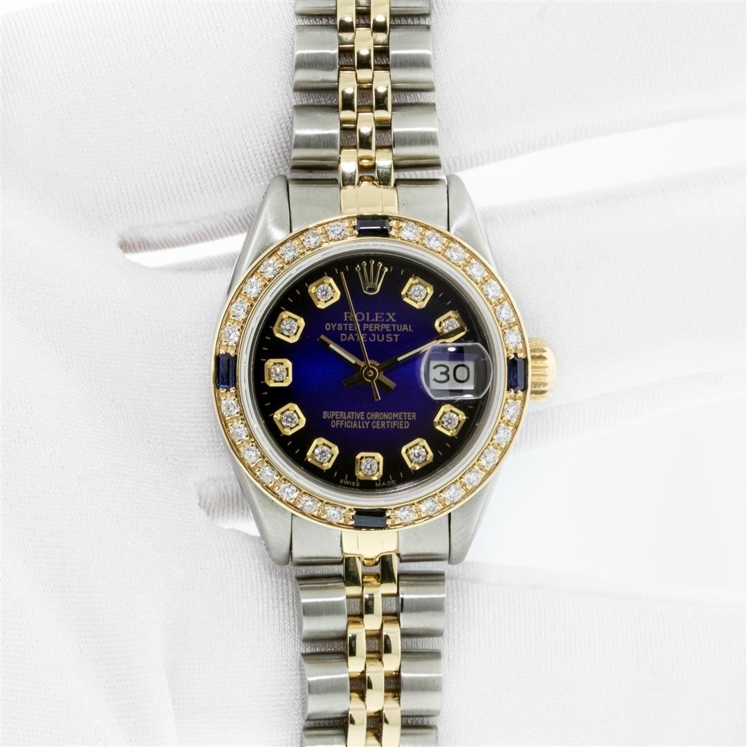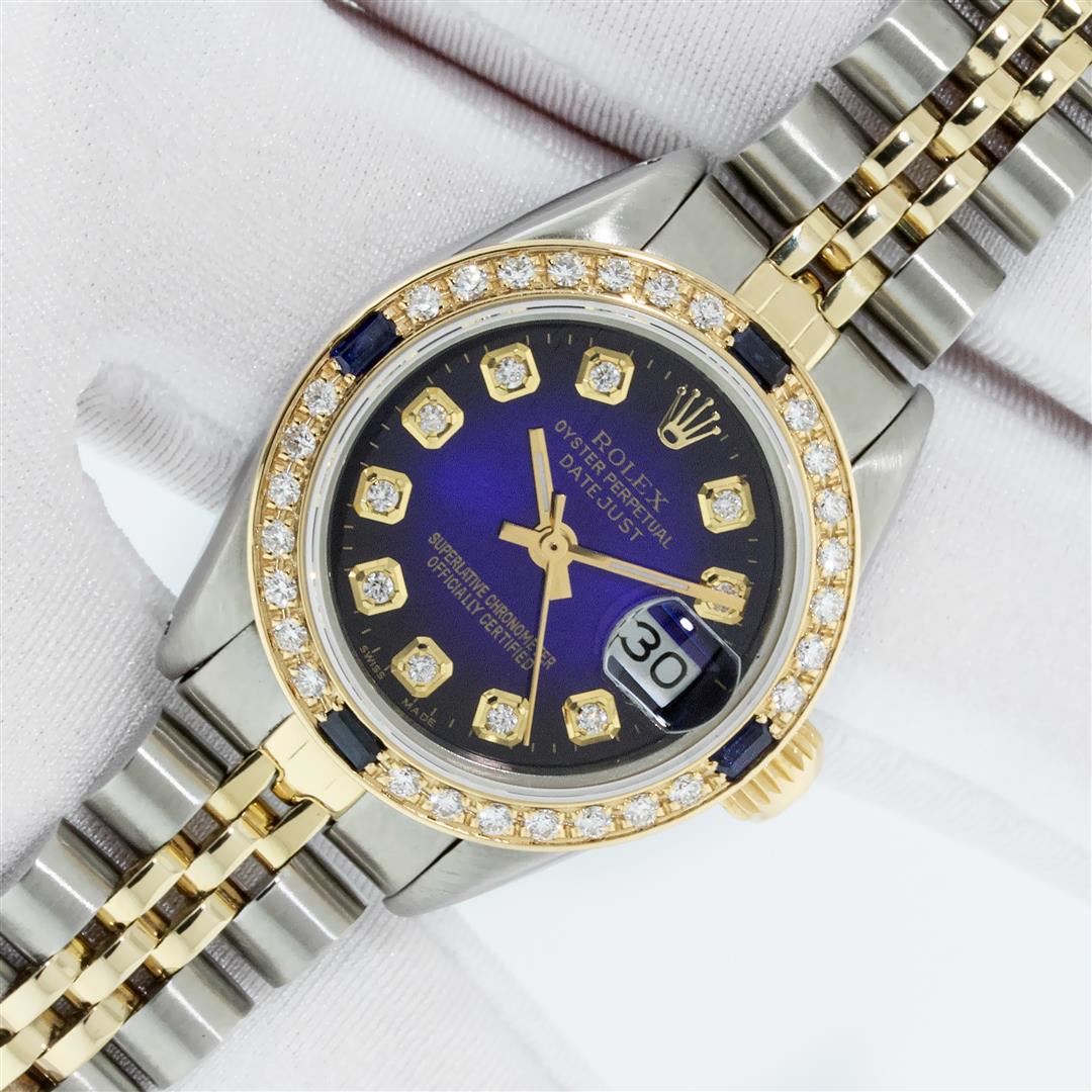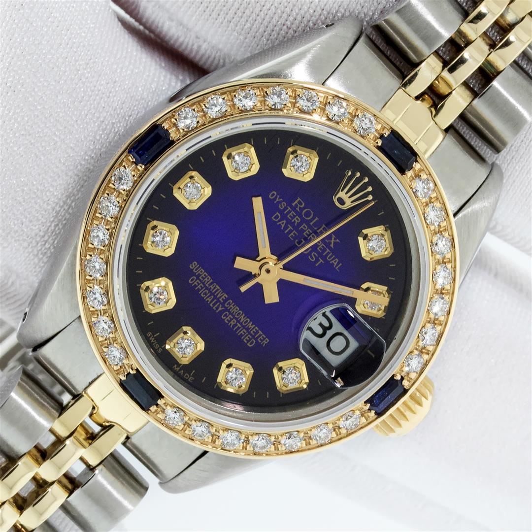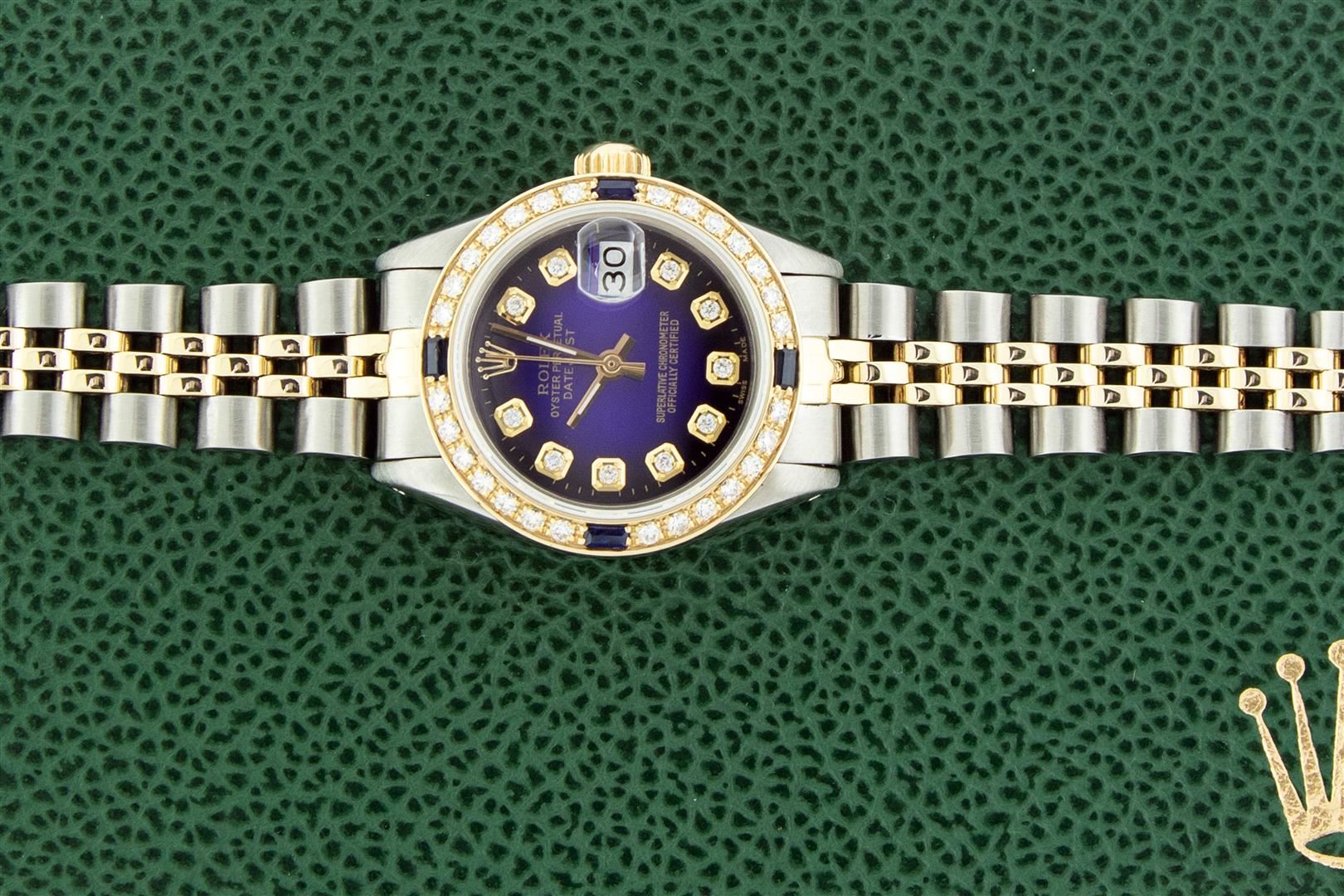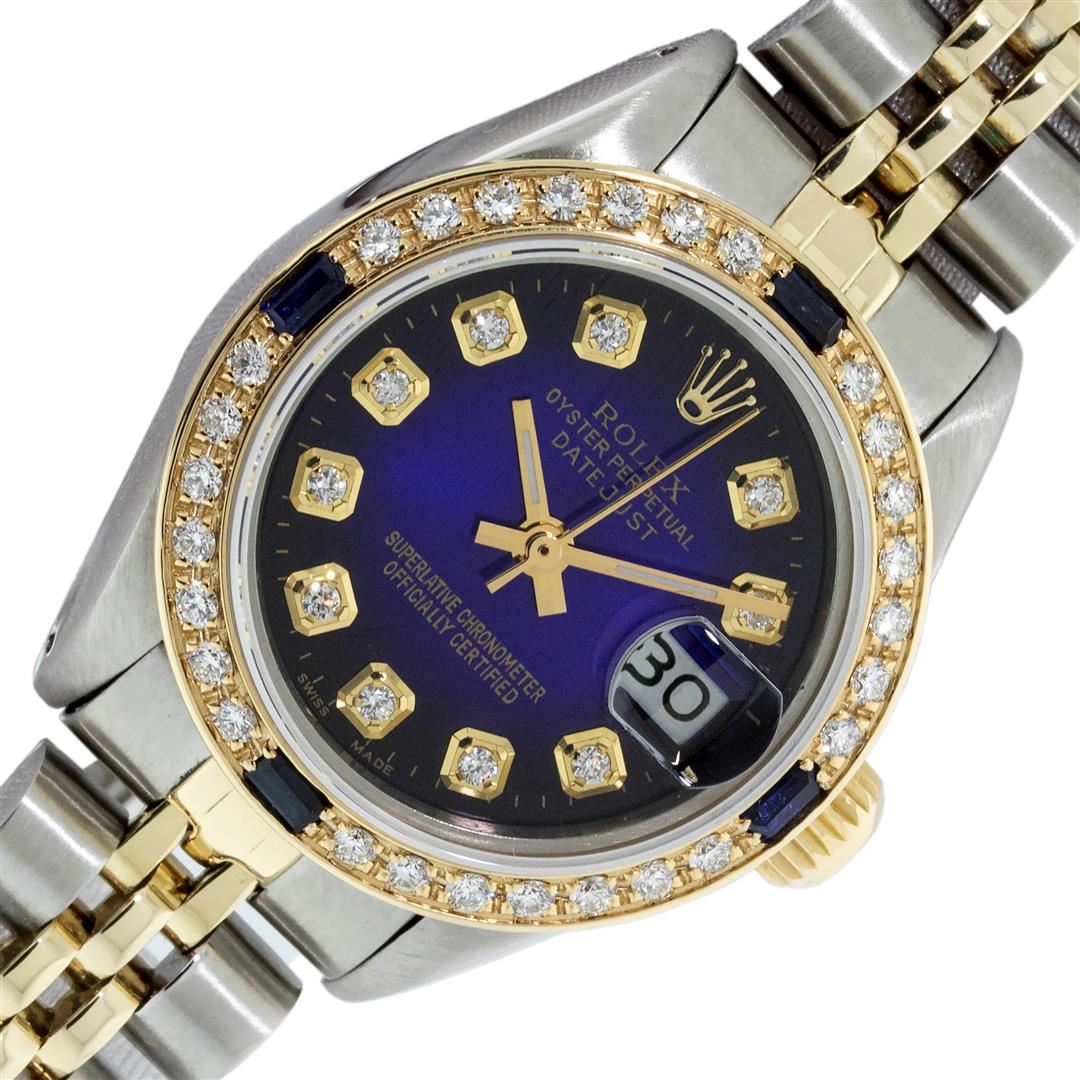 One Ladies Two Tone Rolex Datejust Polished, Serviced & Electronically Tested, Yellow Gold & Stainless Steel Case: 26mm, Rolex Yellow Gold Crown, Custom Bezel: New 18K Yellow Gold Sapphire Beadset Diamond Bezel, Diamond + Gem Count: 28 Diamonds + 4 Sapphires, Total Weight .70 Carat, Clarity: SI-VS, Color: G to H. Custom Crystal: New Sapphire With Magnified Date Window. Custom Hands: New Luminescent Hands. Rolex Movement: Automatic Winding Movement. Custom Dial: Refinished To Blue Vignette Set With Added Diamond Hour Markers, Diamond Count: 10 Diamonds in Dial, G To H In Color, SI-VS Clarity. Date Window: 3 O'clock Position Date Display, Model: Datejust, Condition: G-6 Extra Fine. Rolex Bracelet: Two Tone Yellow Gold & Stainless Steel Jubilee Band. Bright Polish. 6.0 Inch Length, Adjustable. Standard Clasp, With Rolex Logo. This Pre Owned Watch Has Been Serviced Time Tested And Is In Excellent Condition It Is Free Of All Scratches And Dents. This Watch Comes With A Rolex Box.