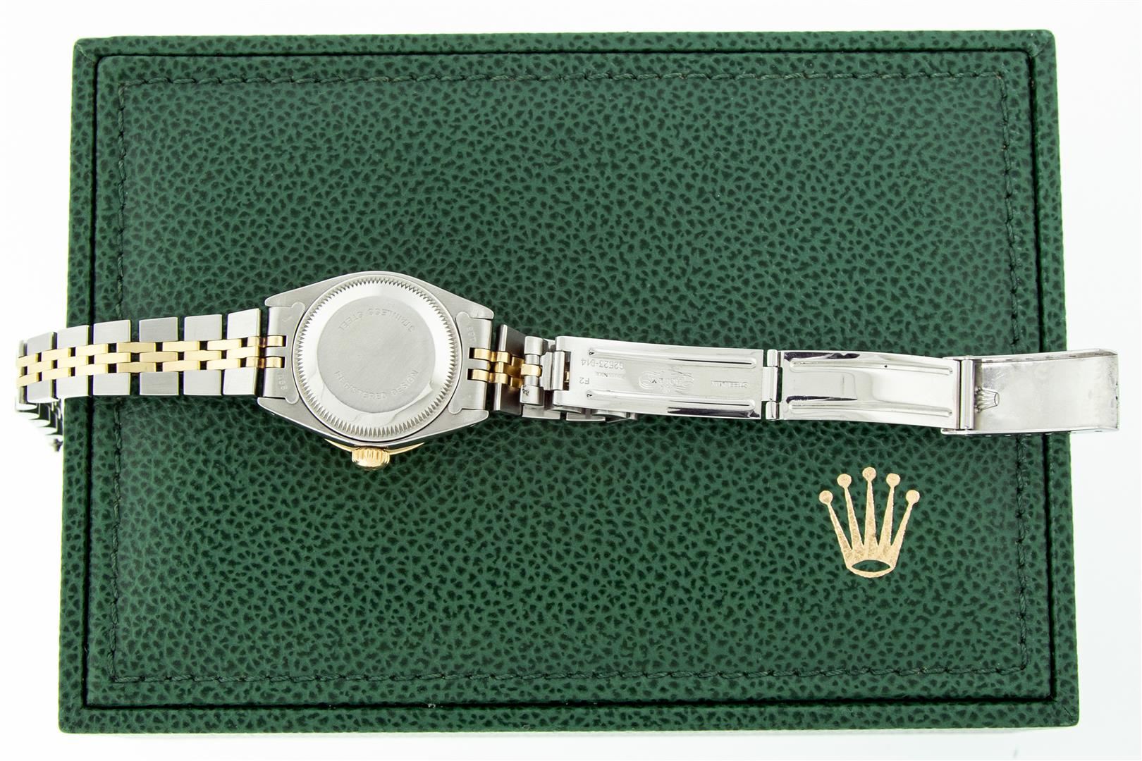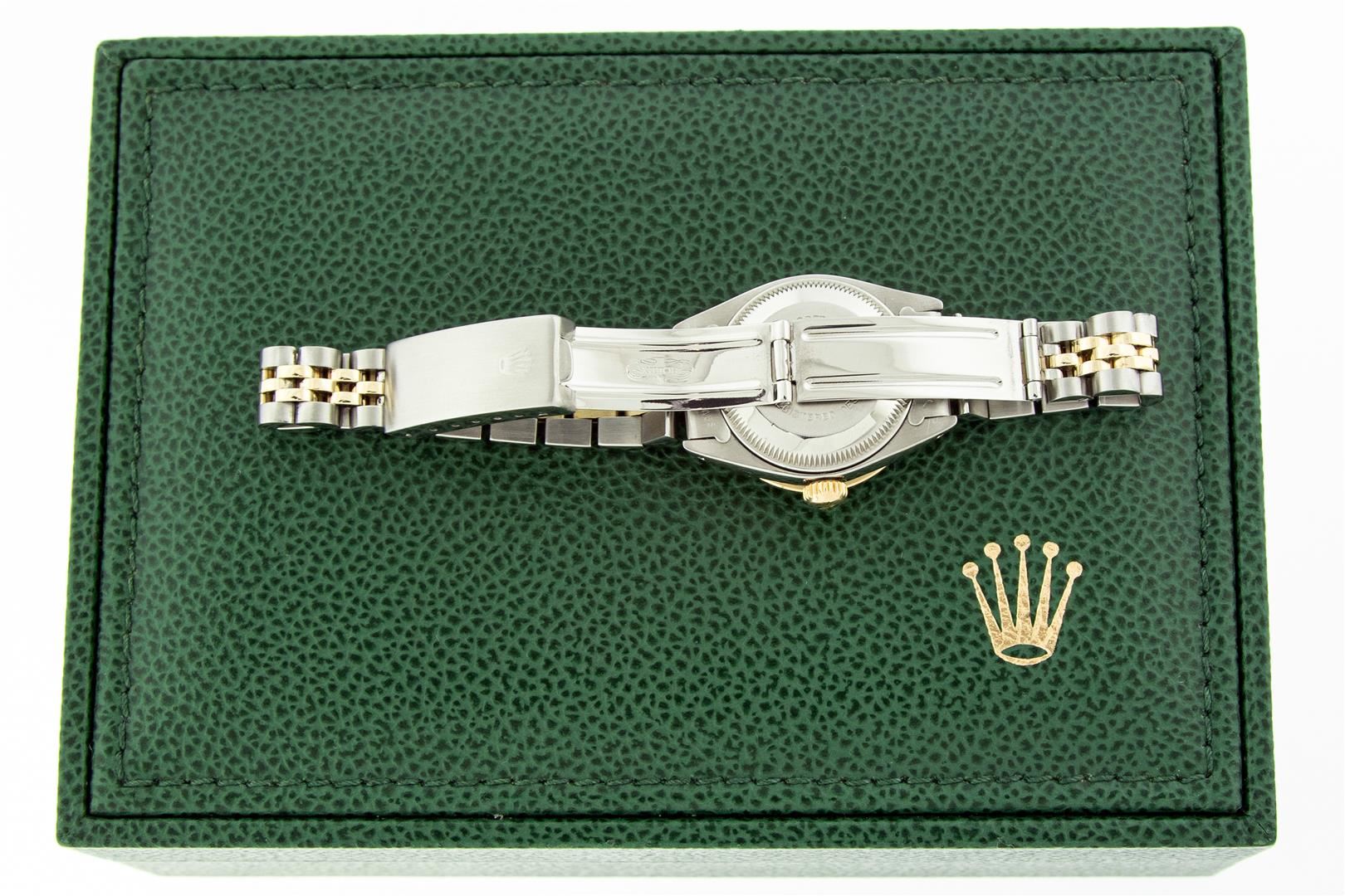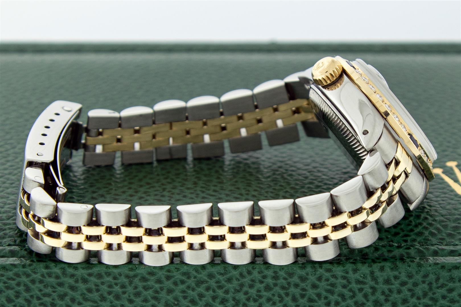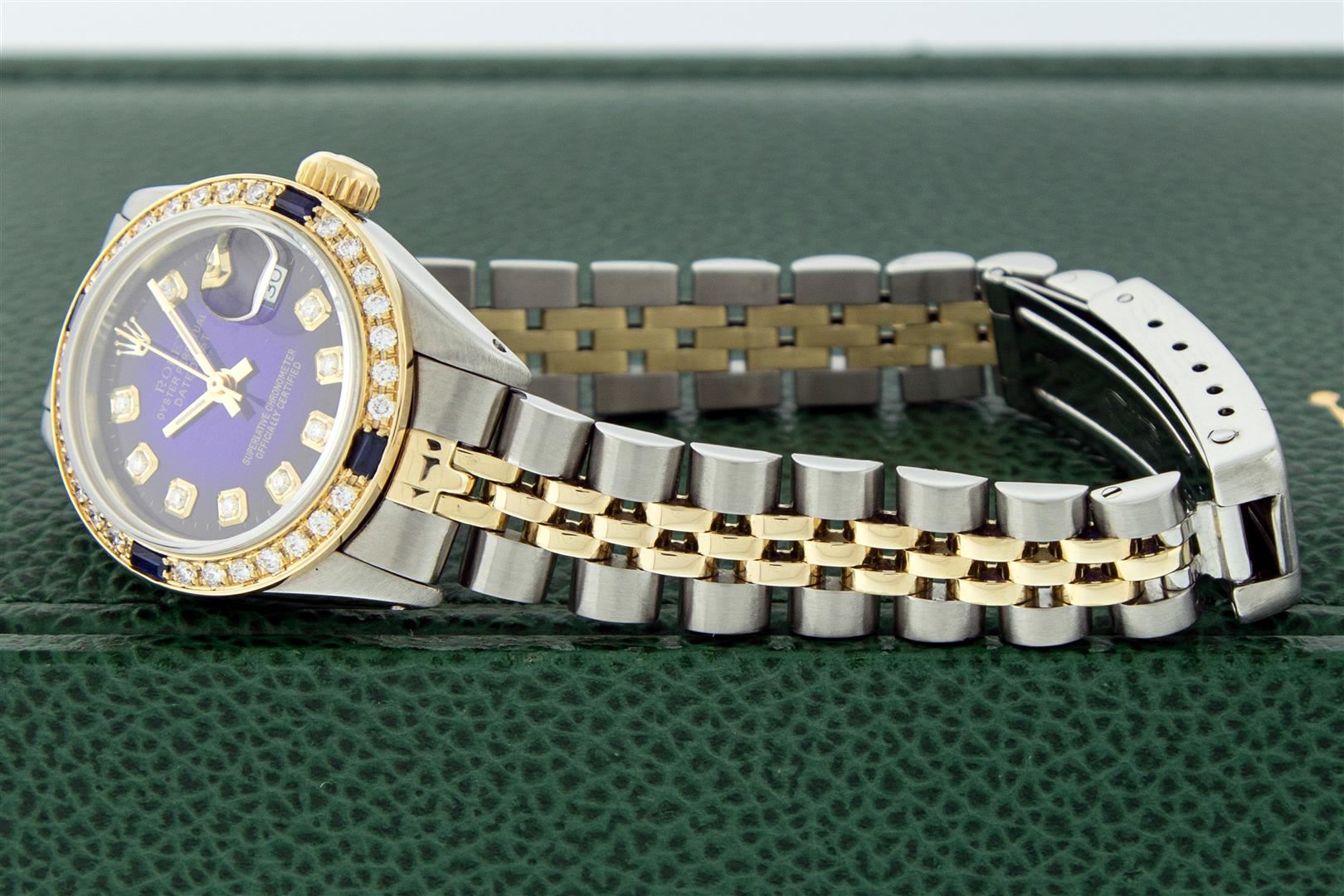 One Ladies Two Tone Rolex Datejust Polished, Serviced & Electronically Tested, Yellow Gold & Stainless Steel Case: 26mm, Rolex Yellow Gold Crown, Custom Bezel: New 18K Yellow Gold Sapphire Beadset Diamond Bezel, Diamond + Gem Count: 28 Diamonds + 4 Sapphires, Total Weight .70 Carat, Clarity: SI-VS, Color: G to H. Custom Crystal: New Sapphire With Magnified Date Window. Custom Hands: New Luminescent Hands. Rolex Movement: Automatic Winding Movement. Custom Dial: Refinished To Blue Vignette Set With Added Diamond Hour Markers, Diamond Count: 10 Diamonds in Dial, G To H In Color, SI-VS Clarity. Date Window: 3 O'clock Position Date Display, Model: Datejust, Condition: G-6 Extra Fine. Rolex Bracelet: Two Tone Yellow Gold & Stainless Steel Jubilee Band. Bright Polish. 6.0 Inch Length, Adjustable. Standard Clasp, With Rolex Logo. This Pre Owned Watch Has Been Serviced Time Tested And Is In Excellent Condition It Is Free Of All Scratches And Dents. This Watch Comes With A Rolex Box.
