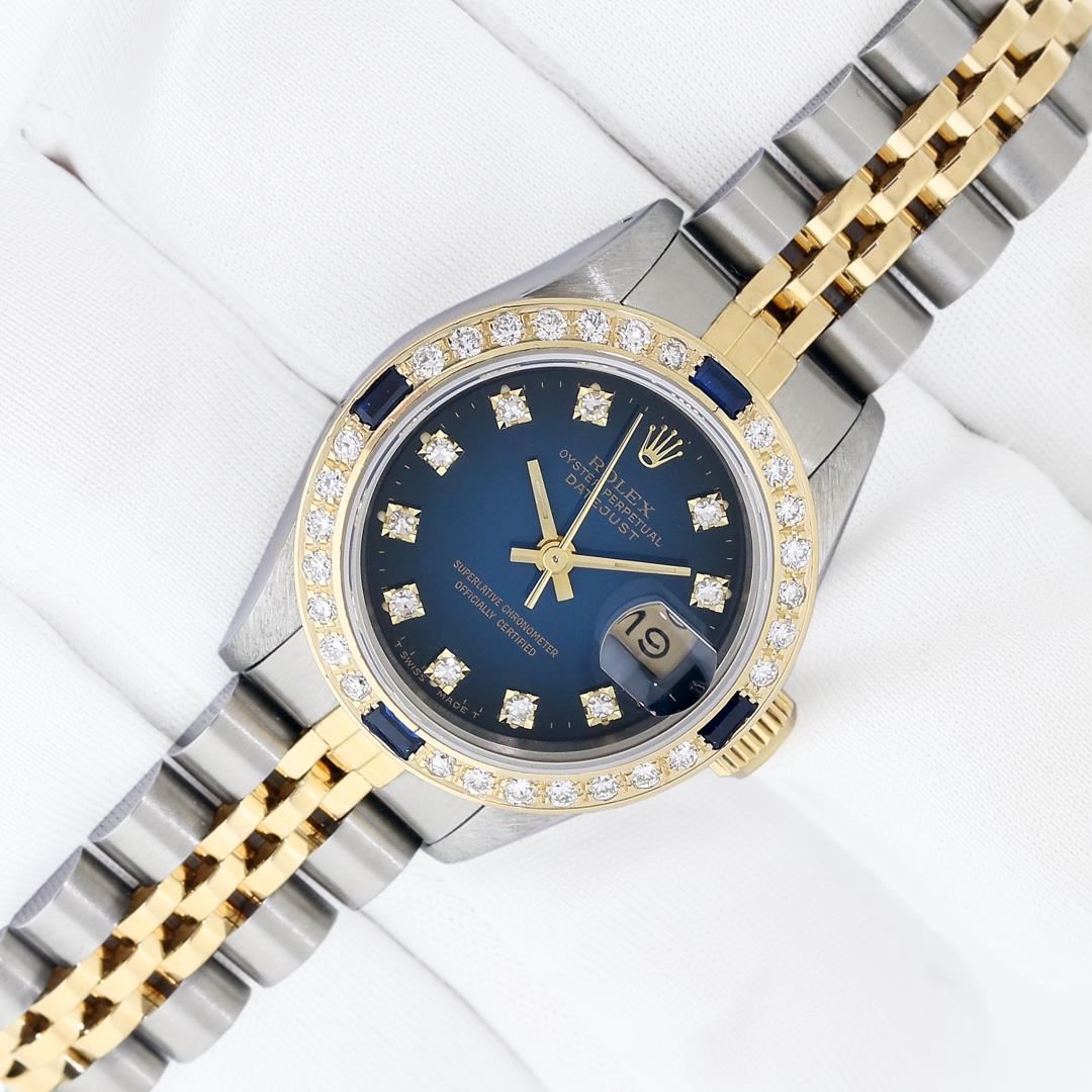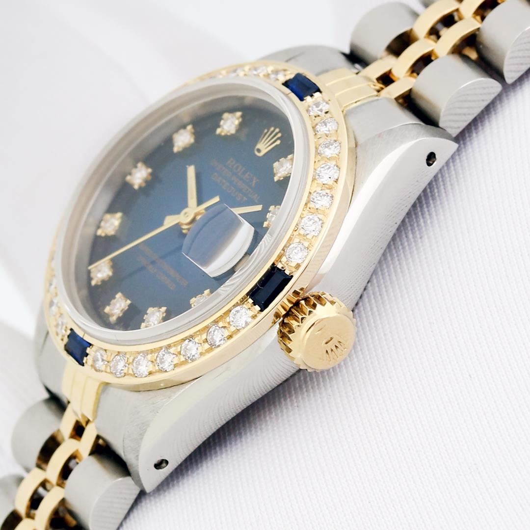 One Ladies Quickset Pre Owned Two Tone 18K Yellow Gold & Stainless Steel Rolex Datejust Polished, Serviced & Electronically Tested, Rolex Yellow Gold & Stainless Steel Case: 26mm, Rolex Yellow Gold Crown, Custom Bezel: New 18K Yellow Gold Sapphire Diamond Bezel, Diamond Count: 28 Diamonds + 4 Sapphire, Color: G To H, Clarity: SI - VS. Custom Crystal: New Sapphire Crystal With Date Window. Hands: Lumi Hands. Rolex Movement: Quickset Automatic Winding Movement 2135. Custom Dial: Custom Blue Vignette With Aftermarket Added Diamond Hour Markers And Dash Track, Diamond Count: 10 Diamonds In Dial. Date Window: 3 O'Clock Position Date Display, Model: Quickset Datejust. Condition: G-6 Extra Fine. Rolex Bracelet: Two Tone 18K Yellow Gold & Stainless Steel Jubilee Band. Bright Polish. 6.0 Inch Length, Adjustable. Standard Clasp, With Rolex Logo. This Watch Has Been Serviced Time Tested And Is In Excellent Condition It Is Free Of All Scratches And Dents.
