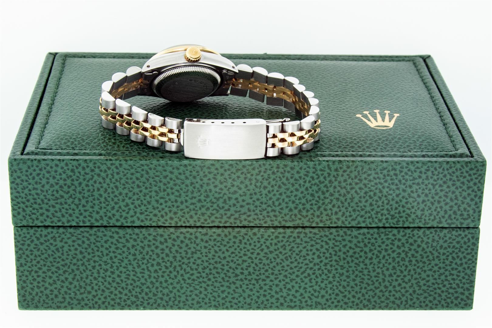 One Ladies Two Tone Rolex Datejust Polished, Serviced & Electronically Tested, Yellow Gold & Stainless Steel Case: 26mm, Rolex Yellow Gold Crown, Custom Bezel: New 18K New Yellow Gold Beadset Diamond Bezel, Diamond Count: 32 Diamonds On Bezel, Total Bezel Weight .70 Carat, Clarity: SI-VS, Color: G to H. Custom Crystal: New Sapphire With Magnified Date Window. Custom Hands: New Luminescent Hands. Rolex Movement: Automatic Winding Movement. Custom Dial: Refinished To Champagne With Added Diamond Hour Markers, Diamond Count: 43 Diamonds In Dial, Clarity: SI-VS, Color: G to H. Date Window: 3 O'clock Position Date Display, Model: Datejust. Condition: G-6 Extra Fine. Rolex Bracelet: Two Tone Yellow Gold & Stainless Steel Jubilee Band. Bright Polish. 6.0 Inch Length, Adjustable. Standard Clasp, With Rolex Logo. This Pre Owned Watch Has Been Serviced Time Tested And Is In Excellent Condition It Is Free Of All Scratches And Dents. This Watch Comes With A Rolex Box.