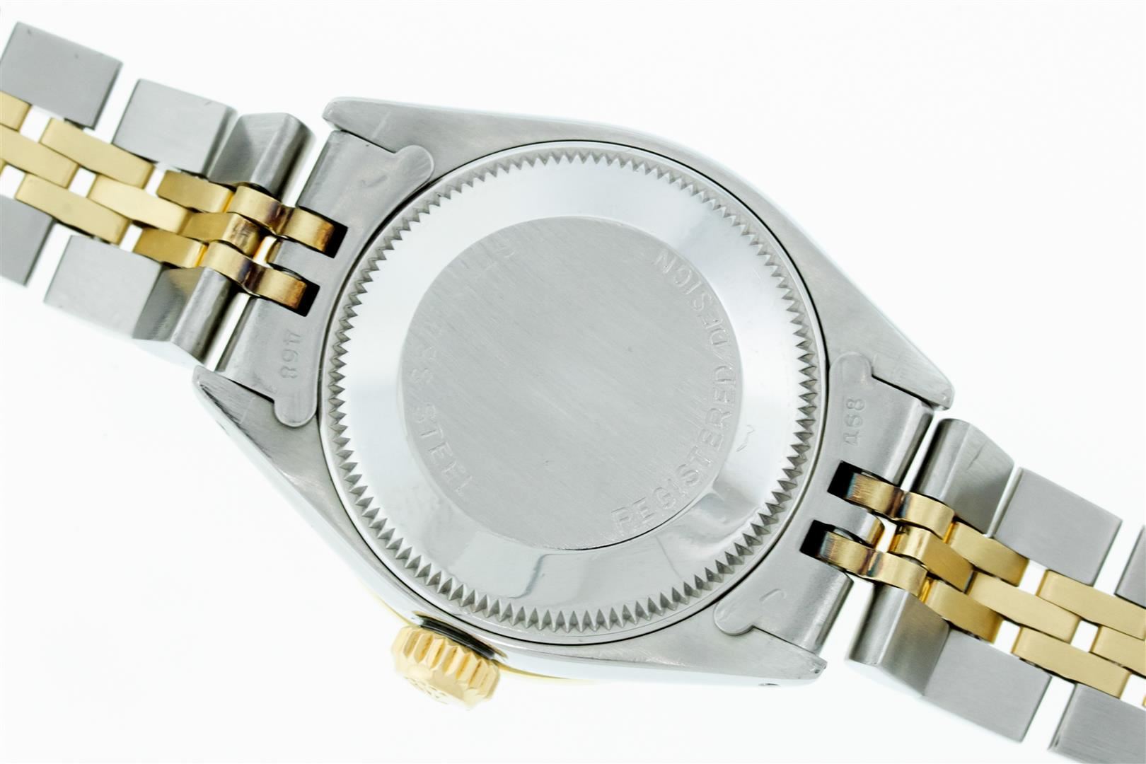 One Ladies Two Tone Rolex Datejust Polished, Serviced & Electronically Tested, Rolex Yellow Gold & Stainless Steel Case: 26mm, Rolex Yellow Gold Crown, Custom Bezel: New 18K Yellow Gold Beadset Diamond Bezel, Diamond Count: 32 Diamonds, Total Weight .70 Carat, Clarity: Si-VS, Color: G to H. Custom Crystal: New Sapphire With Magnified Date Window. Custom Hands: New Gold Hands. Rolex Movement: Automatic Winding Movement. Custom Dial: Refinished To Champagne With Added Diamonds, Diamond Count: 10 Single Cut Diamonds in Dial, G To H In Color, VS Clarity. Date Window: 3 O'clock Position Date Display, Model: Datejust, Condition: G-6 Extra Fine. Rolex Bracelet: Two Tone Yellow Gold & Stainless Steel Jubilee Band. Bright Polish. 6.0 Inch Length, Adjustable. Standard Clasp, With Rolex Logo. This Pre Owned Watch Has Been Serviced Time Tested And Is In Excellent Condition It Is Free Of All Scratches And Dents.
