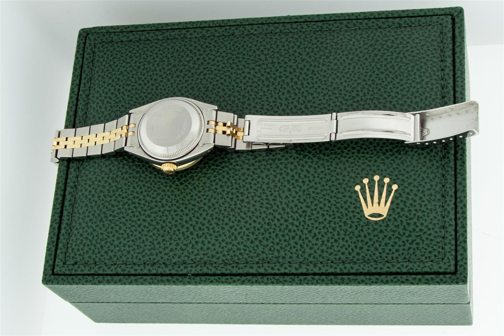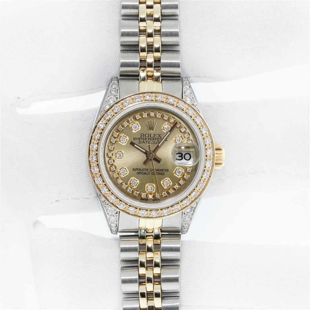 One Ladies Two Tone Rolex Datejust Polished, Serviced & Electronically Tested, Rolex Yellow Gold & Stainless Steel Case: 26mm, Rolex Yellow Gold Crown, Custom Diamond Lugs: 24 Diamonds On Lugs, Clarity: SI-VS, Color: G to H, Clarity SI-VS. Custom Bezel: New 18K Yellow Gold Beadset Diamond Bezel, Diamond Count: 32 Diamonds, Total Weight .70 Carat, Clarity: SI-VS, Color: G to H. Custom Crystal: New Sapphire With Magnified Date Window. Custom Hands: New Luminescent Hands. Rolex Movement: Automatic Winding Movement. Custom Dial: Refinished To Champagne With Added Diamond Hour Markers, Diamond Count: 43 Diamonds In Dial, Clarity: SI-VS, Color: G to H. Date Window: 3 O'clock Position Date Display, Model: Datejust. Condition: G-6 Extra Fine. Rolex Bracelet: Two Tone Yellow Gold & Stainless Steel Jubilee Band. Bright Polish. 6.0 Inch Length, Adjustable. Standard Clasp, With Rolex Logo. This Pre Owned Watch Has Been Serviced Time Tested And Is In Excellent Condition It Is Free Of All Scratches And Dents. This Watch Comes With A Rolex Box.