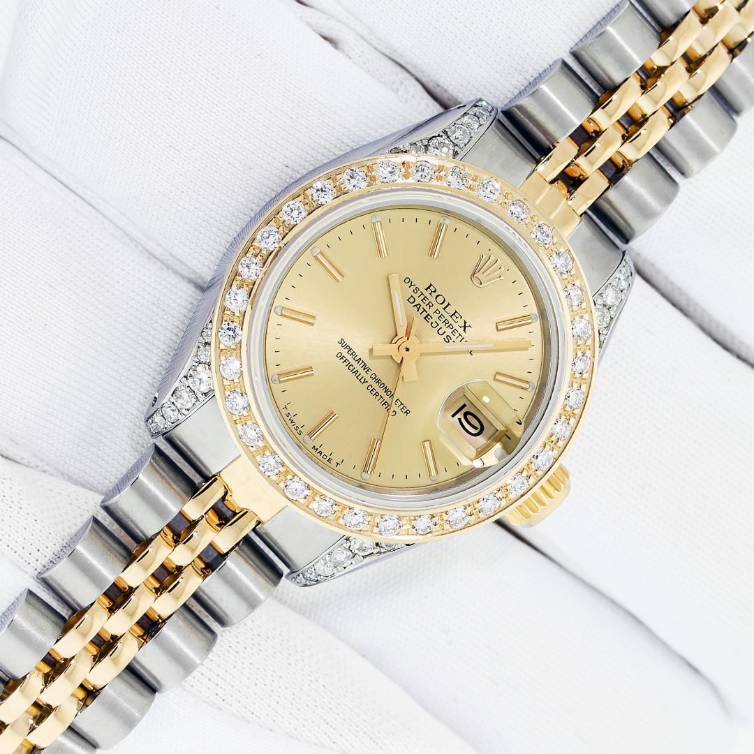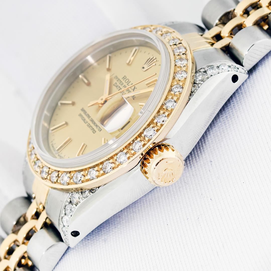 Rolex Ladies Pre Owned Quickset 18K Yellow Gold and Stainless Steel Two Tone Wristwatch Polished Bright with Satin Finish, Serviced & Electronically Tested, Rolex Stainless Steel Case: 26mm, Custom Diamond Lugs: Added Diamonds On Lugs, Diamond Count: 24 Diamonds On Lugs, Color: G To H, Clarity: SI-VS. Rolex Yellow Gold Crown, Custom Bezel: New 18K Yellow Gold Beadset Diamond Bezel, Diamond Count: 32 Diamonds On Bezel. Custom Crystal: New Sapphire With Magnified Date Window. Custom Hands: New Hands. Rolex Movement: Automatic Winding Movement. Rolex Dial: Champagne Dial With Dash Track & Lumi Dots, Date Window: 3 O'Clock Position Date Display, Model: Quickset Datejust, Condition: G-6 Extra Fine. Rolex Bracelet: Stainless Steel and 18K Yellow Gold Jubilee Band. Bright Polish & Satin Finish. 6.0 Inch Length, Adjustable. Standard Clasp, With Rolex Logo. This Watch Has Been Serviced Time Tested And Is In Excellent Condition It Is Free Of All Scratches And Dents.