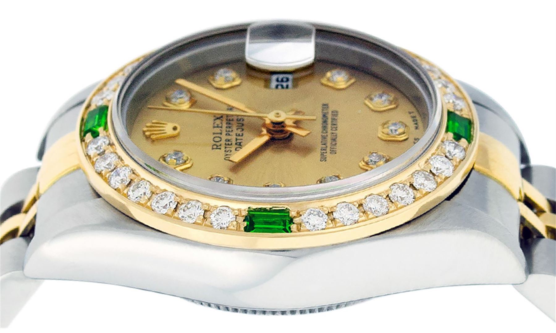 One Ladies 18K Two Tone Rolex Datejust Polished, Serviced & Electronically Tested, 18K Yellow Gold & Stainless Steel Case: 26mm, 18K Yellow Gold Crown, Custom Bezel: New 18K Yellow Gold Emerald Beadset Diamond Bezel, Diamond + Gem Count: 28 Diamonds + 4 Emeralds Total Weight .70 Carat, Clarity: SI-VS, Color: G to H. Custom Crystal: New Scratch Resistant Synthetic Sapphire Cyclops Lens. Custom Hands: New Luminescent Hands. Movement: Quickset Automatic Winding Movement. Custom Dial: Champagne Dial Set With Diamond Hour Markers, Diamond Count: 10 Single Cut VS Diamonds in Dial, G To H In Color, VS Clarity. Date Window: 3 O'Clock Position Date Display, Model: Datejust, Condition: G-6 Extra Fine. Bracelet: Two Tone 18K Yellow Gold & Stainless Steel Jubilee. Bright Polish. 6.0 Inch Length, Adjustable. Standard Clasp, With Rolex Logo. This Watch Has Been Serviced Time Tested And Is In Excellent Condition It Is Free Of All Scratches And Dents.