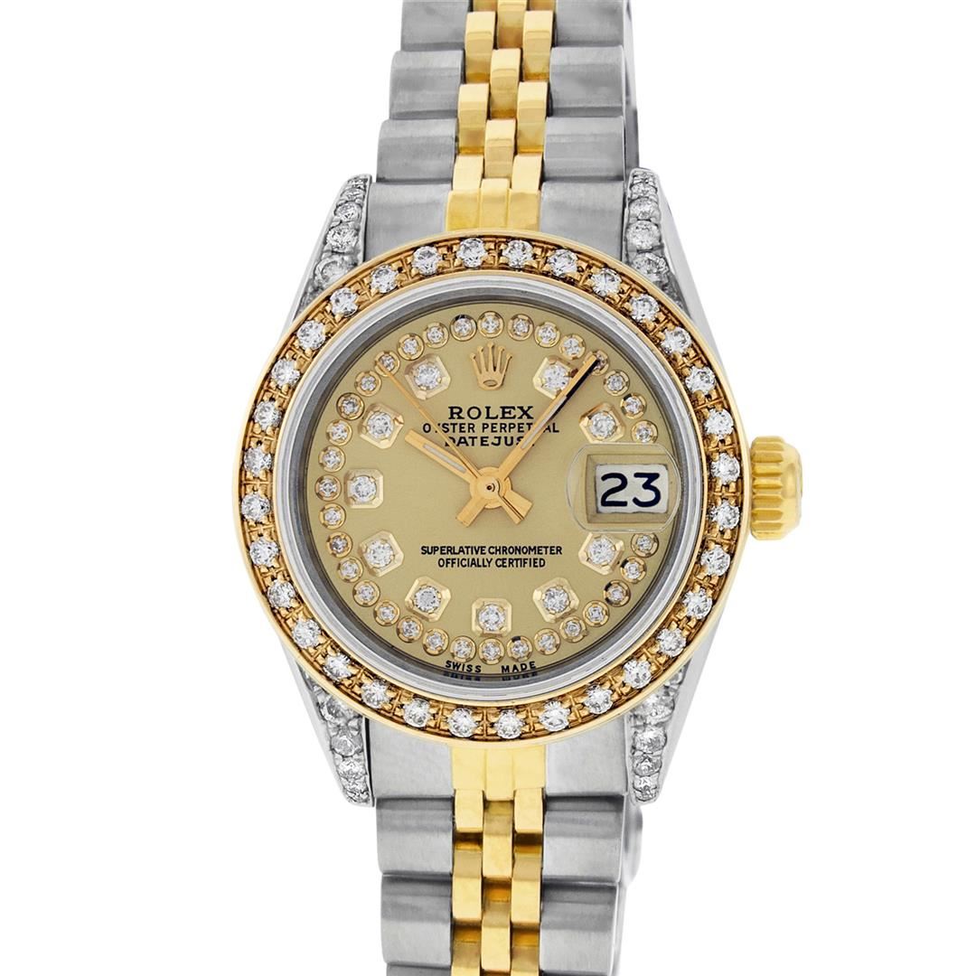 One Ladies Two Tone Rolex Datejust Polished, Serviced & Electronically Tested, Yellow Gold & Stainless Steel Case: 26mm, Yellow Gold Crown, Diamond Lugs: 24 Diamonds On Lugs, Clarity: SI-VS, Color: G to H, Clarity SI-VS. Custom Bezel: New 18K Yellow Gold Beadset Diamond Bezel, Diamond Count: 32 Diamonds, Total Weight .70 Carat, Clarity: SI-VS, Color: G to H. Custom Crystal: New Synthetic Sapphire Cyclops Lens. Custom Hands: New Luminescent Hands. Movement: Automatic Winding Movement. Custom Dial: Champagne With Diamond Hour Markers, Diamond Count: 43 Diamonds In Dial, Clarity: SI-VS, Color: G to H. Date Window: 3 O'Clock Position Date Display, Model: Datejust. Condition: G-6 Extra Fine. Bracelet: Two Tone Yellow Gold & Stainless Steel Jubilee. Bright Polish. 6.0 Inch Length, Adjustable. Standard Clasp, With Rolex Logo. This Watch Has Been Serviced Time Tested And Is In Excellent Condition It Is Free Of All Scratches And Dents.